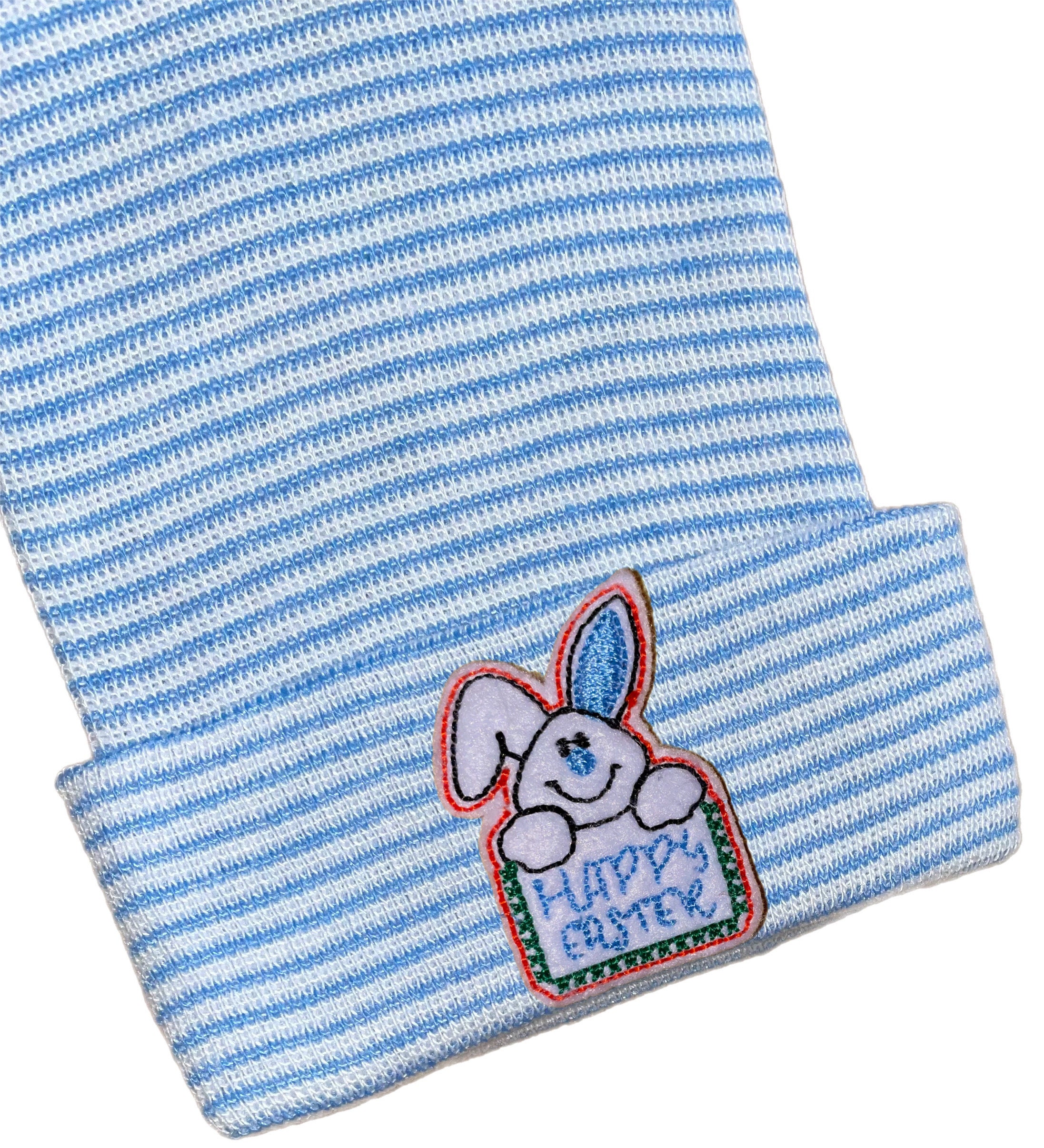 This listing is for an adorable newborn hospital hat with blue ear bunny. You choose hat color.