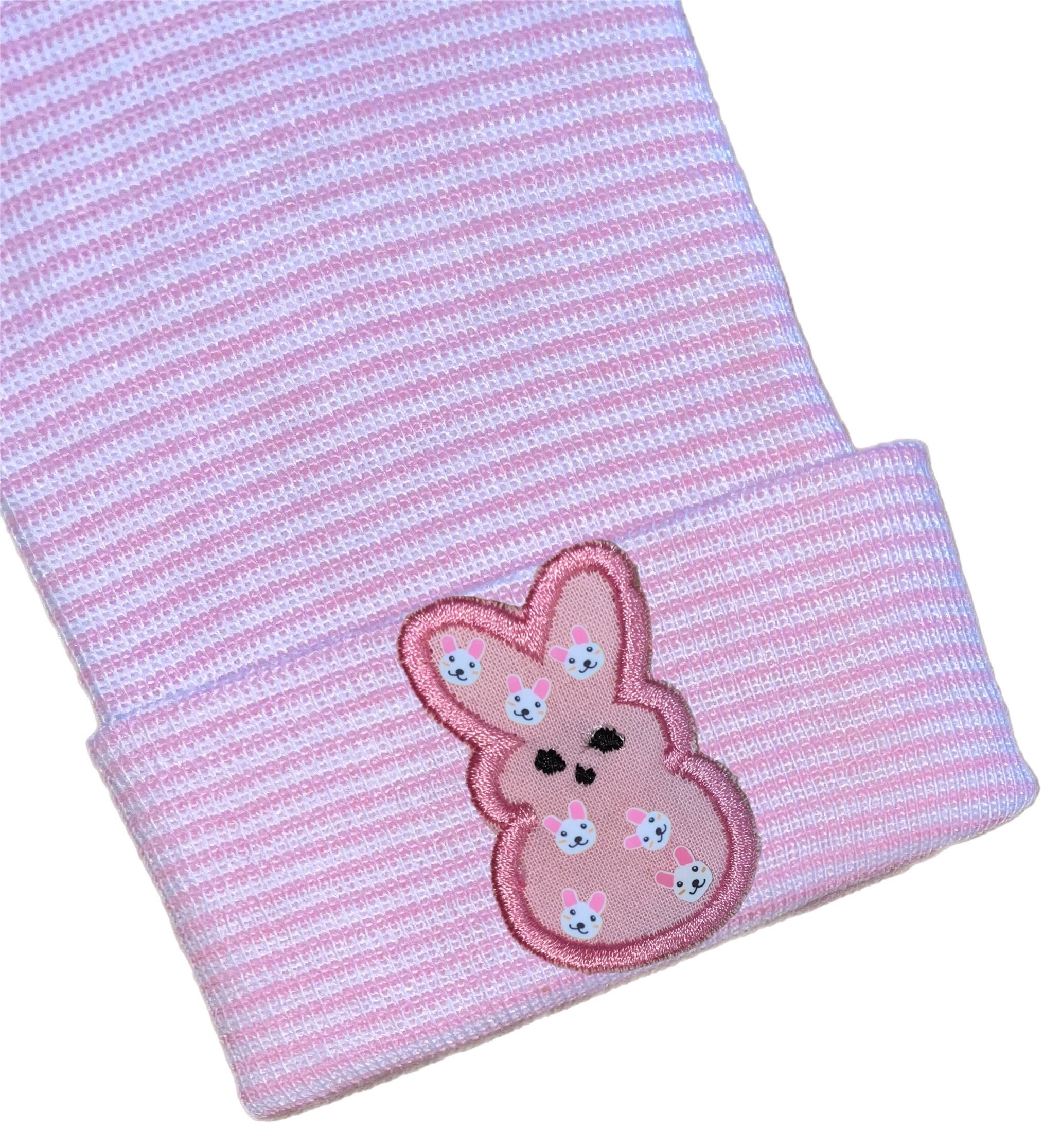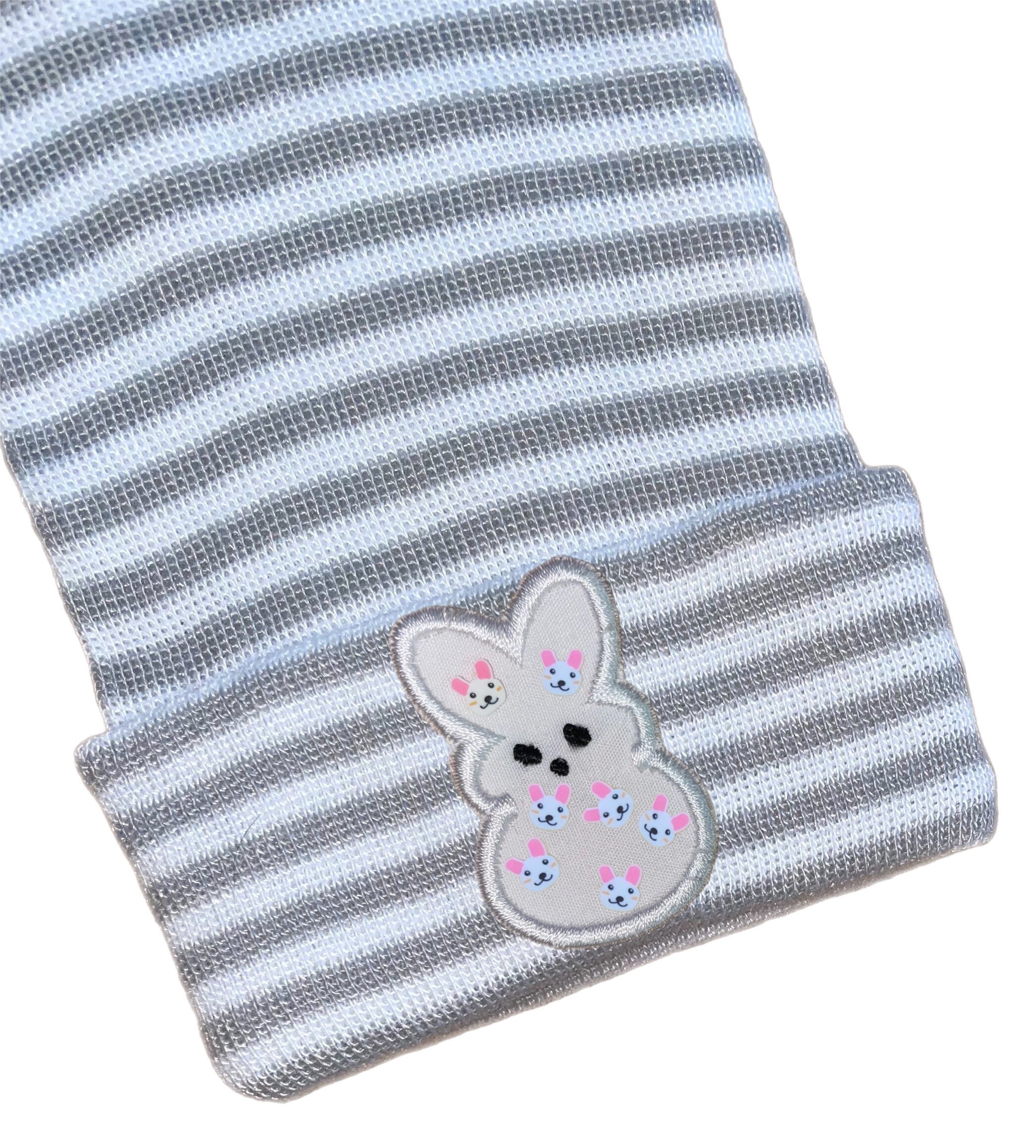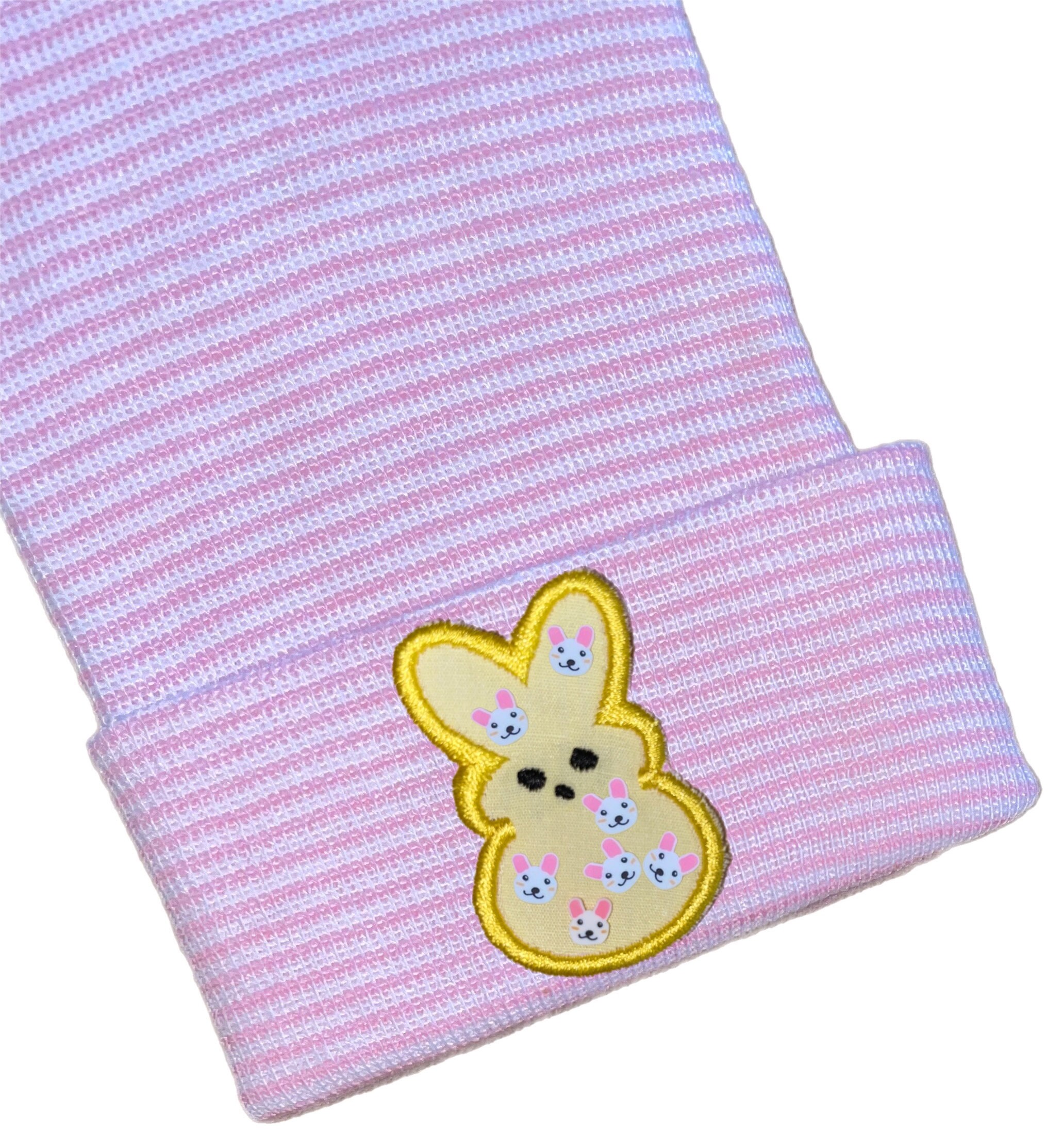 This listing is for an adorable newborn hospital hat with bunny on it in your choice of pink, blue, white or yellow. You choose hat color too.