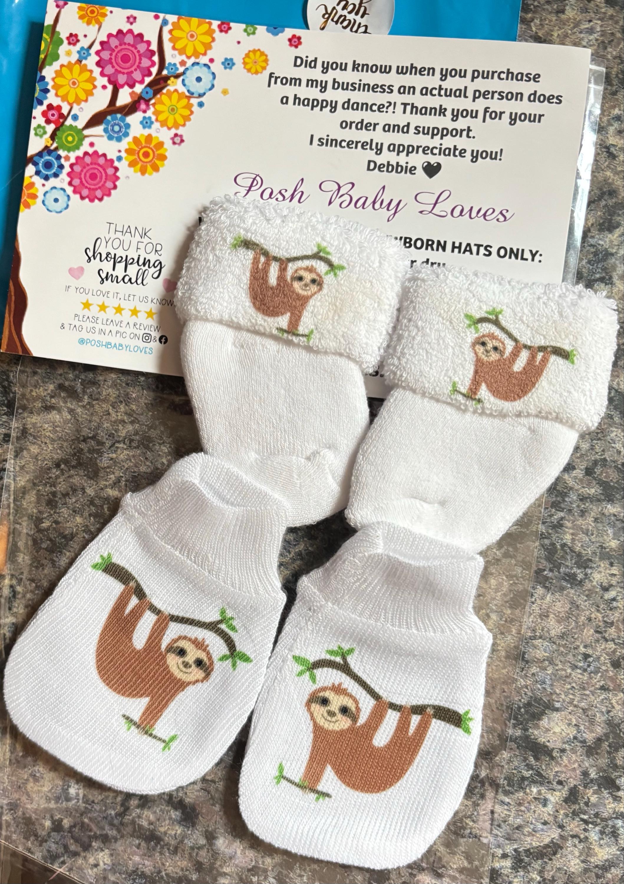 MITTENS & Sock Option Newborn no scratch Mittens With Sloth. Boy or Girl! Perfect Shower / Newborn Gift! Every Baby Needs. Cute Baby Gift!