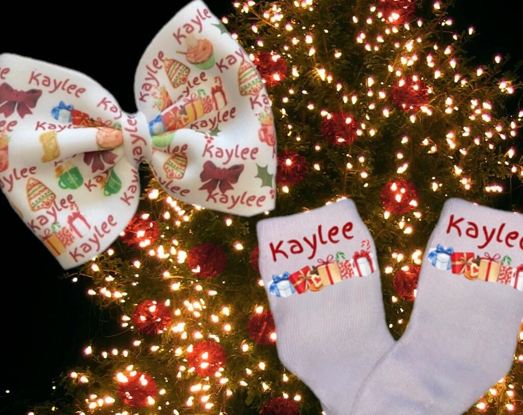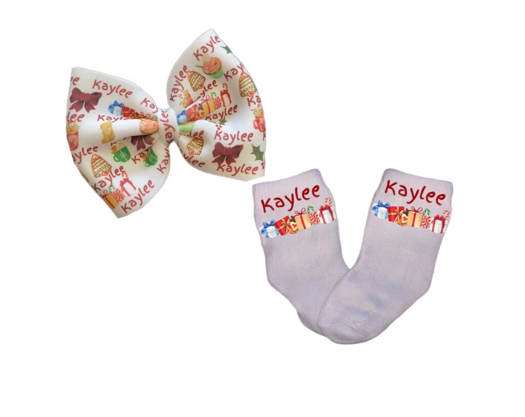 I am so excited to be able to offer these custom bows with name on them and matching socks. You select bow on nylon headband or alligator clip at checkout  ♥ A Posh Baby Loves exclusive!  Great gift. Cute for pictures.