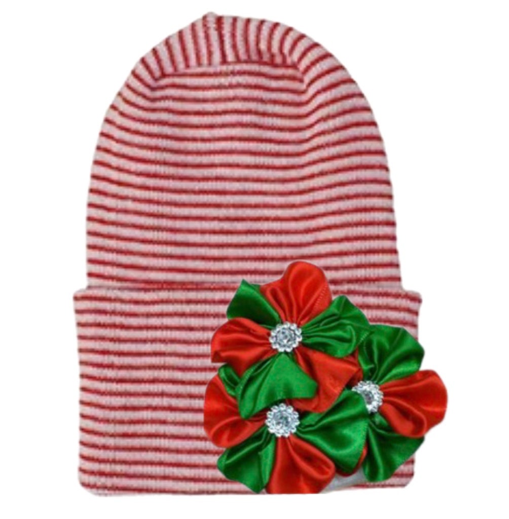 This listing is for a super cute red and white stripe OR solid white rounded top newborn hospital hat with a pretty red and green flower cluster on it.  perfect for your new addition! Christmas holiday hospital hat will be perfect to have for baby upon arrival letting the world know your baby has arrived!  It'll fit snug, won't fall off and will be perfect to wear in hospital and on the way home.