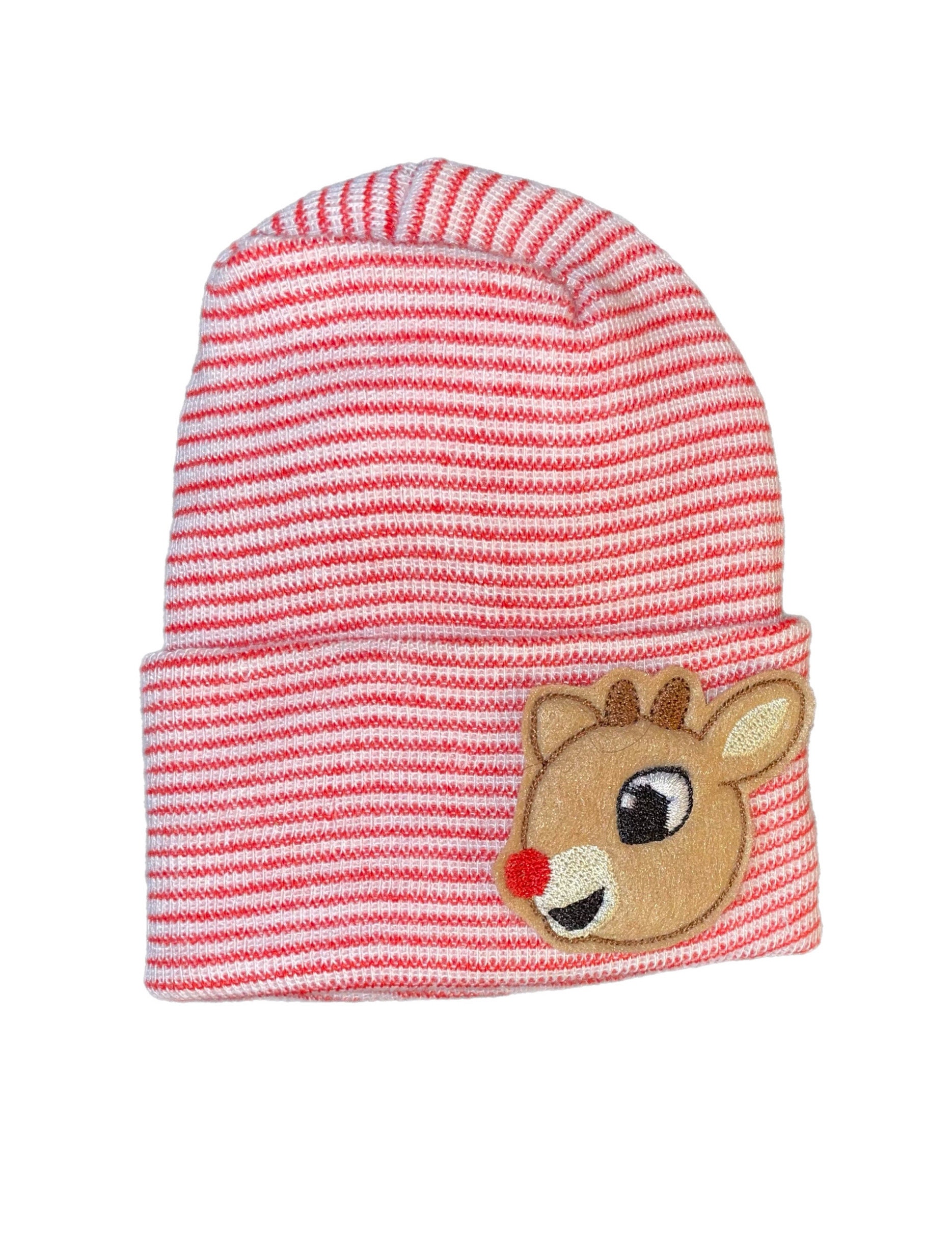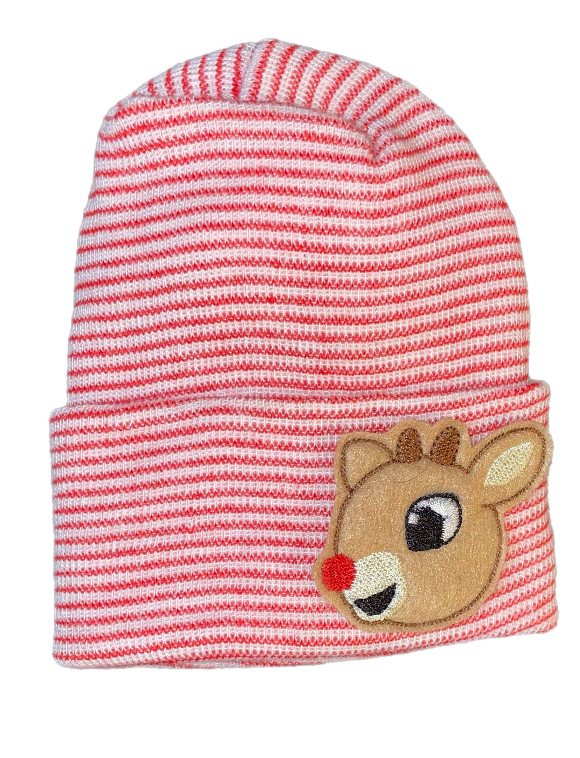 This listing is for a super cute red and white stripe OR solid white rounded top newborn hospital hat with a reindeer on it. Perfect for your new addition! Christmas holiday hospital hat will be perfect to have for baby upon arrival letting the world know your baby has arrived!  It'll fit snug, won't fall off and will be perfect to wear in hospital and on the way home.