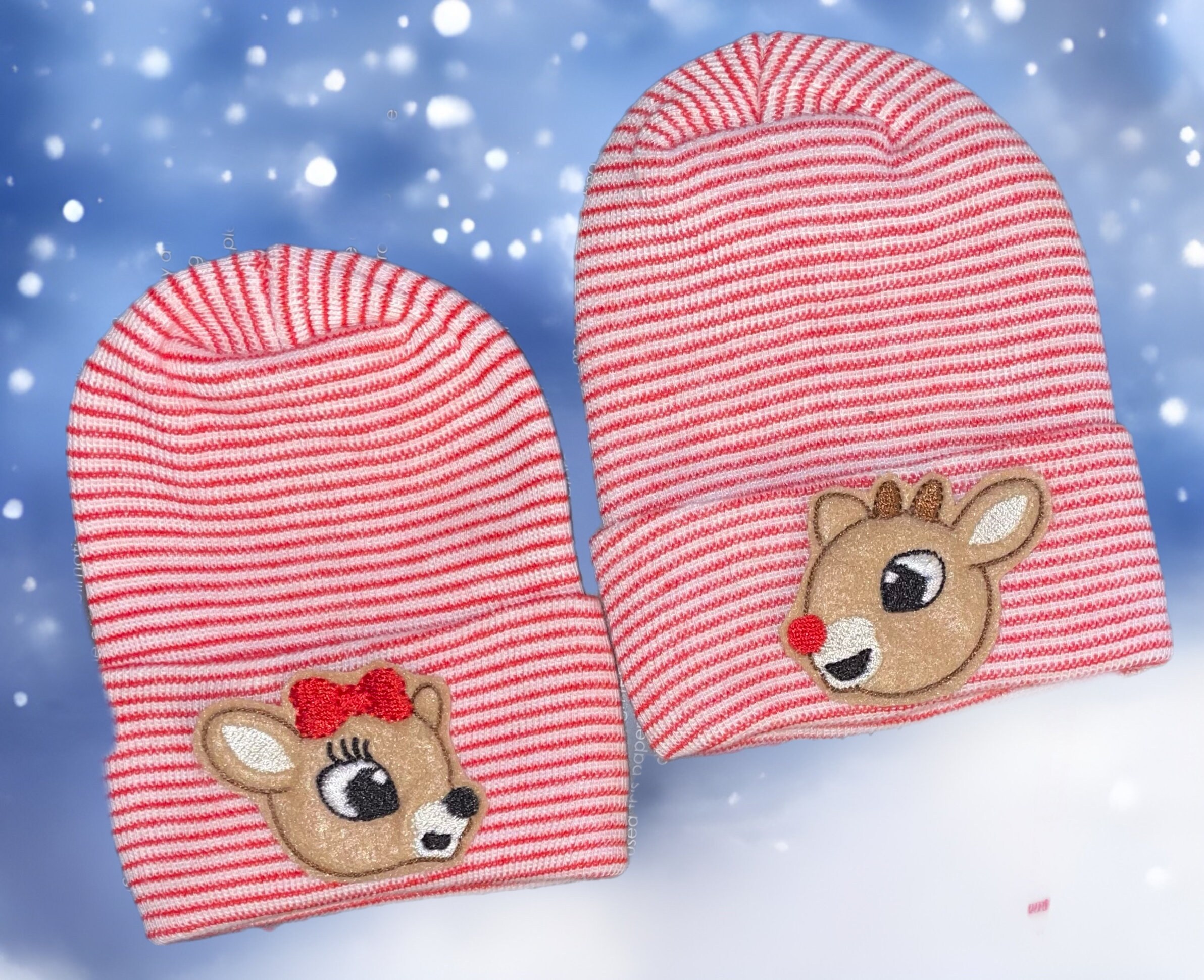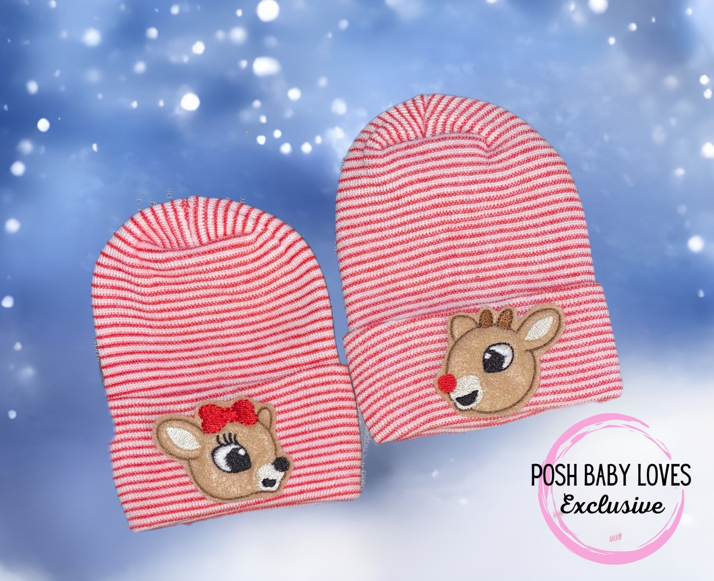 This listing is for 2 cute red snd white striped hats with reindeer on them. The girls reindeer has a bow and the boys hat does not.  Perfect for your new additions! Christmas holiday hospital hat will be perfect to have for babies upon arrival letting the world know your babies have arrived OR if you don’t know gender you will have one of each!! Great gift and a forever keepsake!!