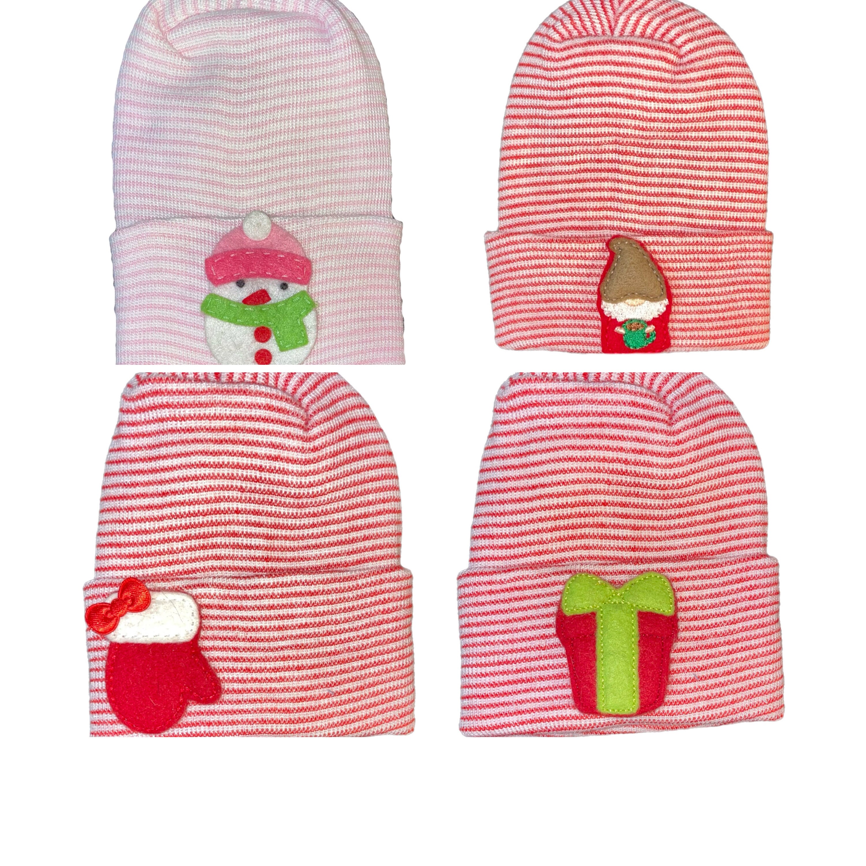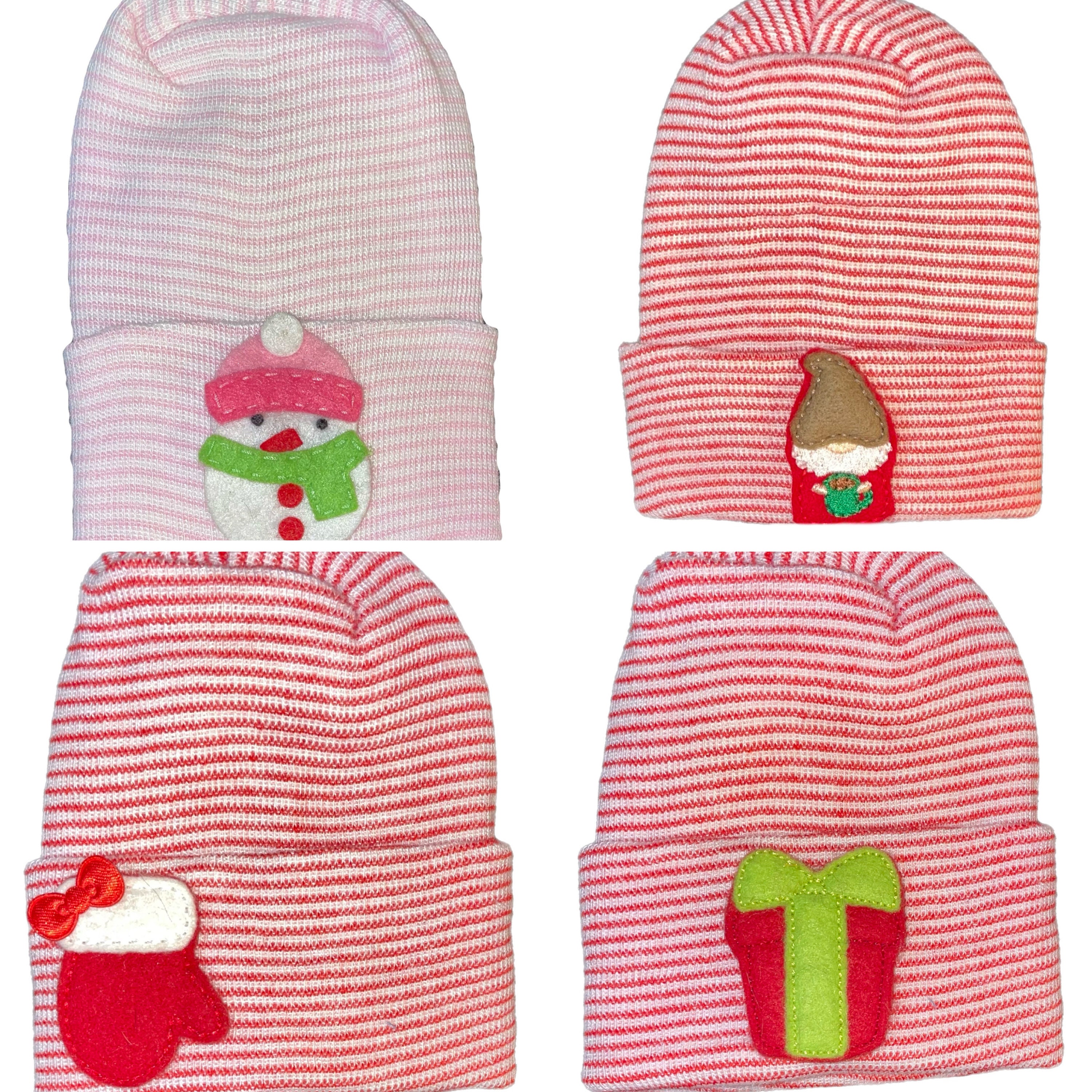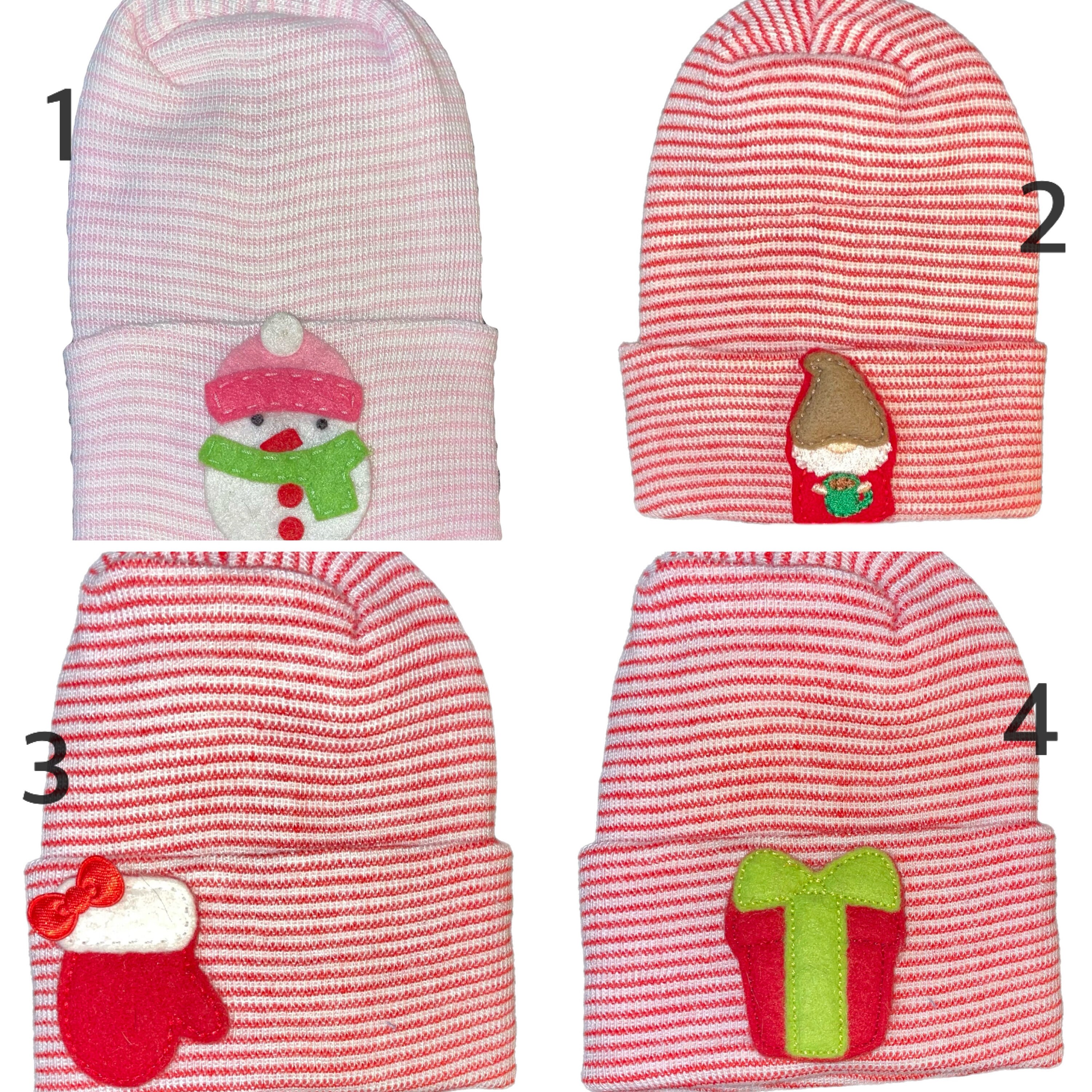 This listing is for a holiday hat in your choice of both color and applique. These ship fast and i only have a few. Perfect for your new addition! Christmas holiday hospital hat will be perfect to have for baby upon arrival letting the world know your baby has arrived!  It'll fit snug, won't fall off and will be perfect to wear in hospital and on the way home.