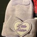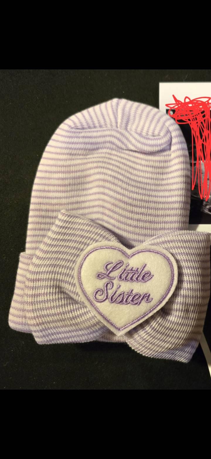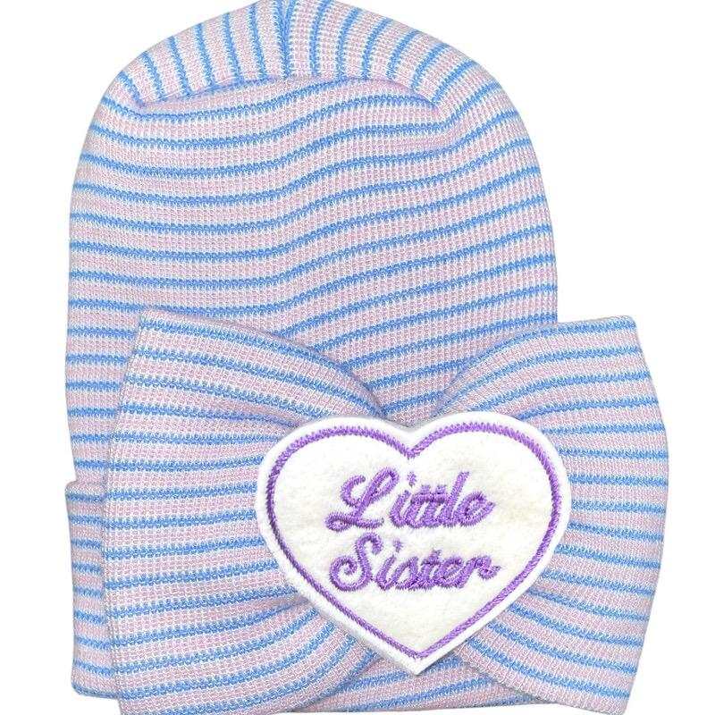 Cute baby Hat is a lavender and white stripe OR pink, blue and white stripe rounded top hat with little sister on it in purple. Soft Newborn hospital hat. Baby Girl beanie hospital hat to have for her upon arrival! Cute and will be perfect to wear going home and Cute for photos.