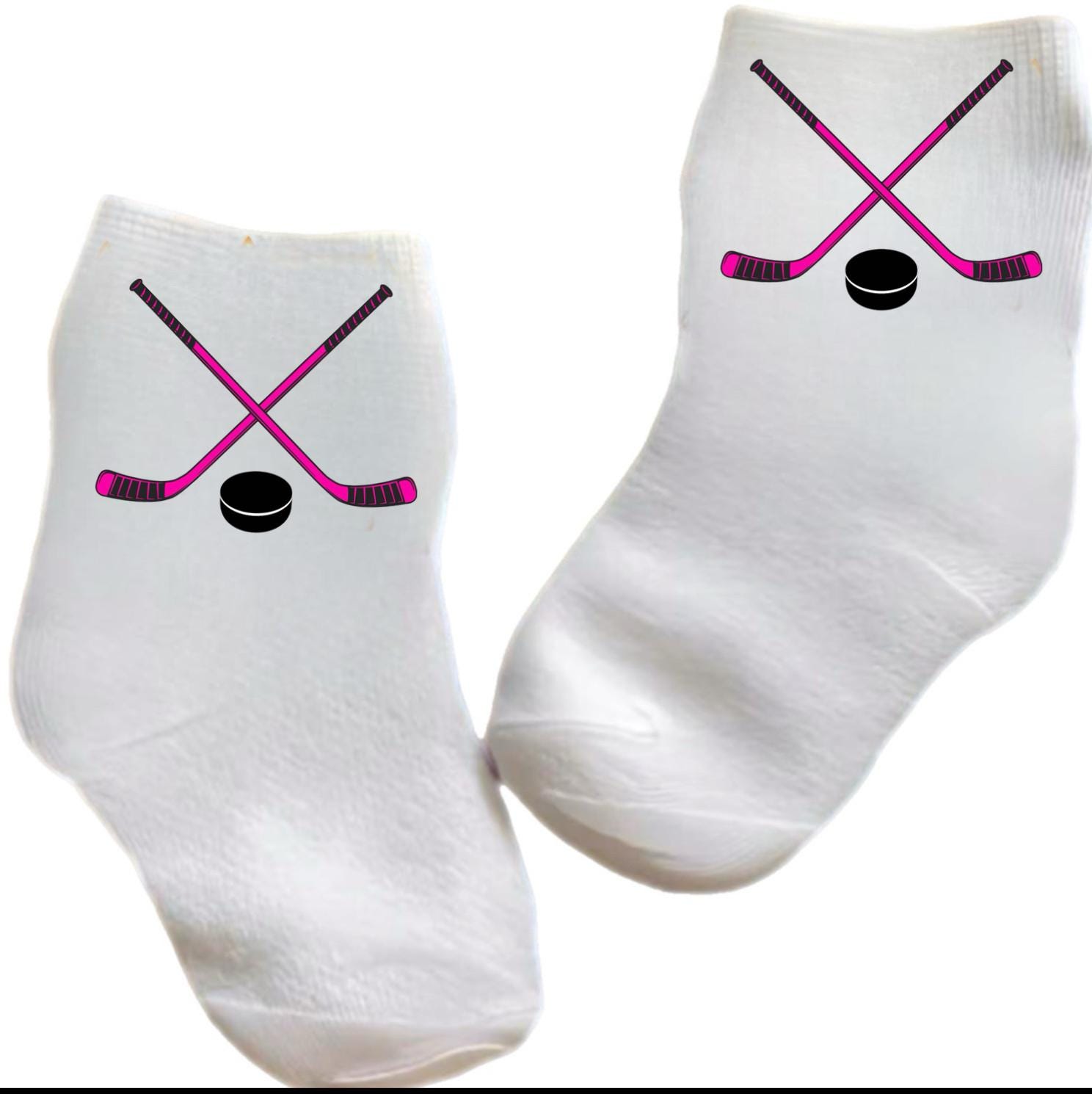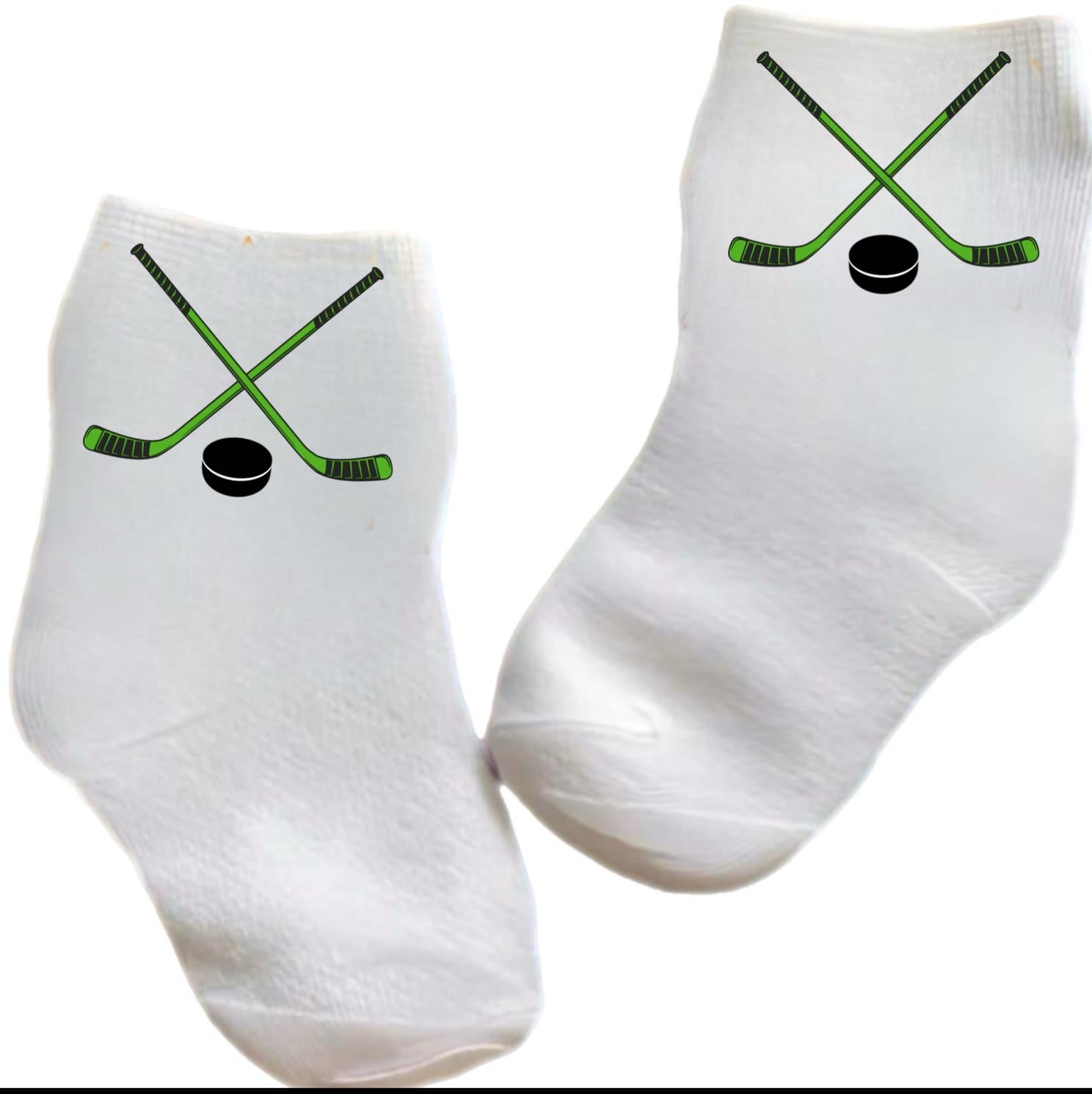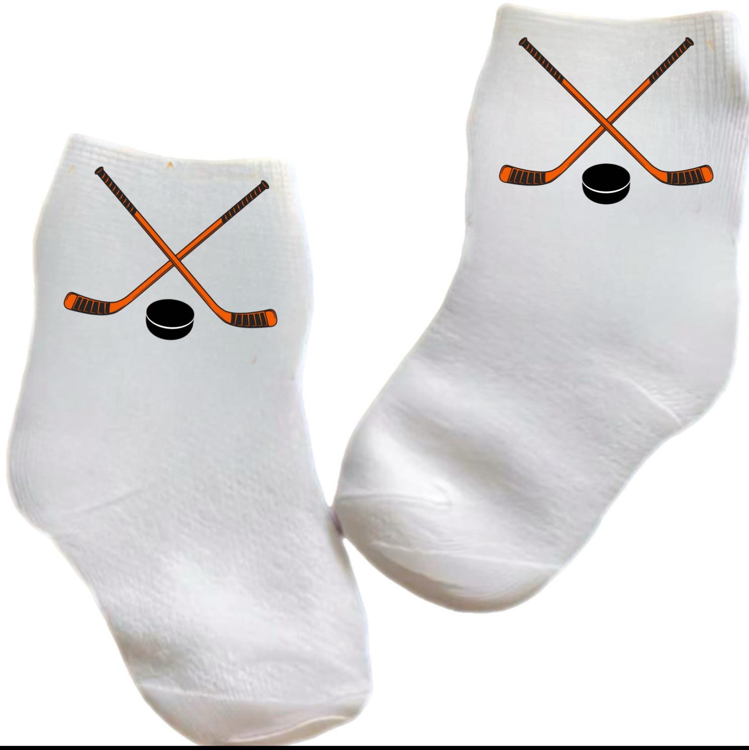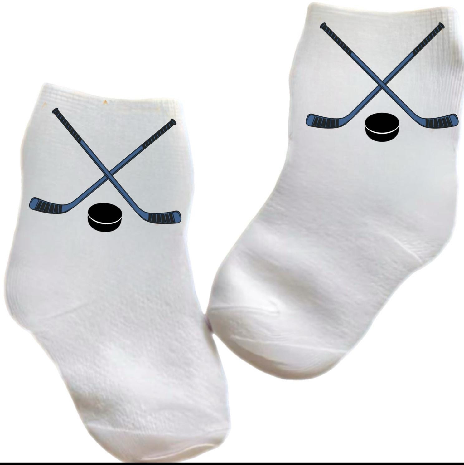 This listing is for an adorable pair of socks with puck & hockey sticks. You choose size and color. These are offered in sizes from 0-6 months to 7-10 Years. This listing is for 1 pair of socks. Cute for boy or girl.
