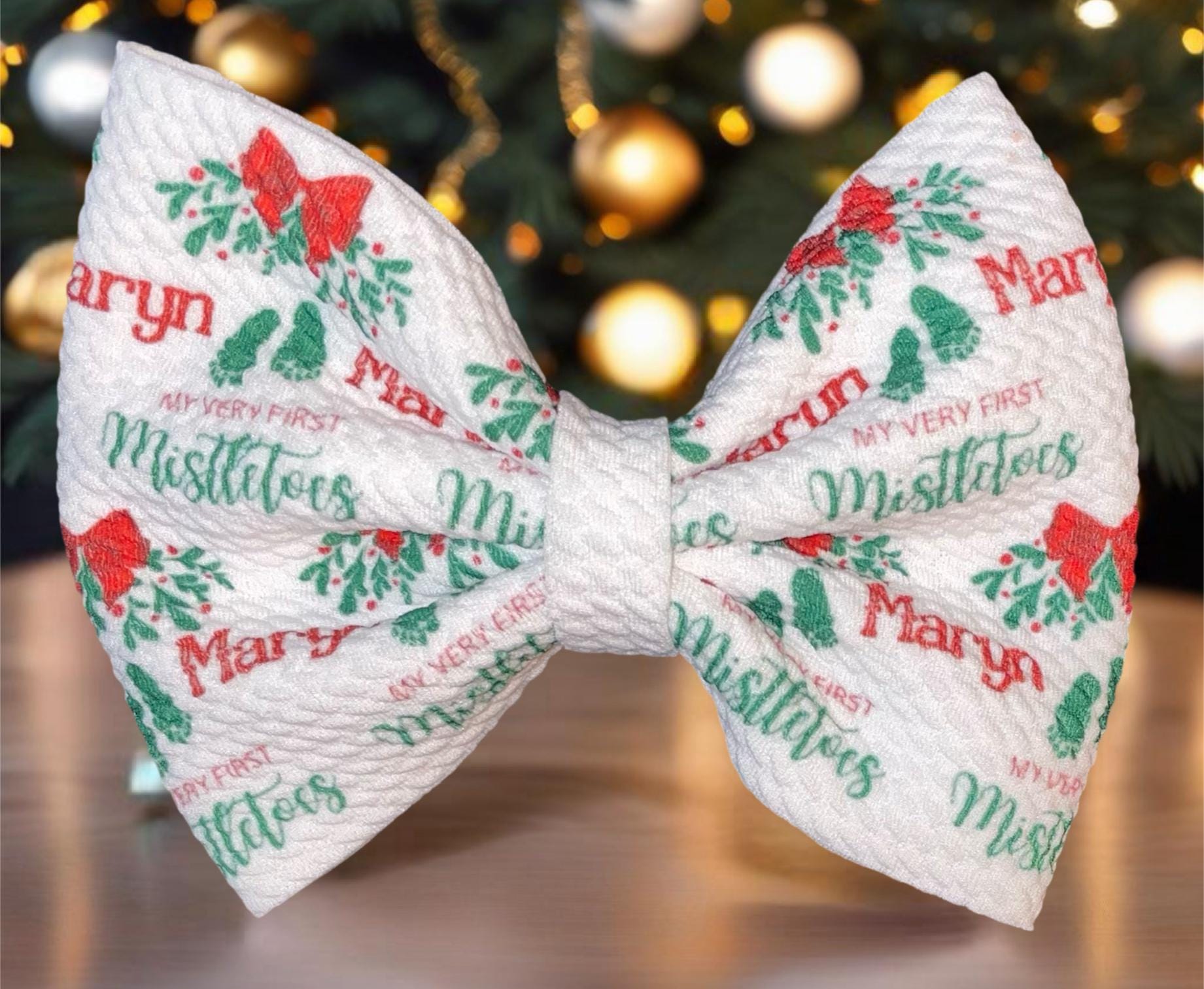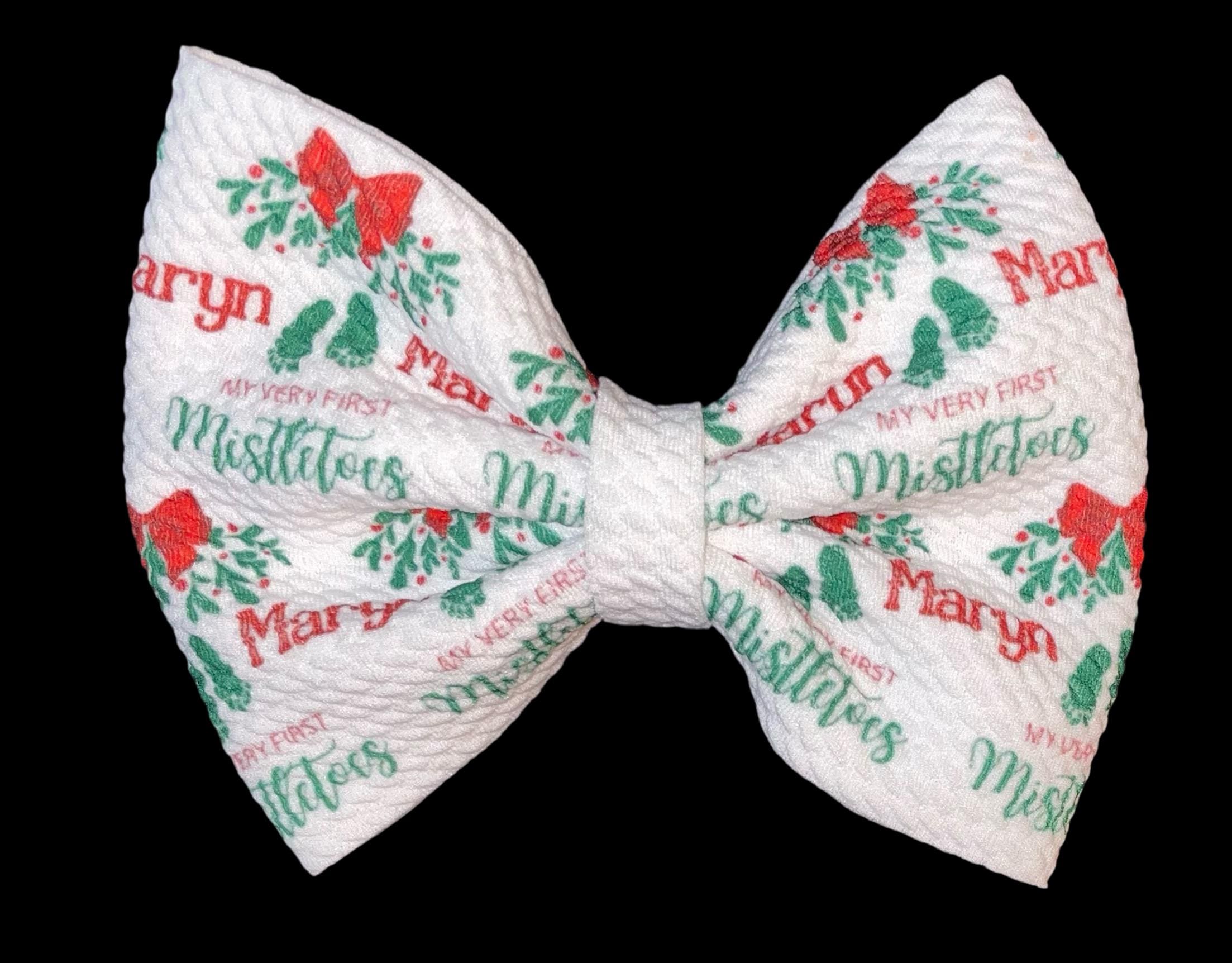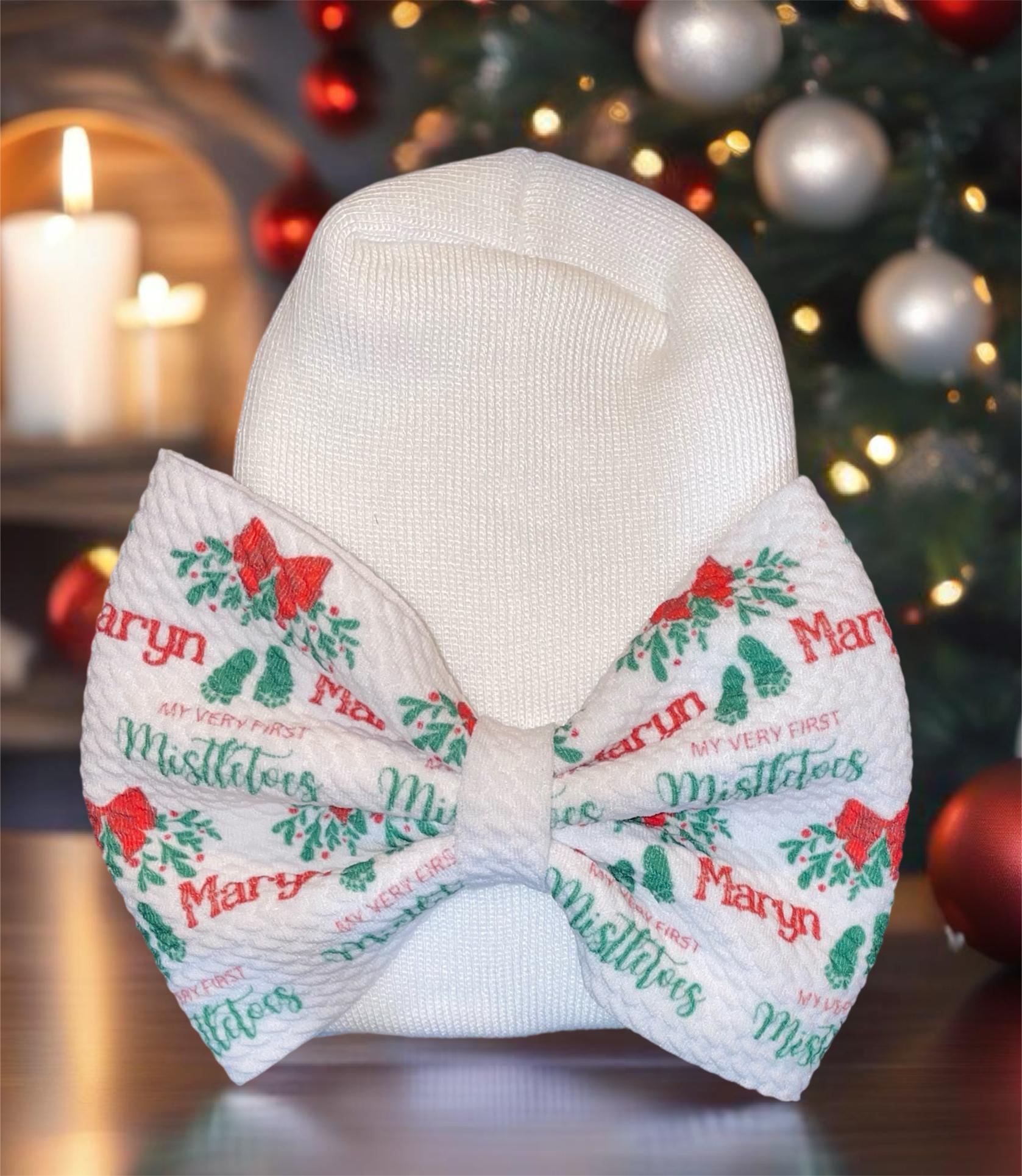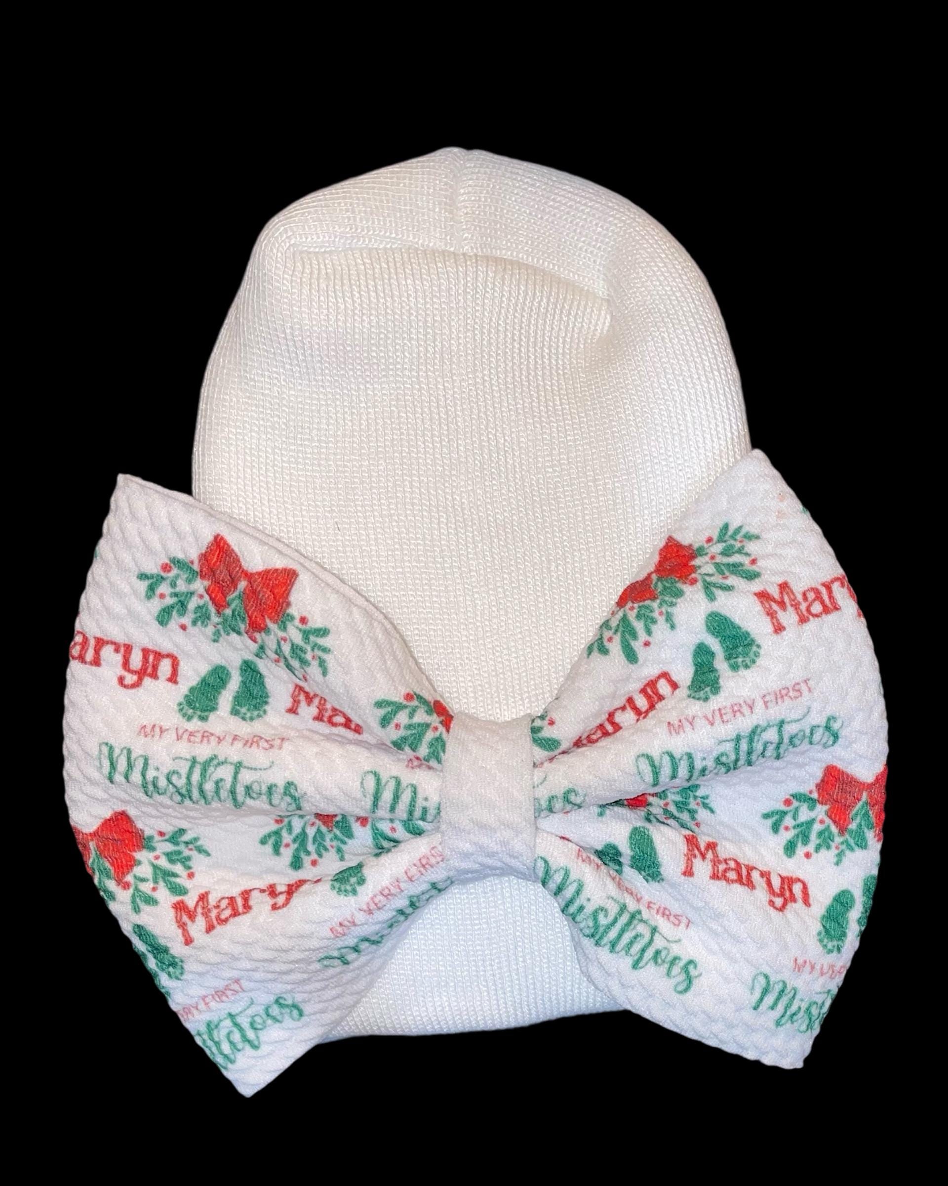 I am so excited to be able to offer these custom bows with My very first mistletoes with or without name You select it on white newborn hat, red/white stripe newborn hat,  nylon headband or alligator clip at checkout  ♥ A Posh Baby Loves exclusive!  Great gift. Cute for pictures.