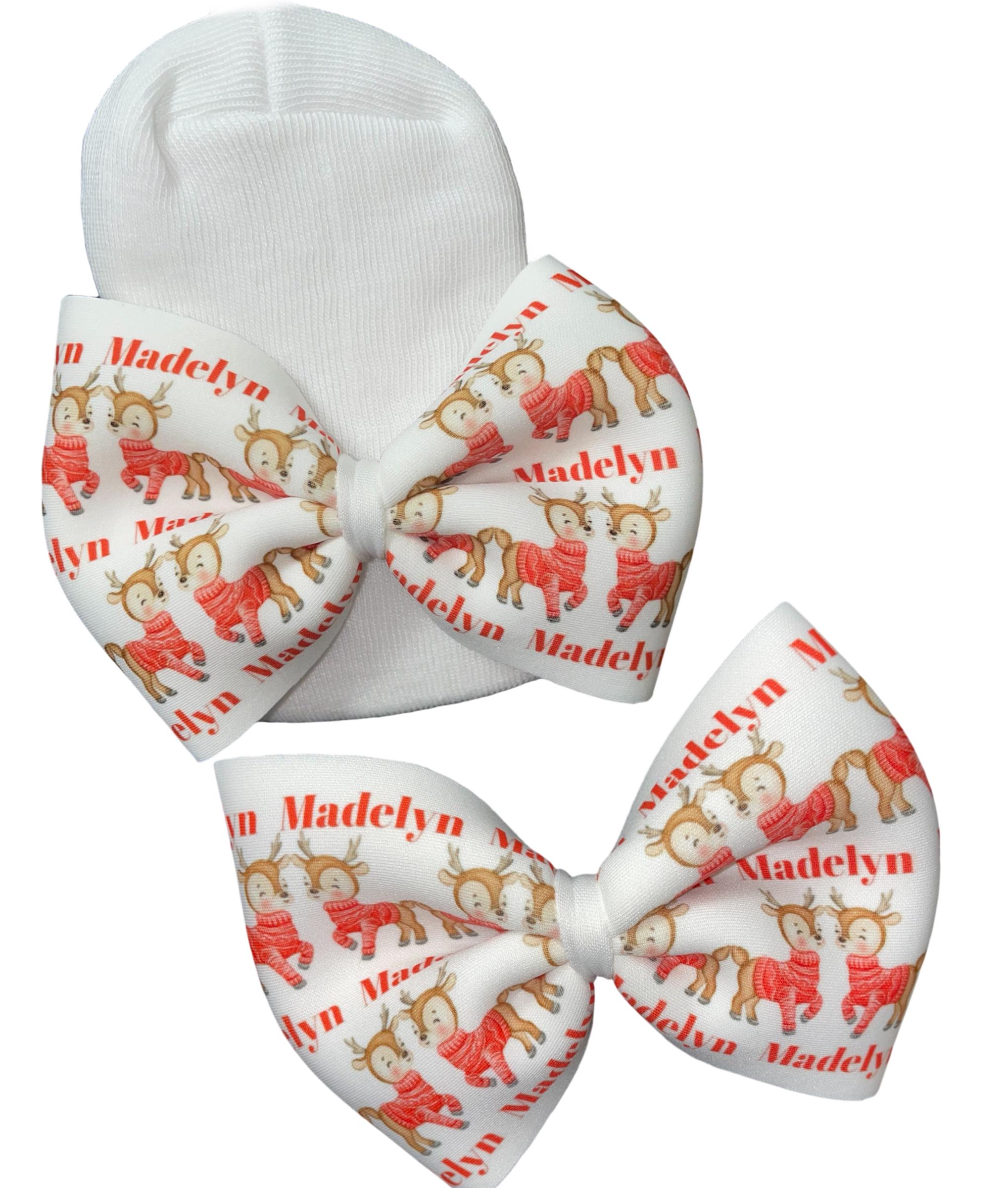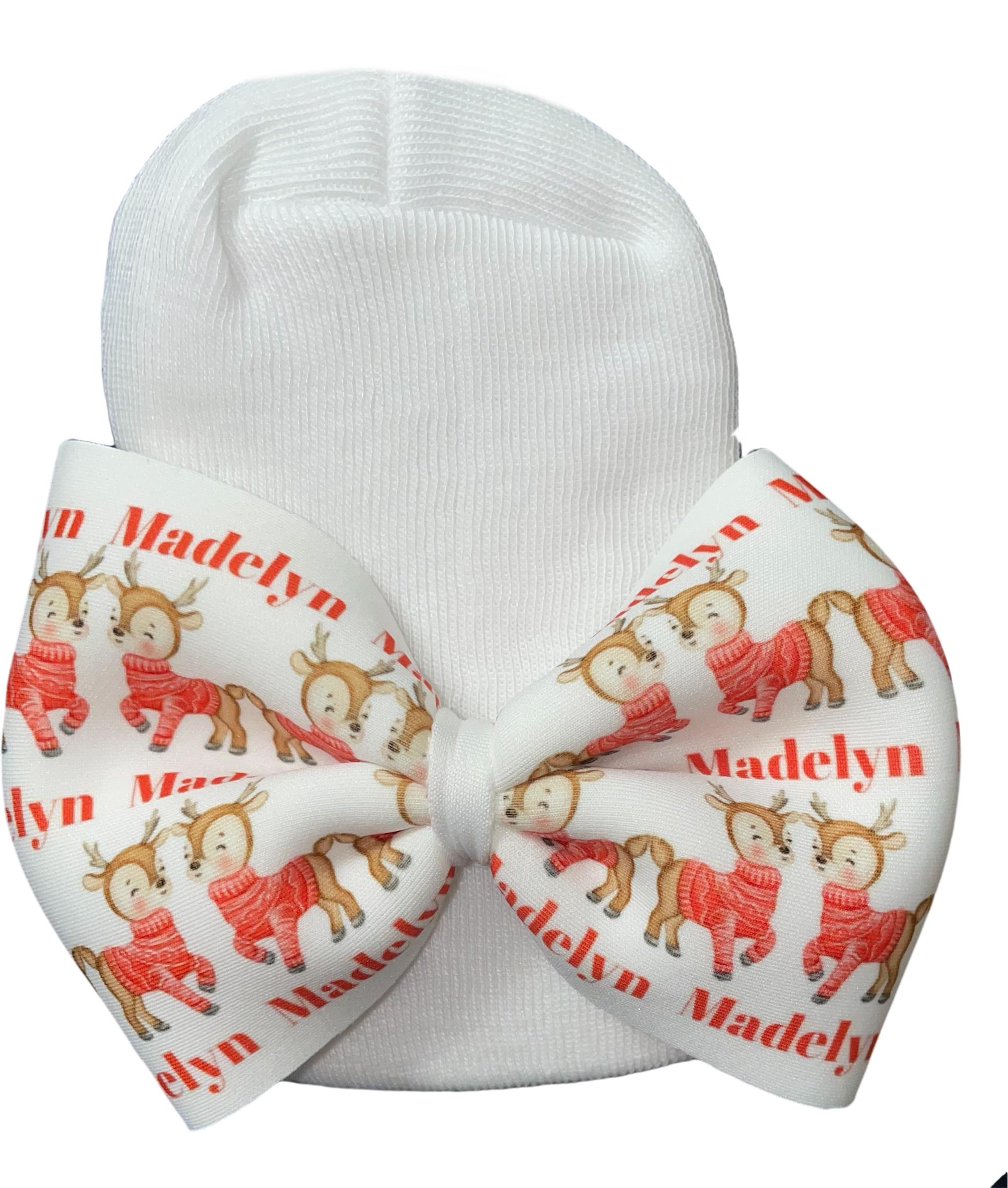 I am so excited to be able to offer these custom reindeer bows  with name on it.  You select it on hat, headband or alligator clip at checkout  ♥ A Posh Baby Loves exclusive!  Great gift. Cute for pictures.