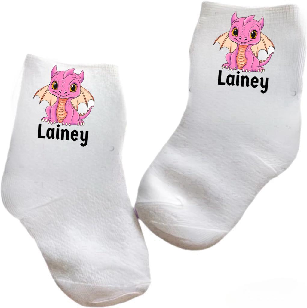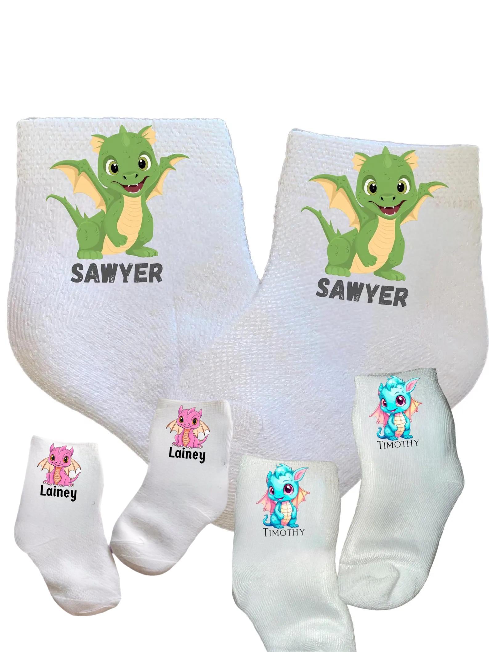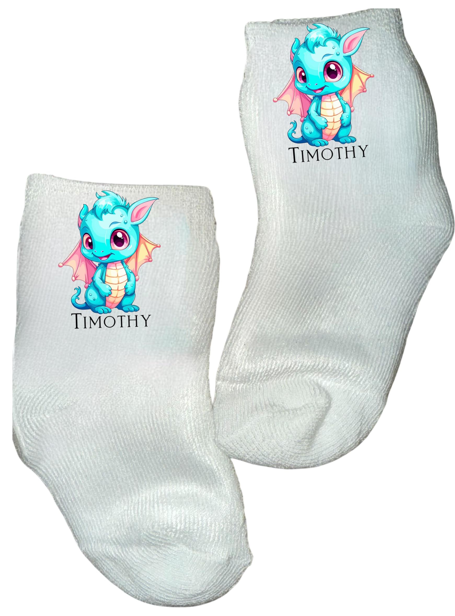 This listing is for an adorable pair of Socks with a cute dragon on them. You select which dragon at checkout. These are offered in sizes from 0-6 months to 10 years.  This listing is for 1 pair of  socks for boy or girl with option to add name on them.