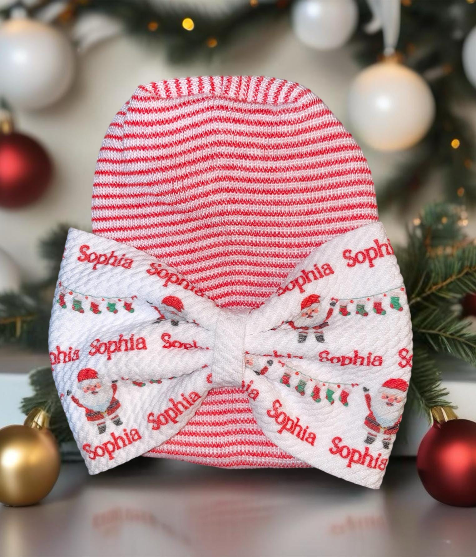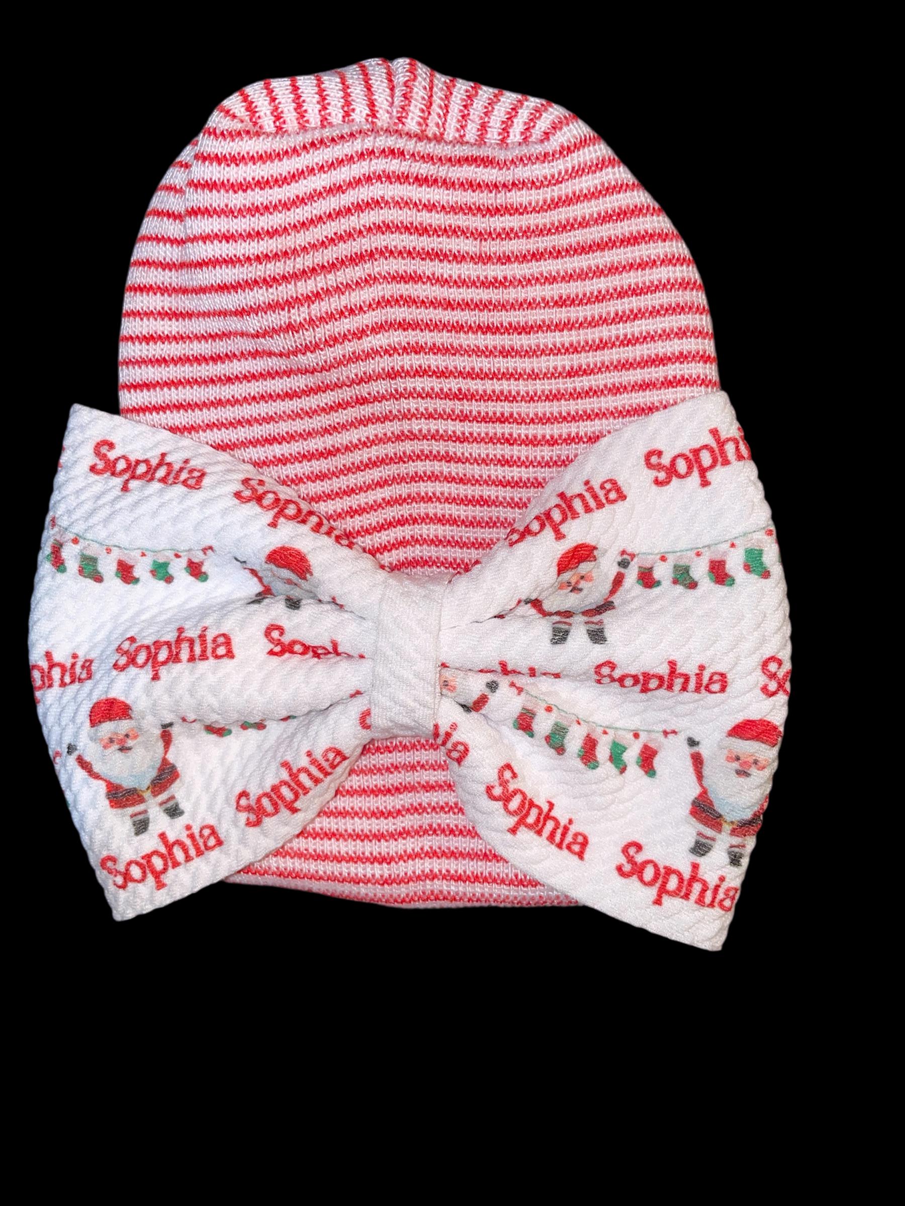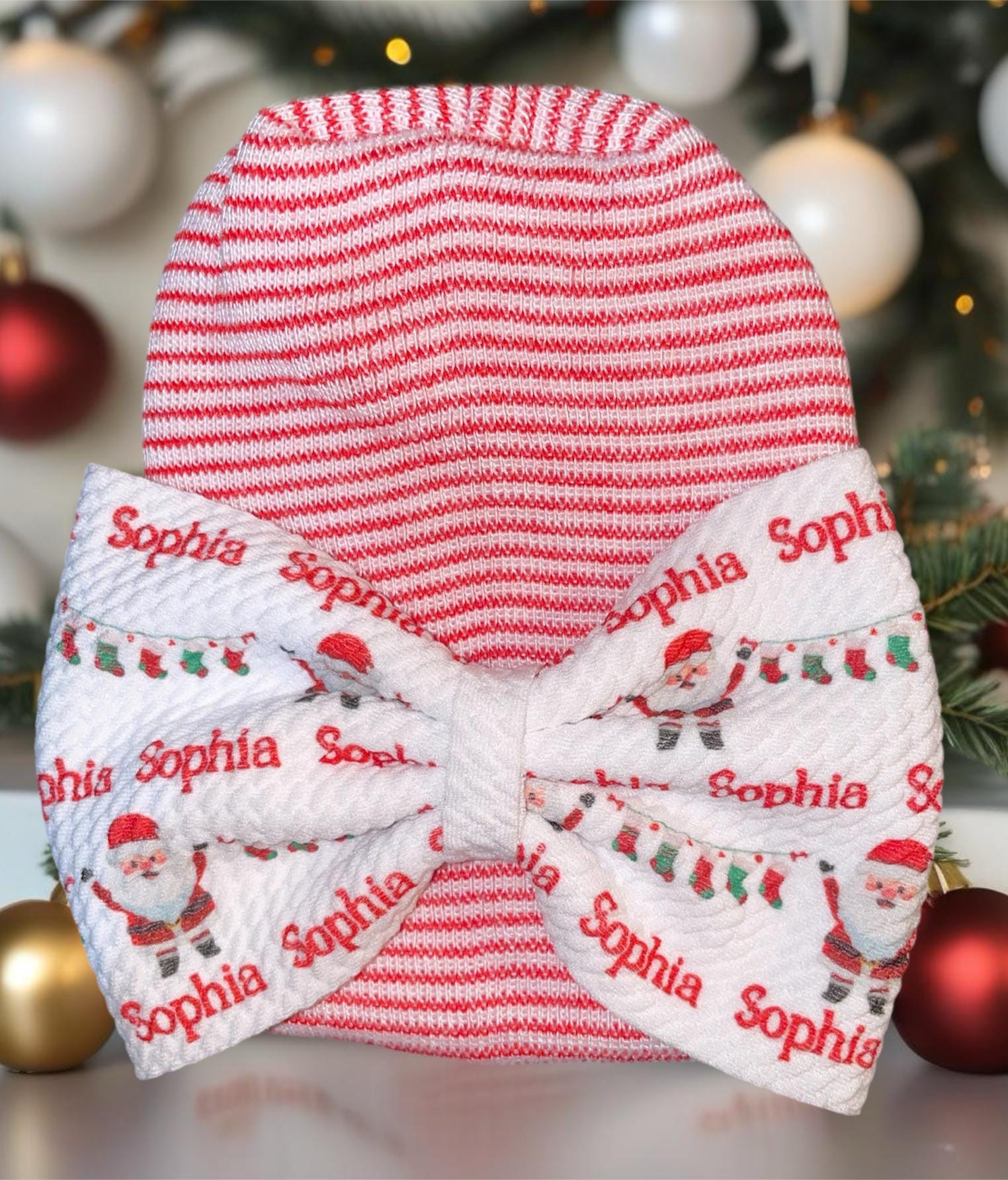 I am so excited to be able to offer these custom bows with Santa and Christmas lights with name on it.  You select it on white newborn hat, red/white stripe newborn hat, nylon headband or alligator clip at checkout  ♥ A Posh Baby Loves exclusive!  Great gift. Cute for pictures.