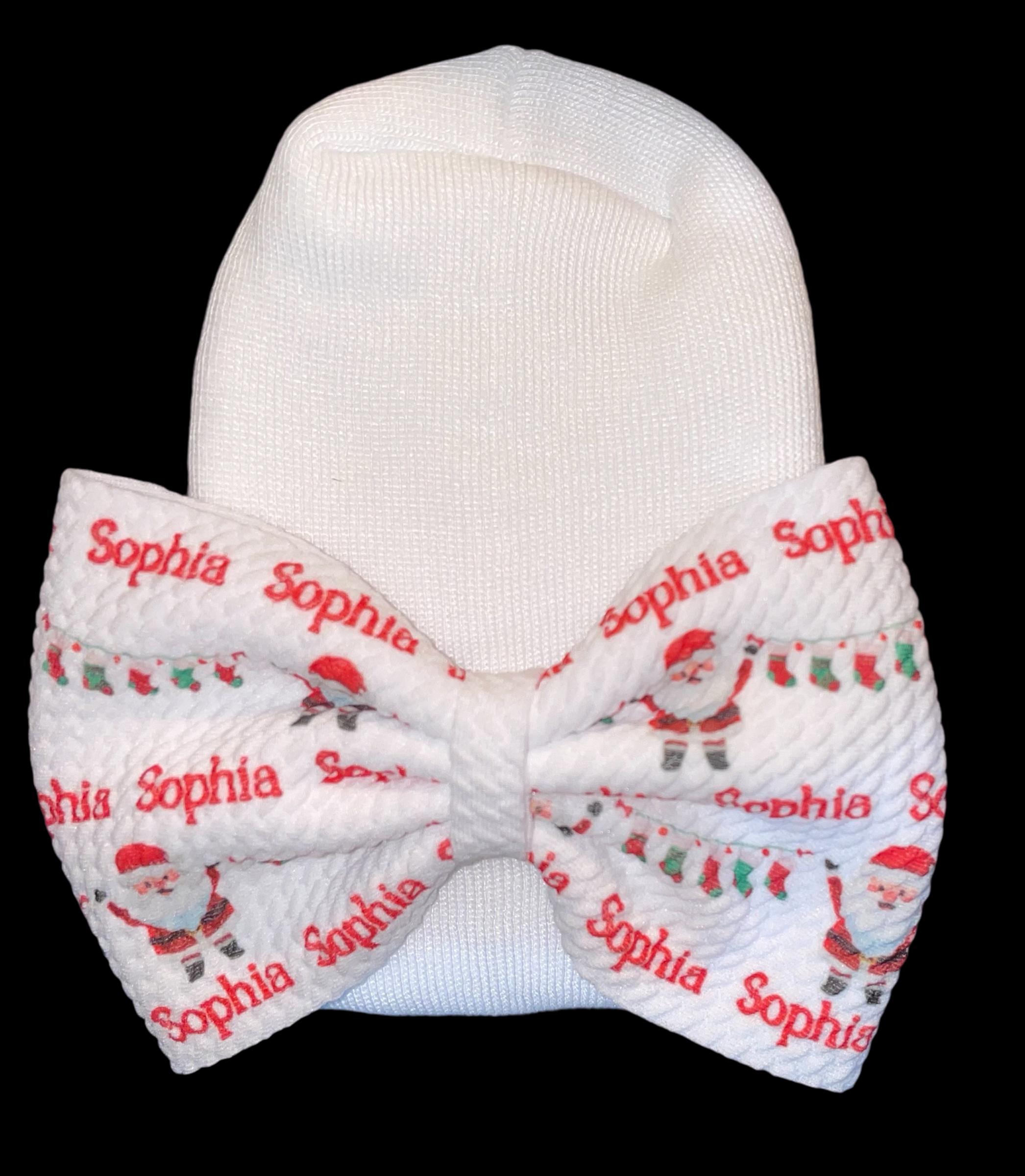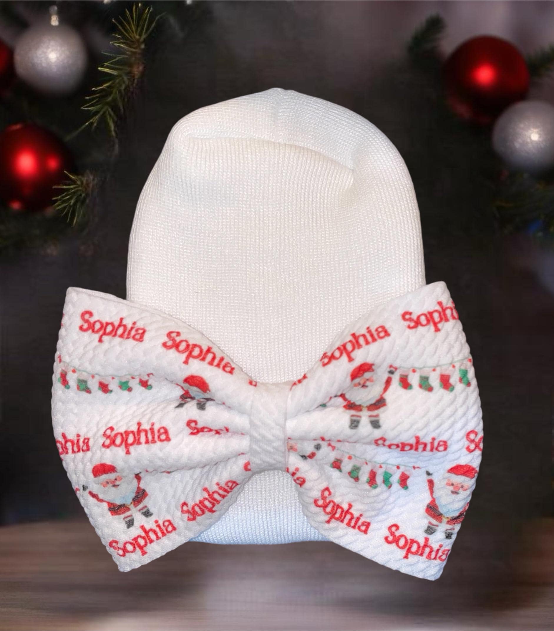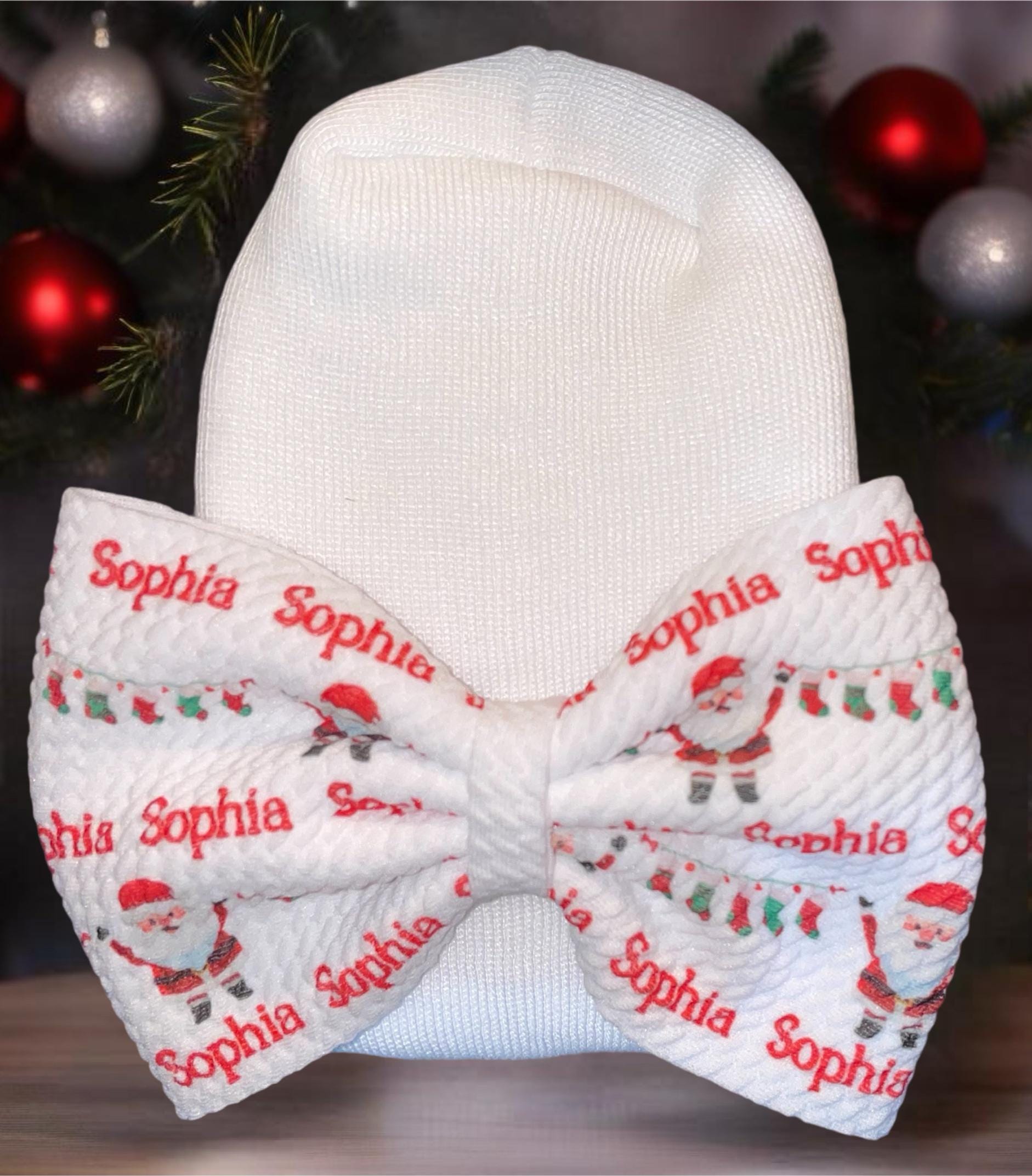 I am so excited to be able to offer these custom bows with Santa and Christmas lights with name on it.  You select it on white newborn hat, red/white stripe newborn hat, nylon headband or alligator clip at checkout  ♥ A Posh Baby Loves exclusive!  Great gift. Cute for pictures.