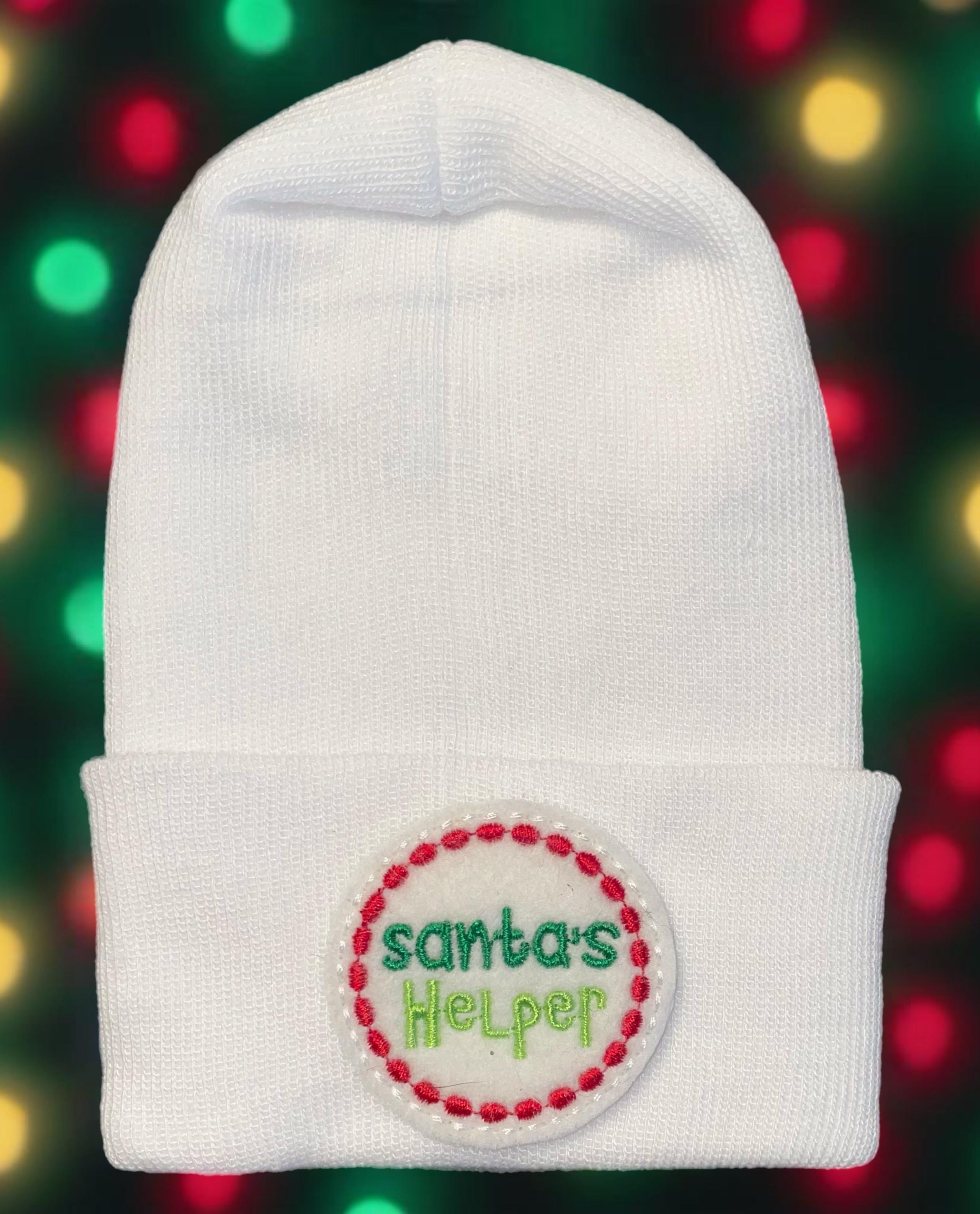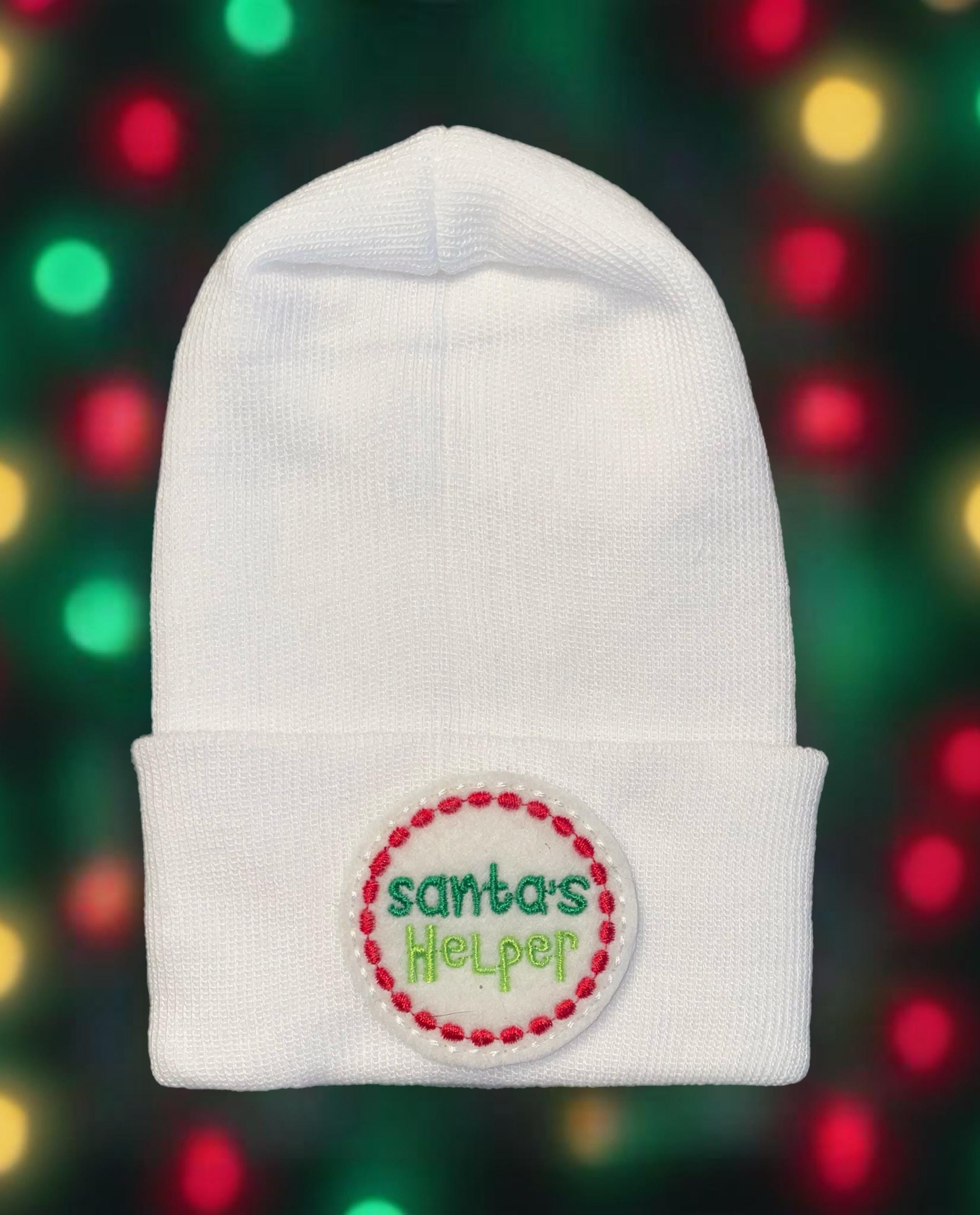 This listing is for a super cute white newborn hospital hat with Santa’s helper on it!!  PERFECT for hospital stay, going home and those 1st Christmas pictures!!