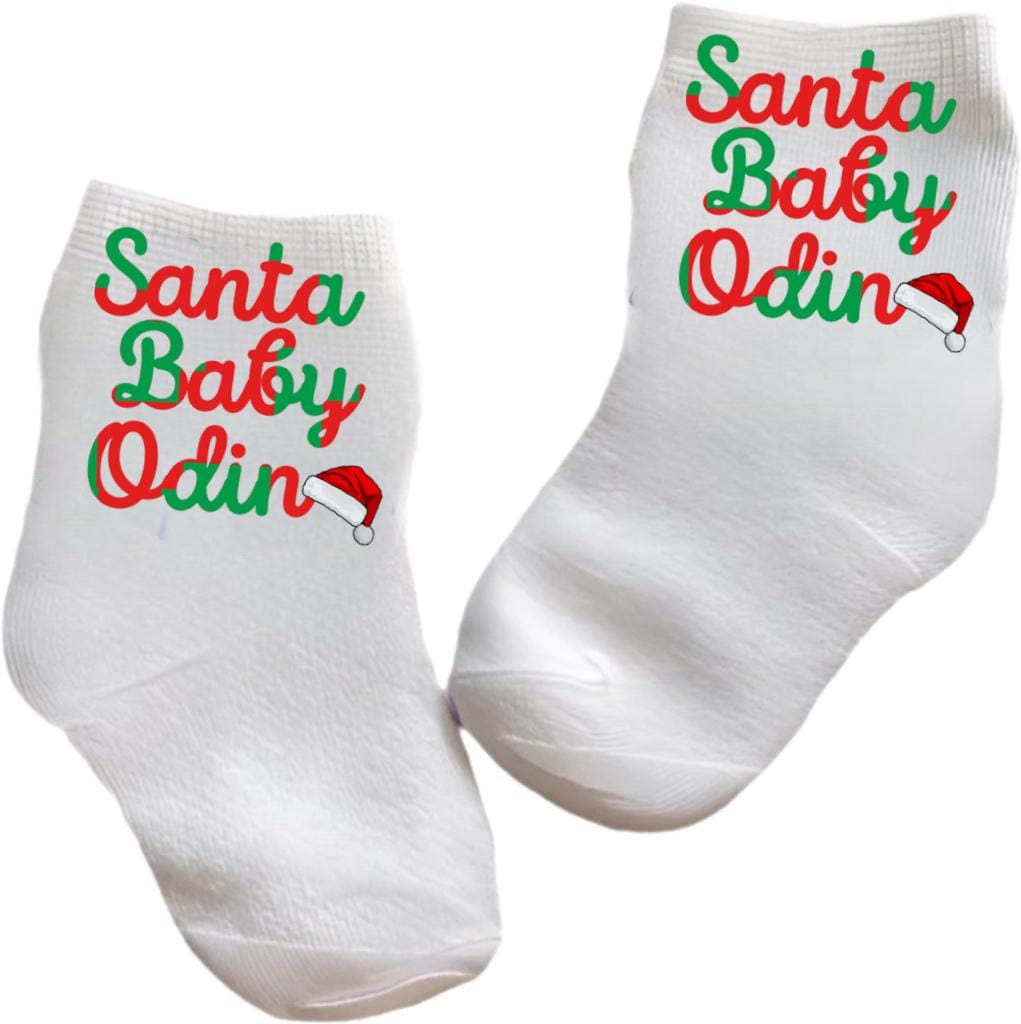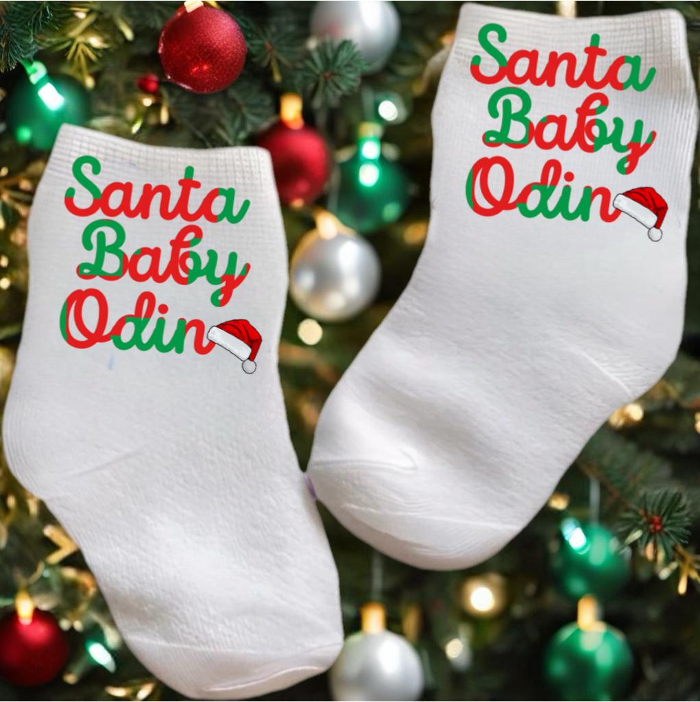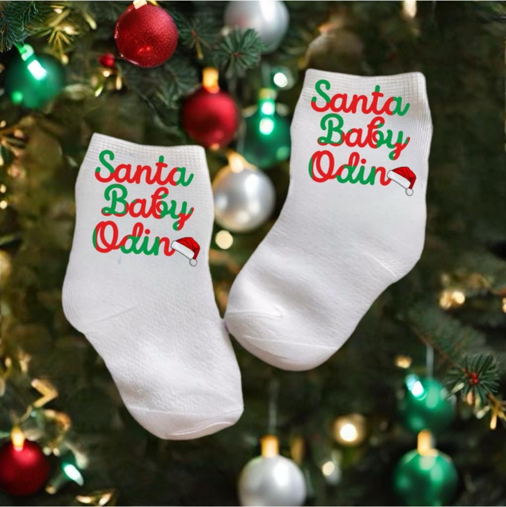 This listing is for an adorable pair of holiday Santa Baby socks and personalized with Name in combination of red and green. These are offered in sizes from 0-6 months to 14 years. This listing is for 1 pair of socks. Cute for boy or girl.