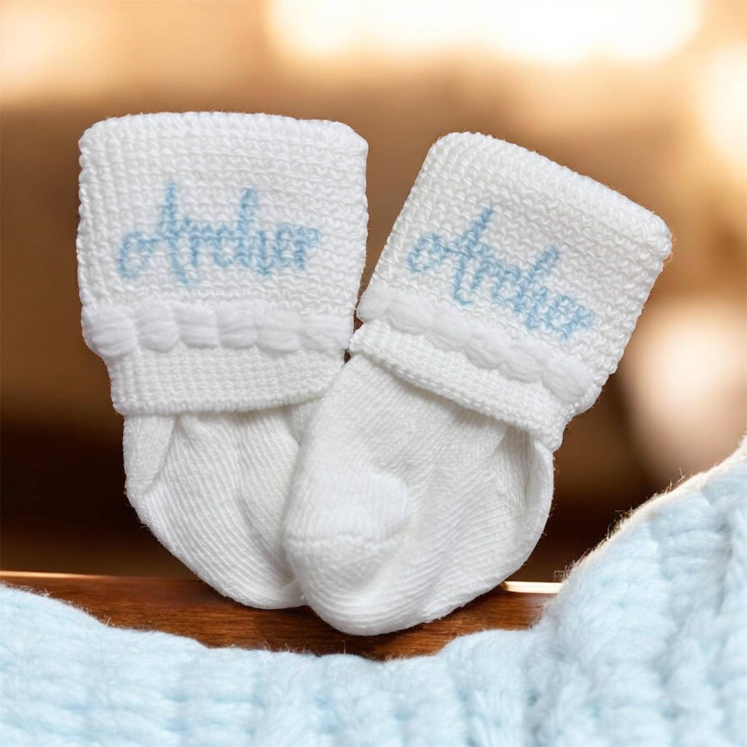 **PLEASE NOTE ON WHITE SOCKS ONLY, WE CAN MAKE NAME IN ANY COLOR. leave note in note to seller box what color. If you request a color on the blue or white socks we will NOT change color. Names are in black only for those.