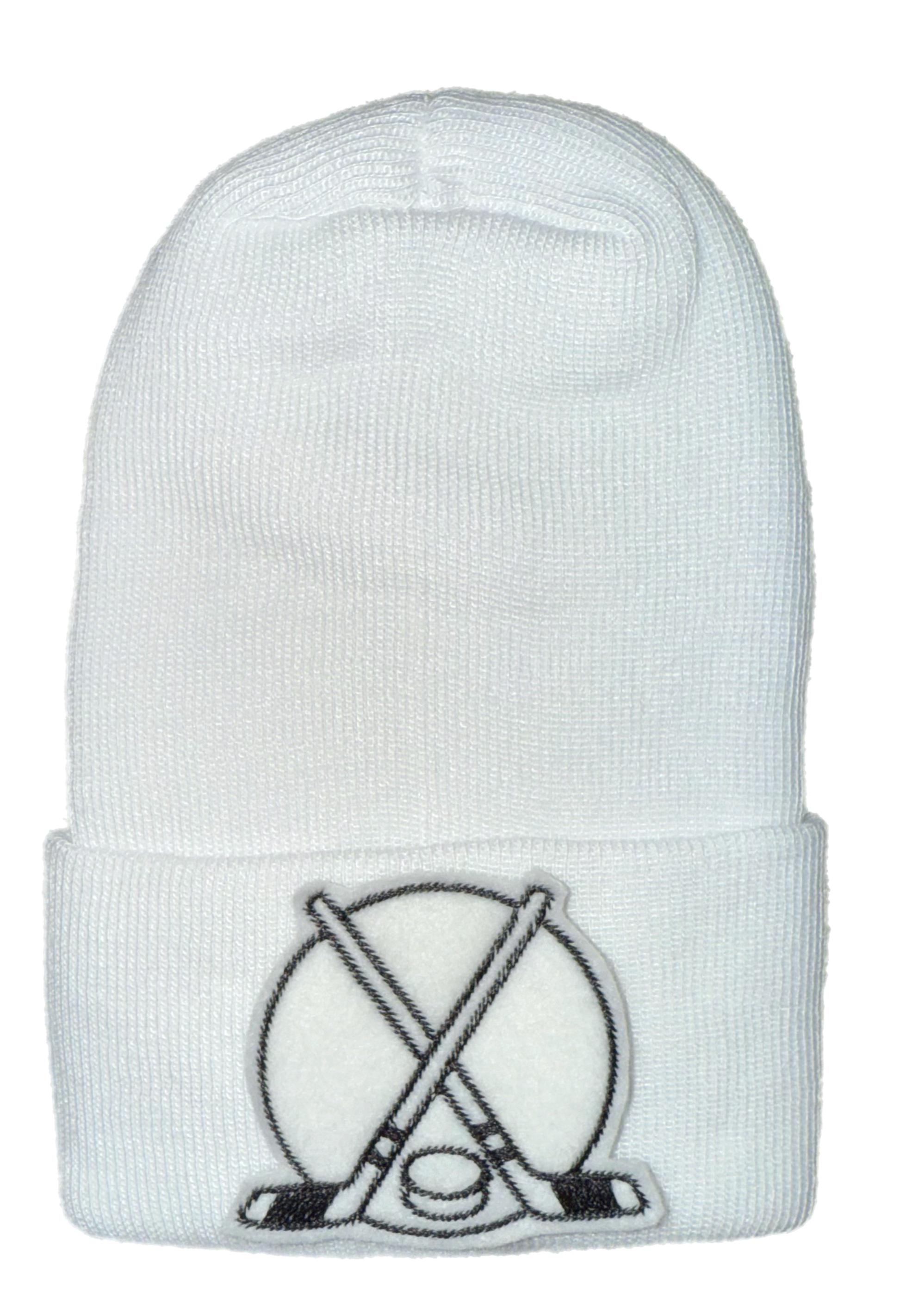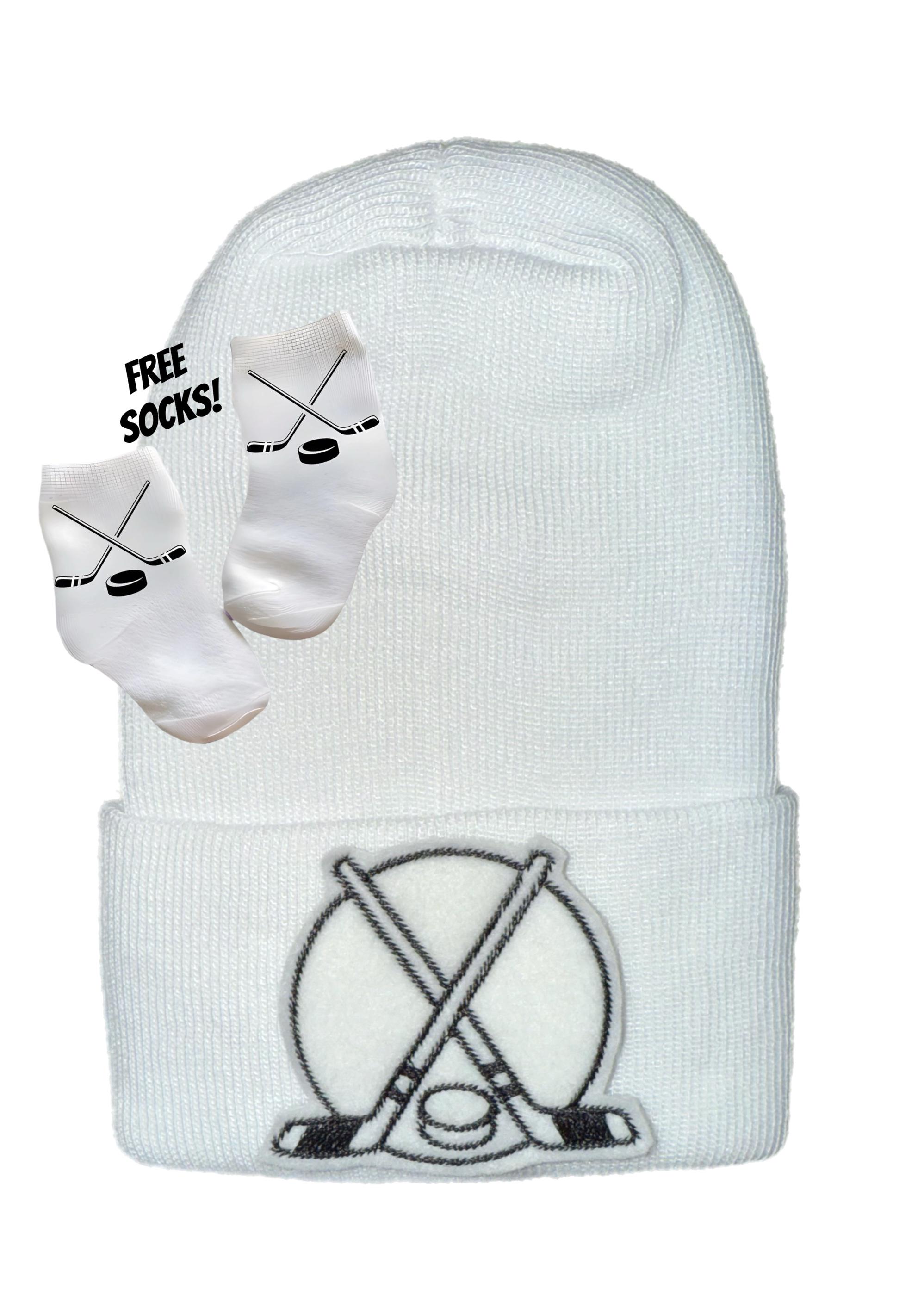 Baby's 1st Keepsake! Free socks. White hat with hockey sticks and puck on it and option to add matching no scratch mittens.