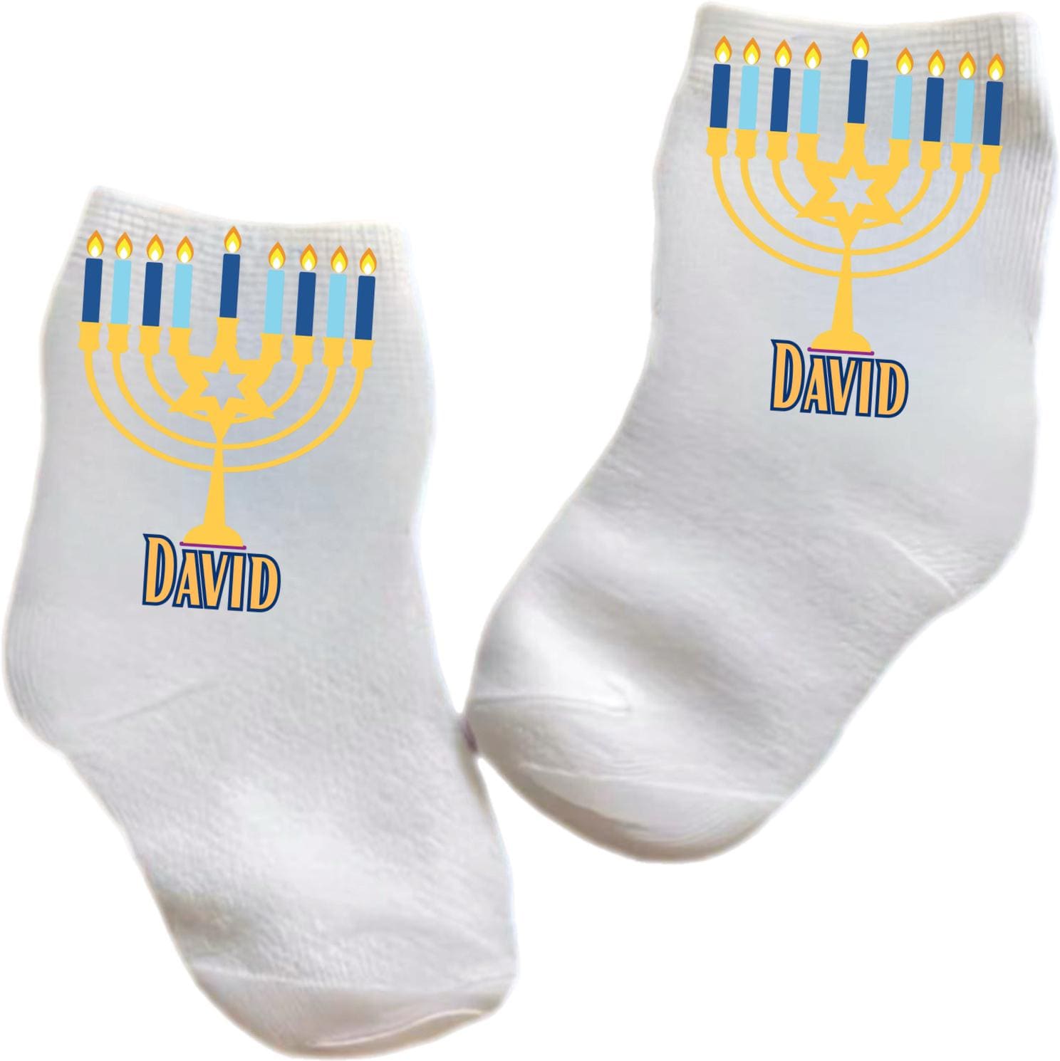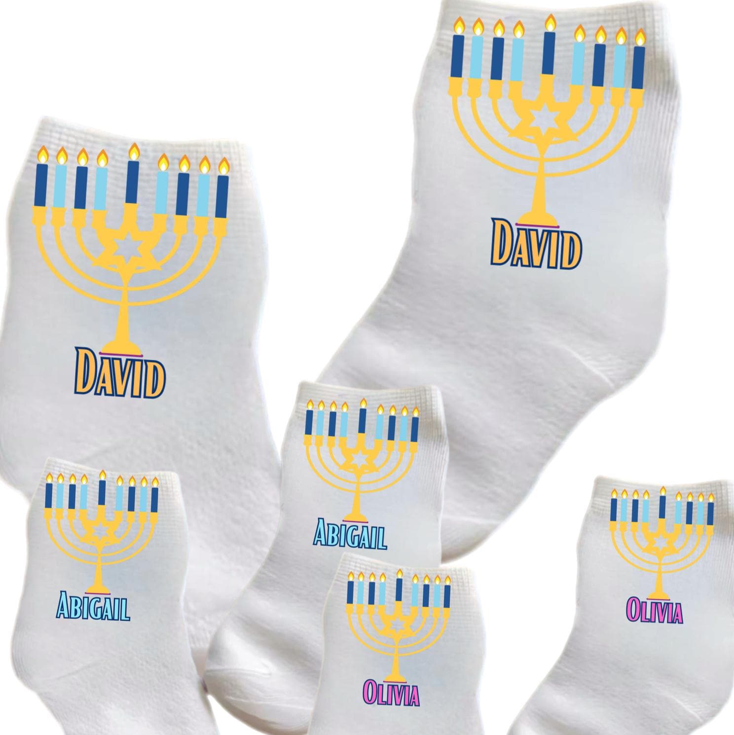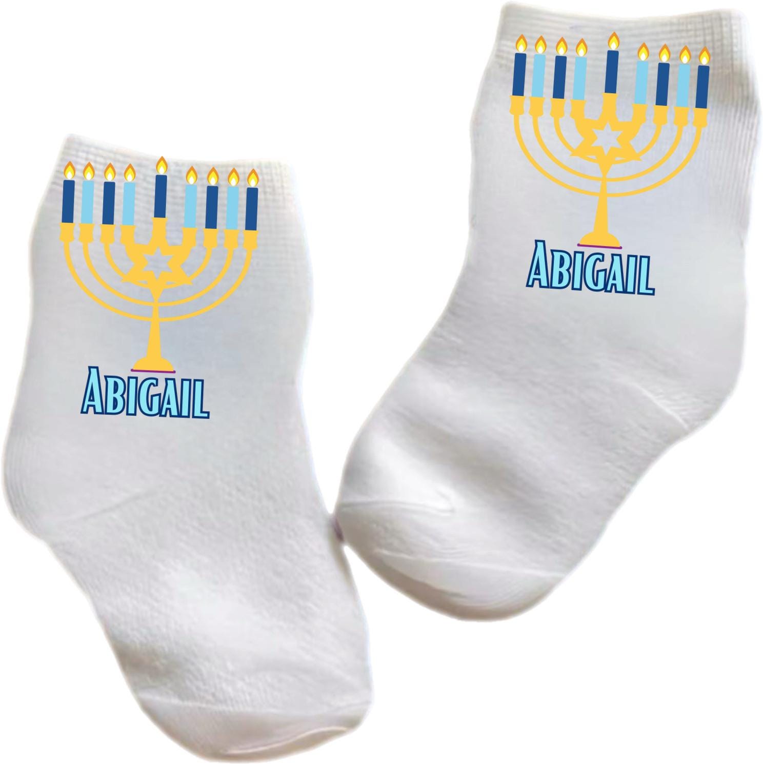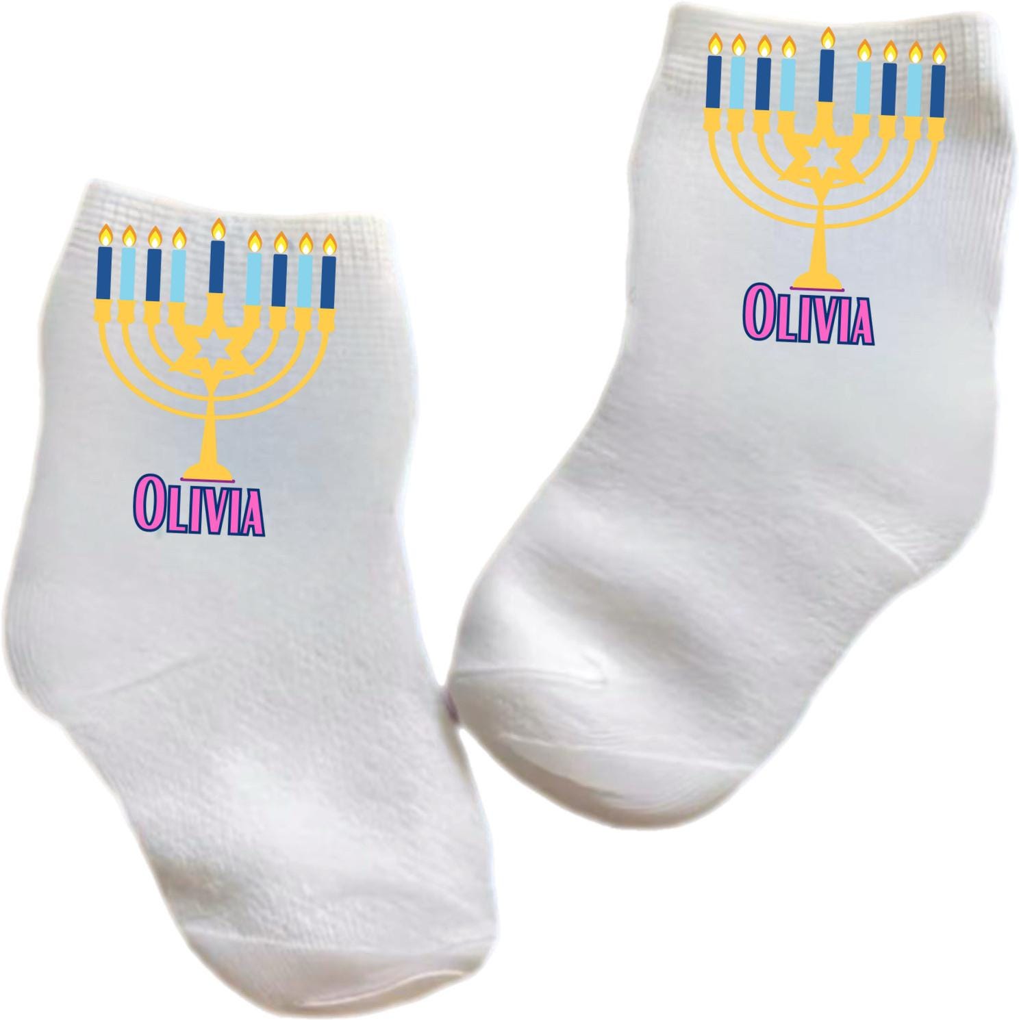 This listing is for a pair of holiday Menorah Hanukkah socks with or without name. These are offered in sizes from 0-6 months to adult. This listing is for 1 pair of socks. Cute for boy or girl.