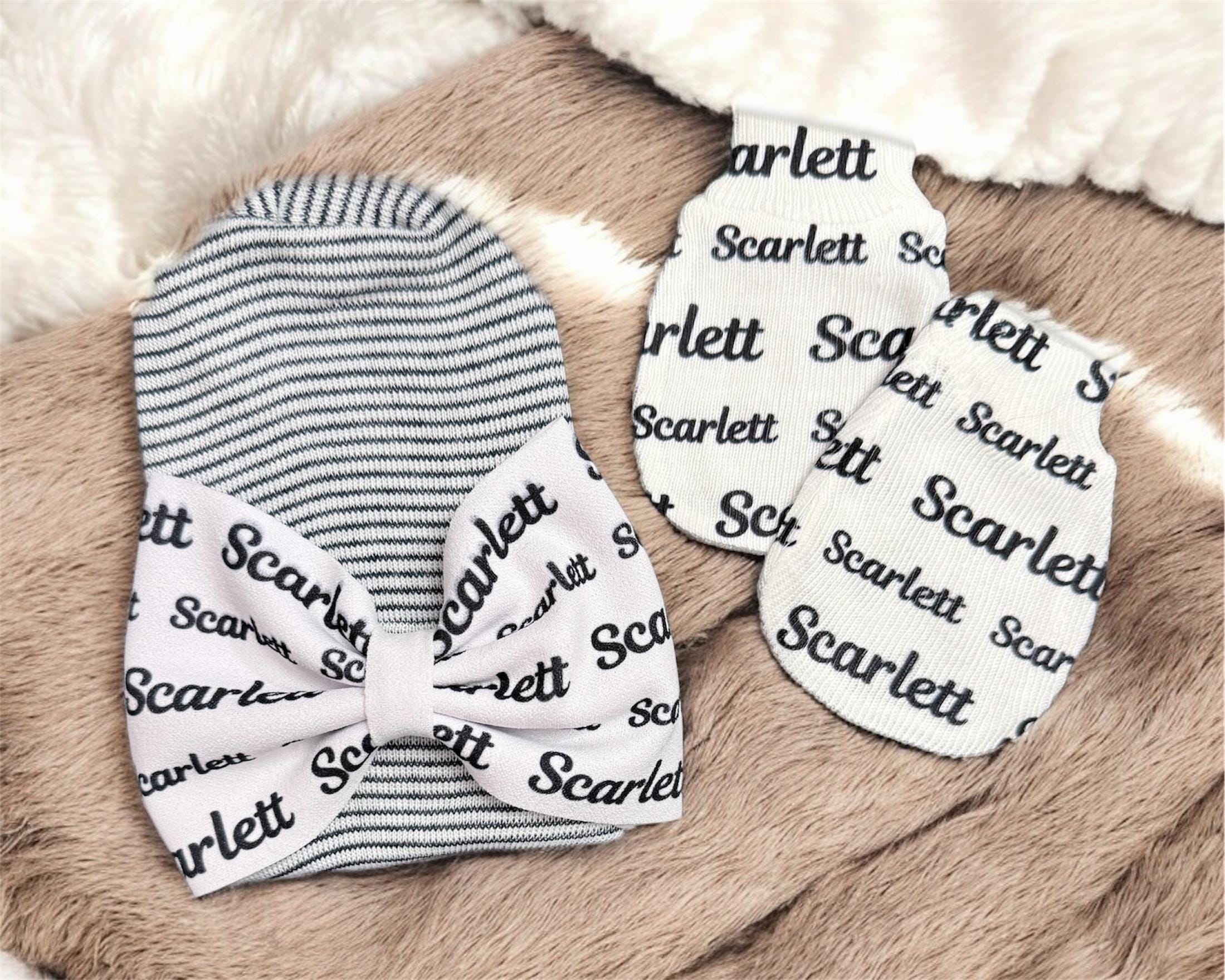 These are cute black and white newborn hat for a girl with a personalized bow with name in black on hat. Option to add matching no scratch mittens. These are great gifts that moms love.