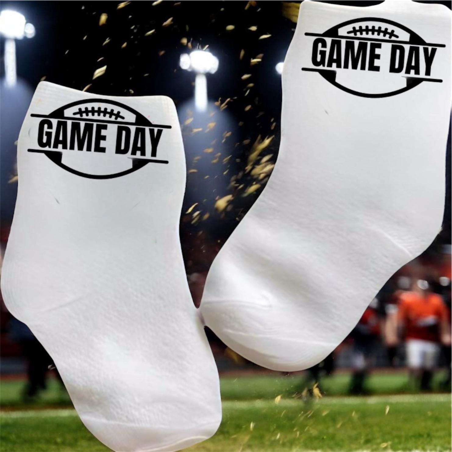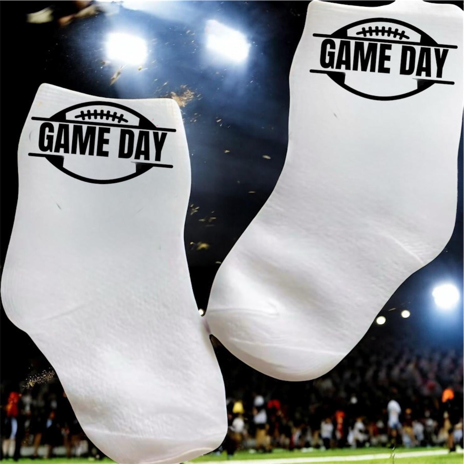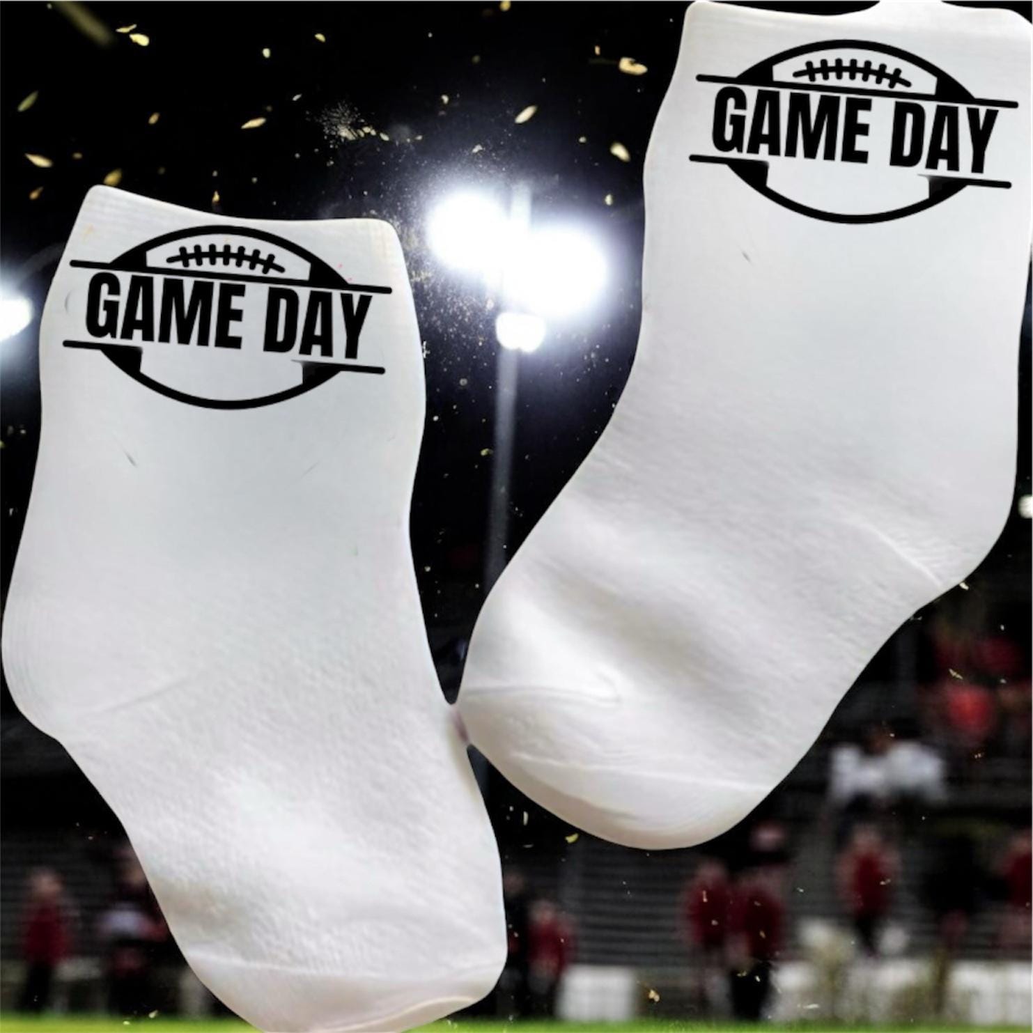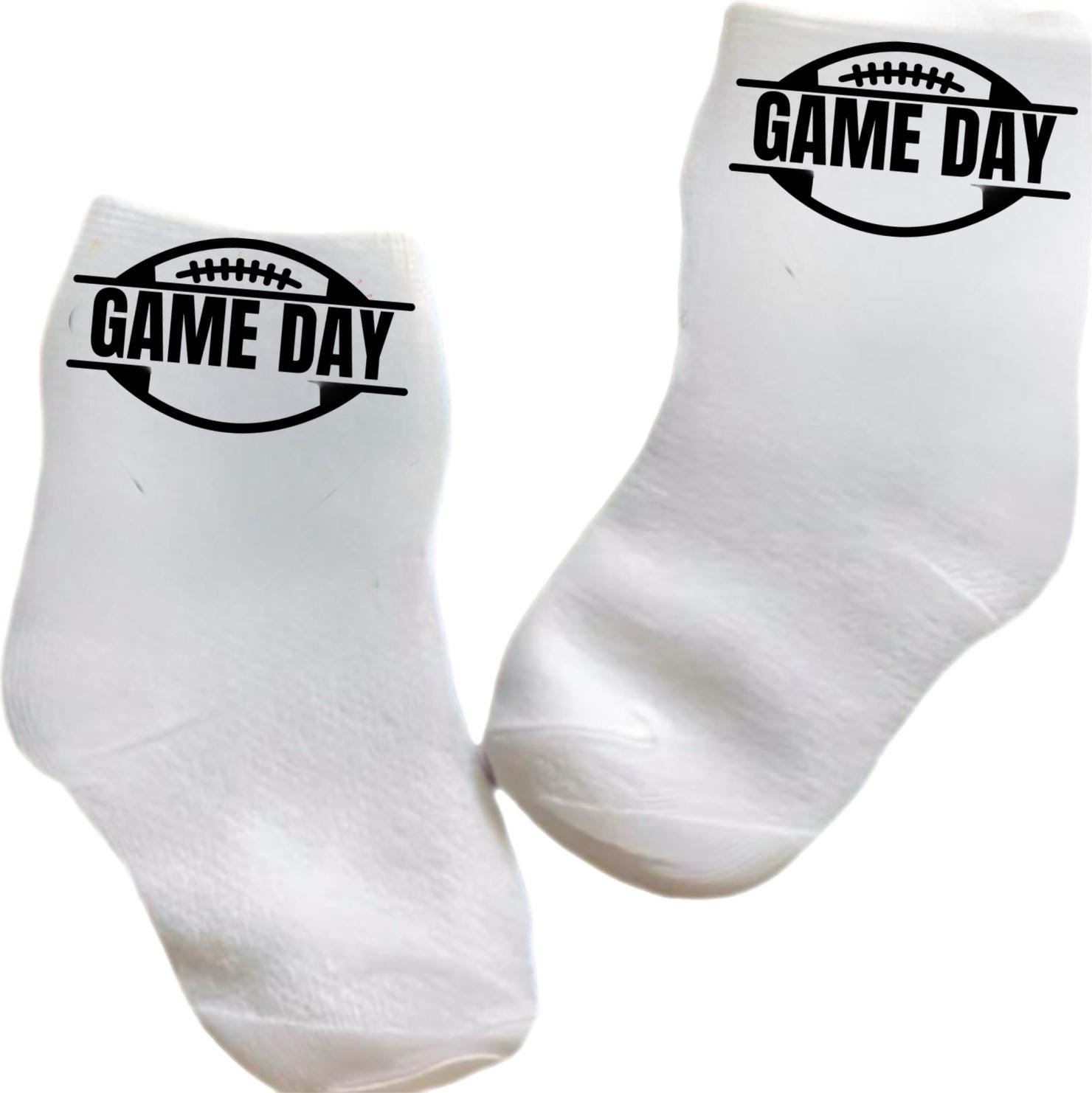 This listing is for a pair of socks for football fan with GAME DAY on them. You choose size from 0-6 months to 10 years at checkout.