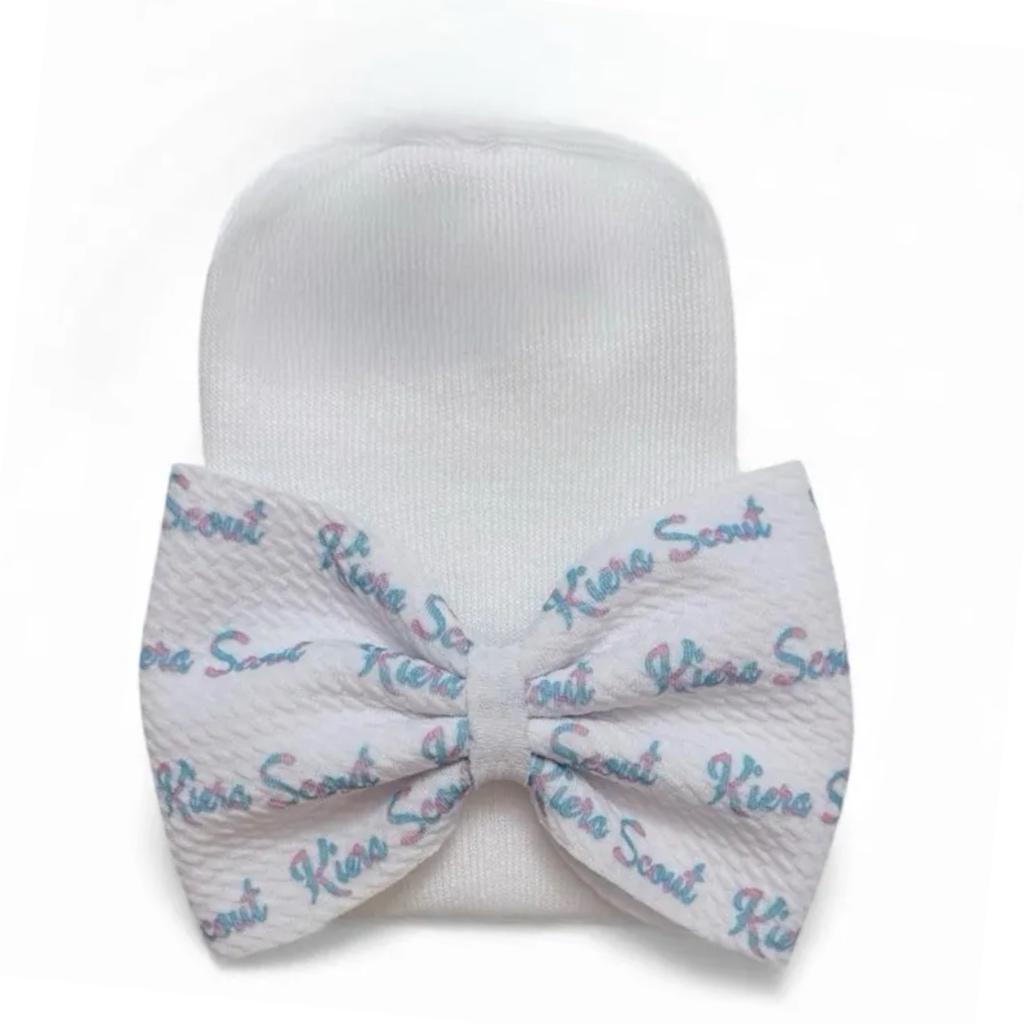 These are pretty bows with or without name on your choice of a white newborn hat, alligator clip OR on a nylon headband. These are great gifts that moms love. These are a best seller that are a great gift too. You can have the name in blue and pink like first image. Black/pink combo, pink/black/gray combo or other.