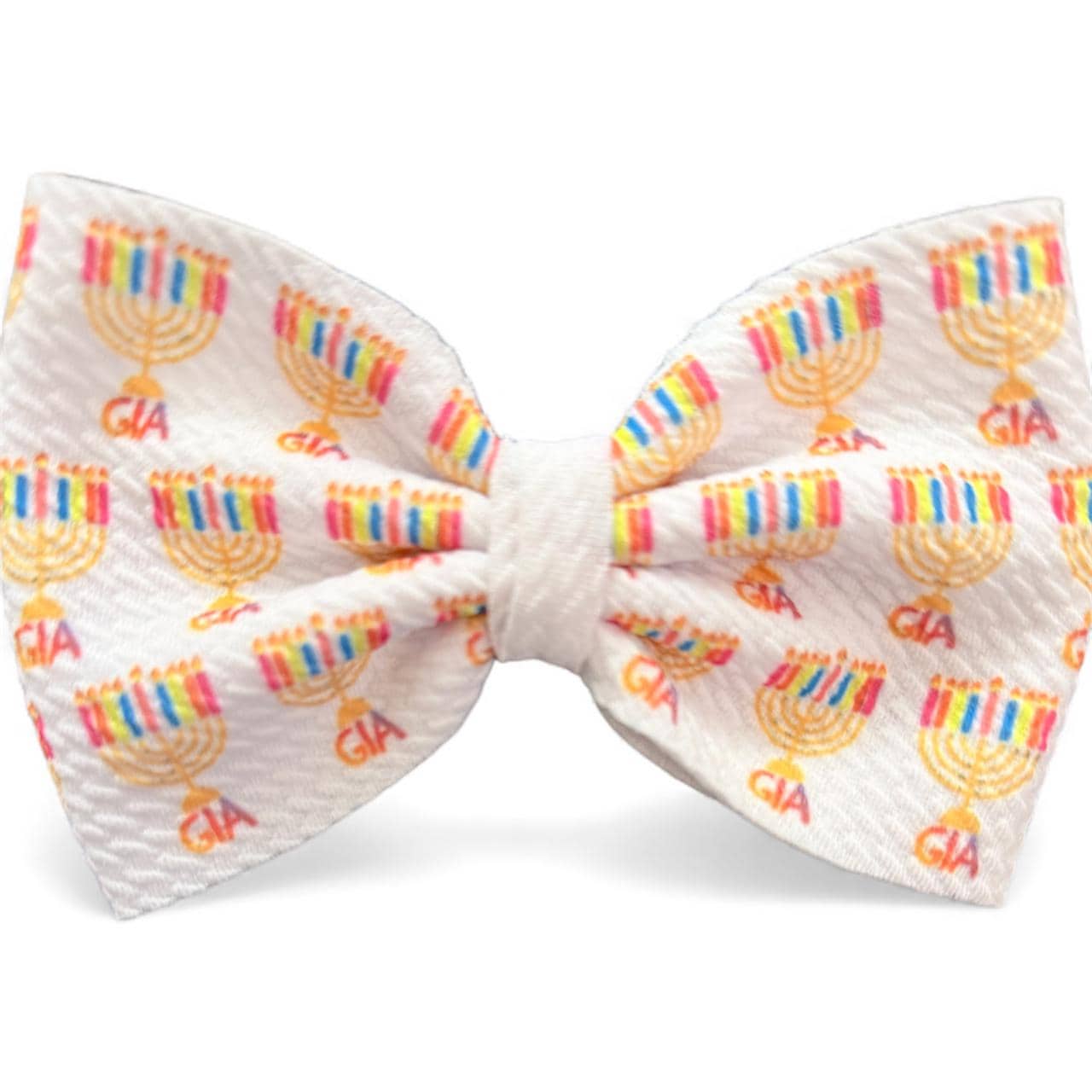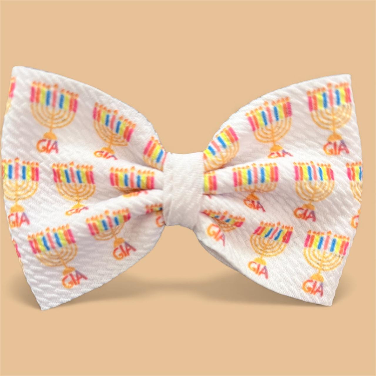 I am so excited to be able to offer these custom Hanukkah bows with menorah and option to add a name on them. You select it on a nylon headband, alligator clip or for a newborn girl, we offer it on a white newborn hat.