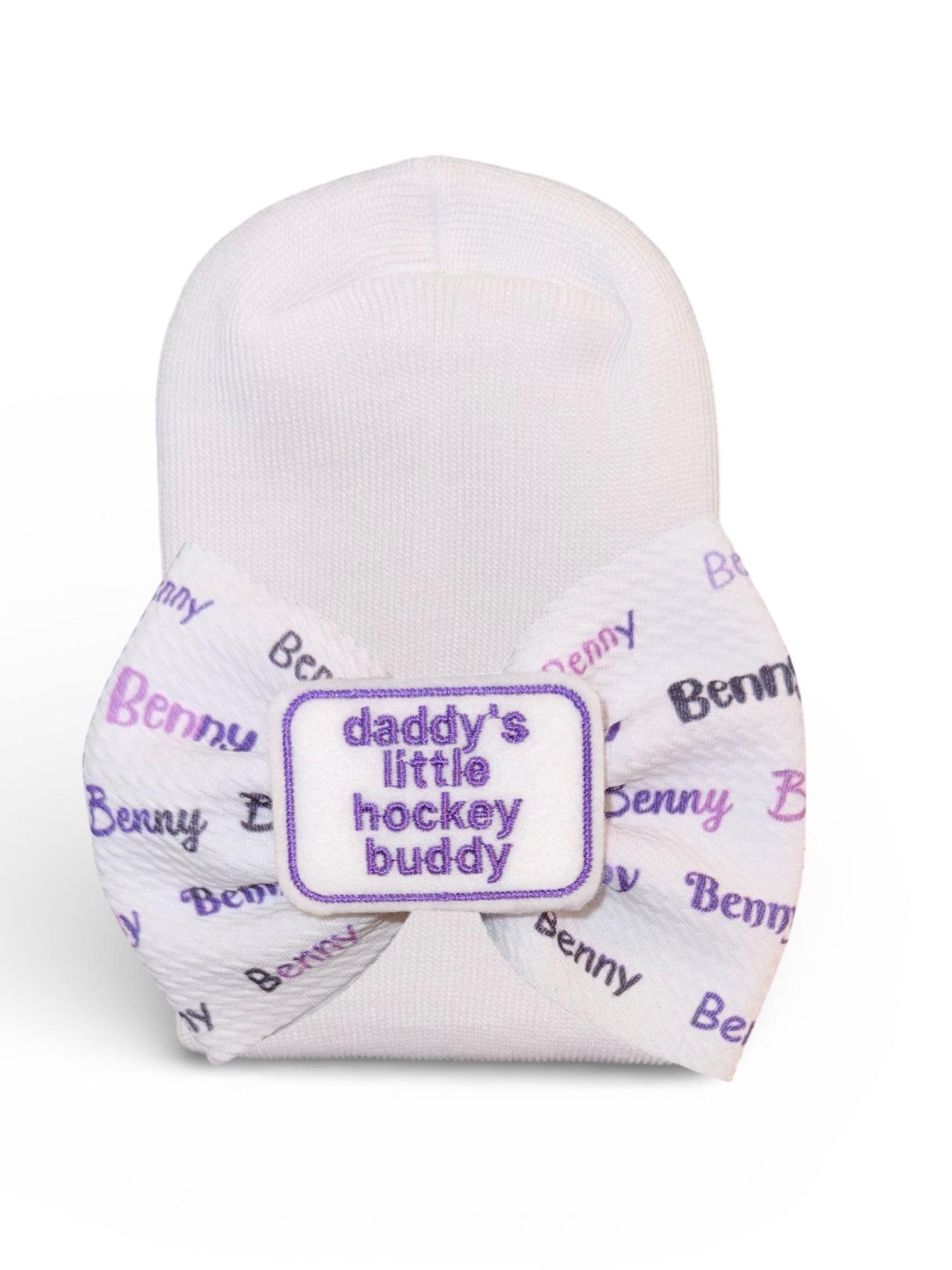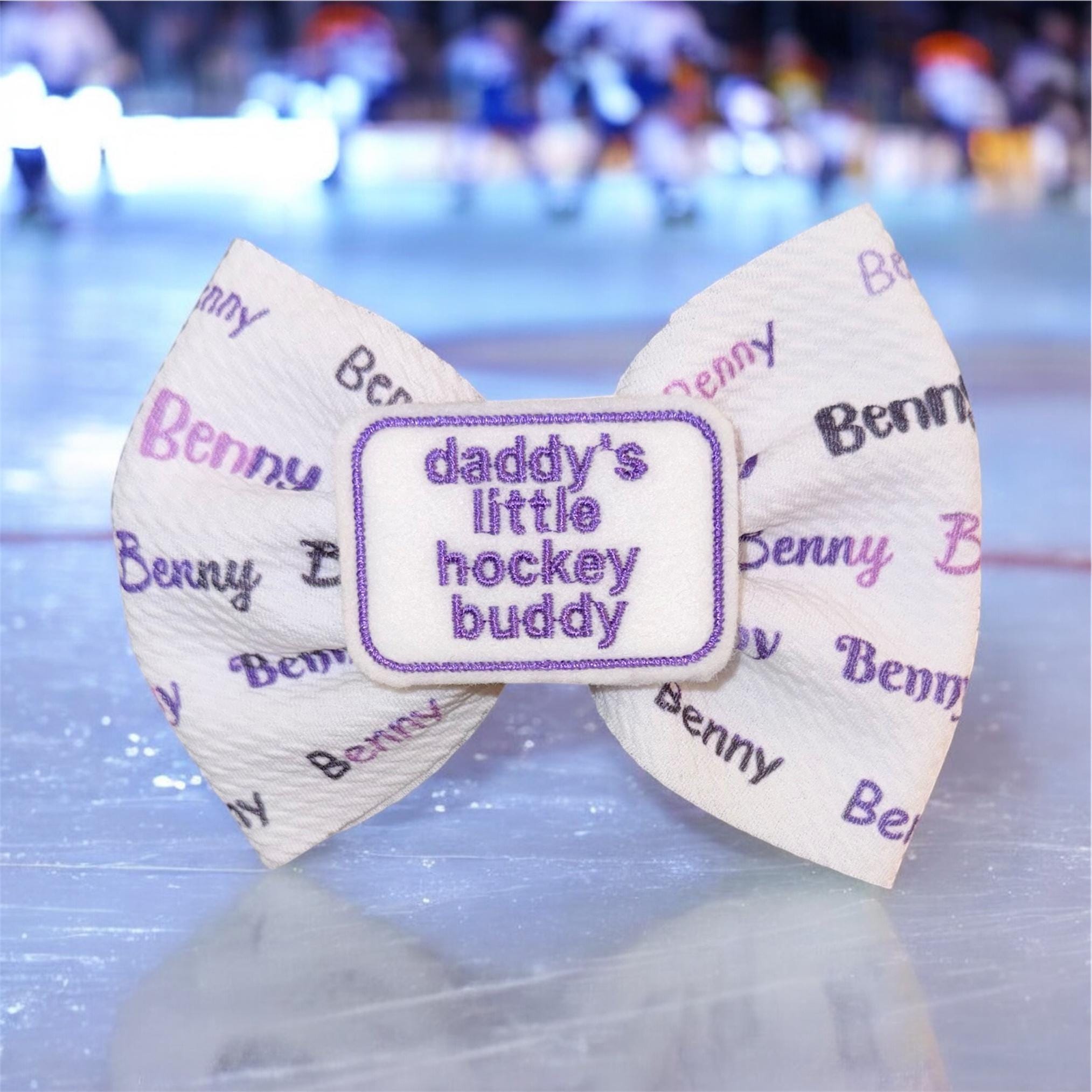 This listing is for a bow with name on it and daddy’s little hockey buddy in your choice of color. Bow can be on newborn hat, nylon headband or alligator clip.