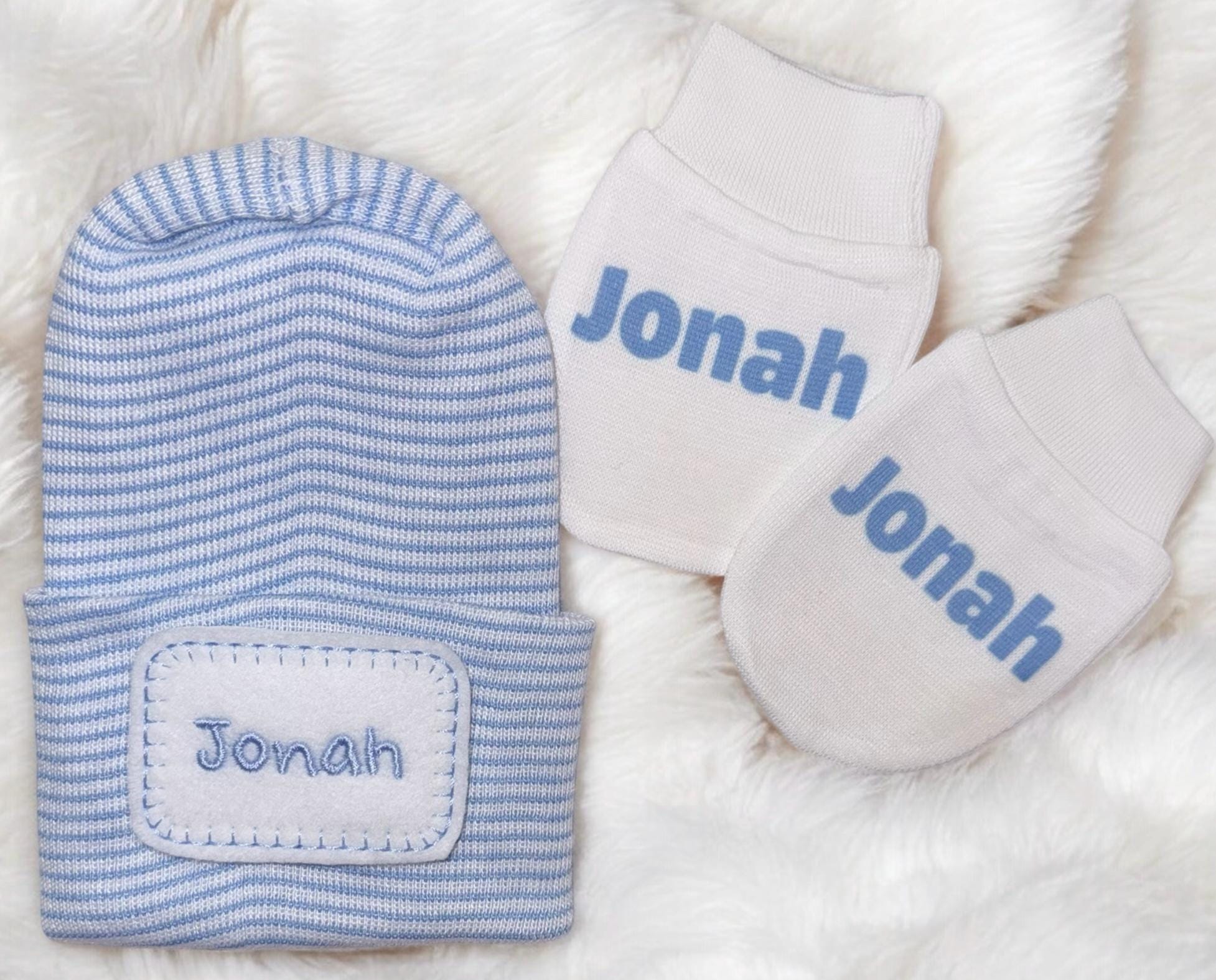 Baby's 1st Keepsake! Newborn hat Monogramed with name and no scratch mittens. You choose hat color. The name on mittens will be same color as name on hat unless name is in white and then we will use best discretion to select matching name color for mittens.