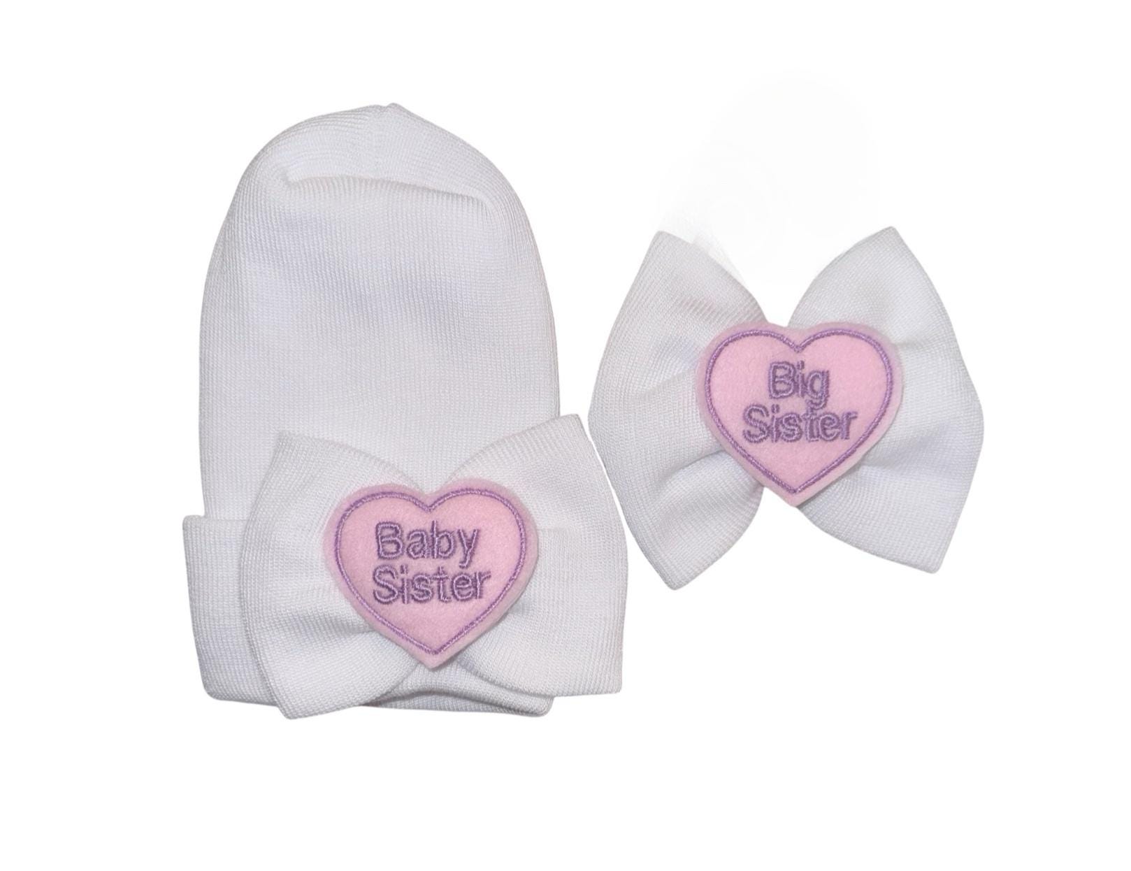 White newborn hat with baby sister and Middle Sister bow AND a Big sister bows on alligator clips.