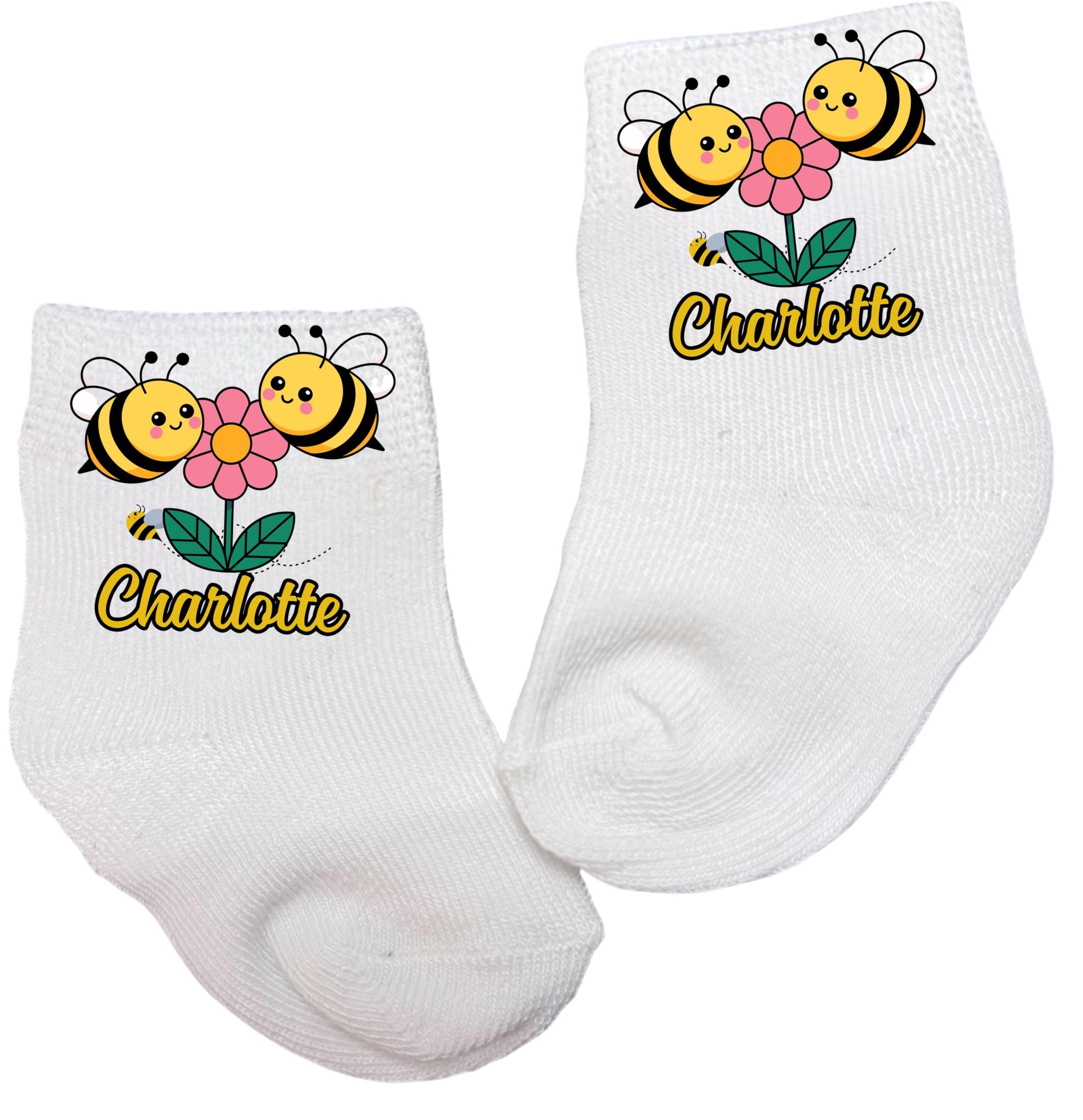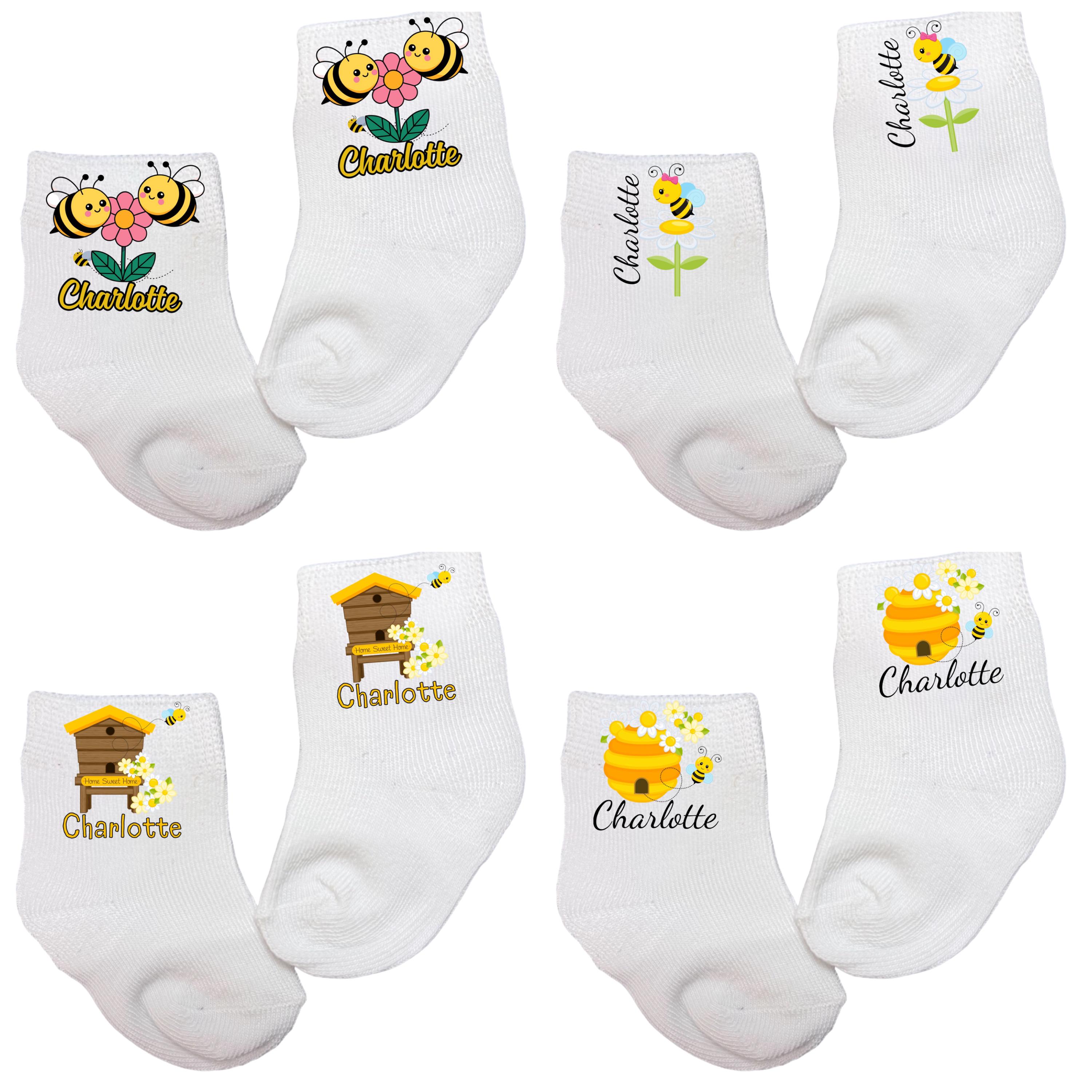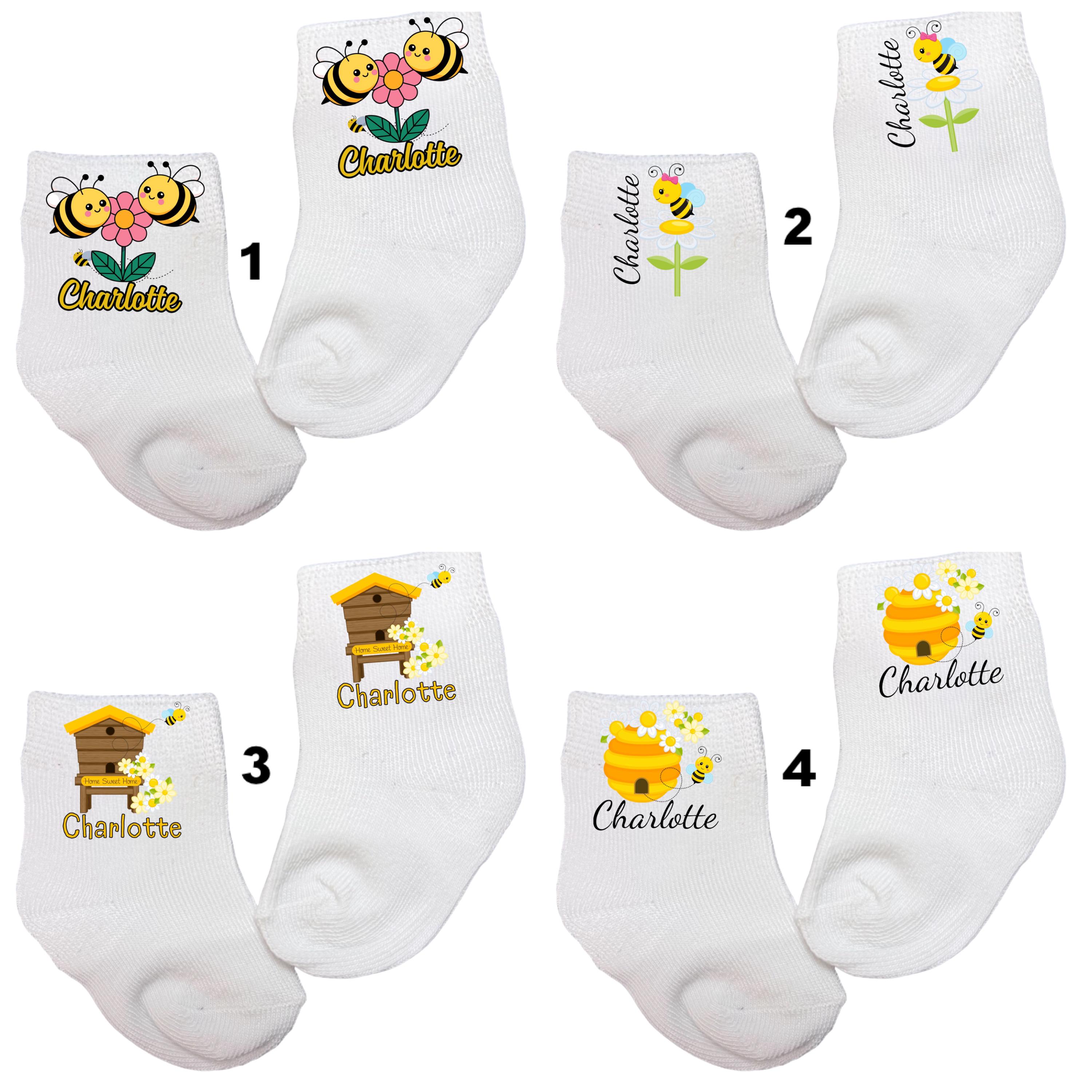 This listing is for an adorable pair of bee socks in your choice design with or without name. Offered in sizes from 0-6 months to 14 years. You select at checkout. You choose. This listing is for 1 pair of socks.