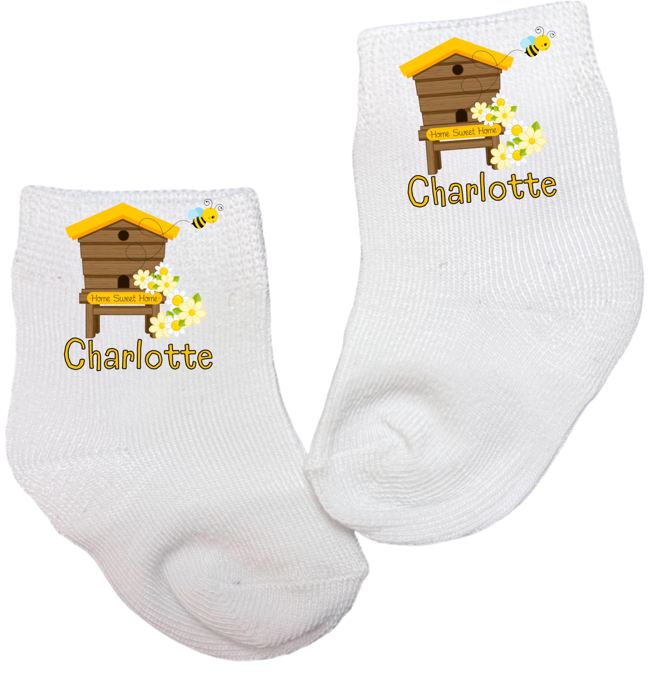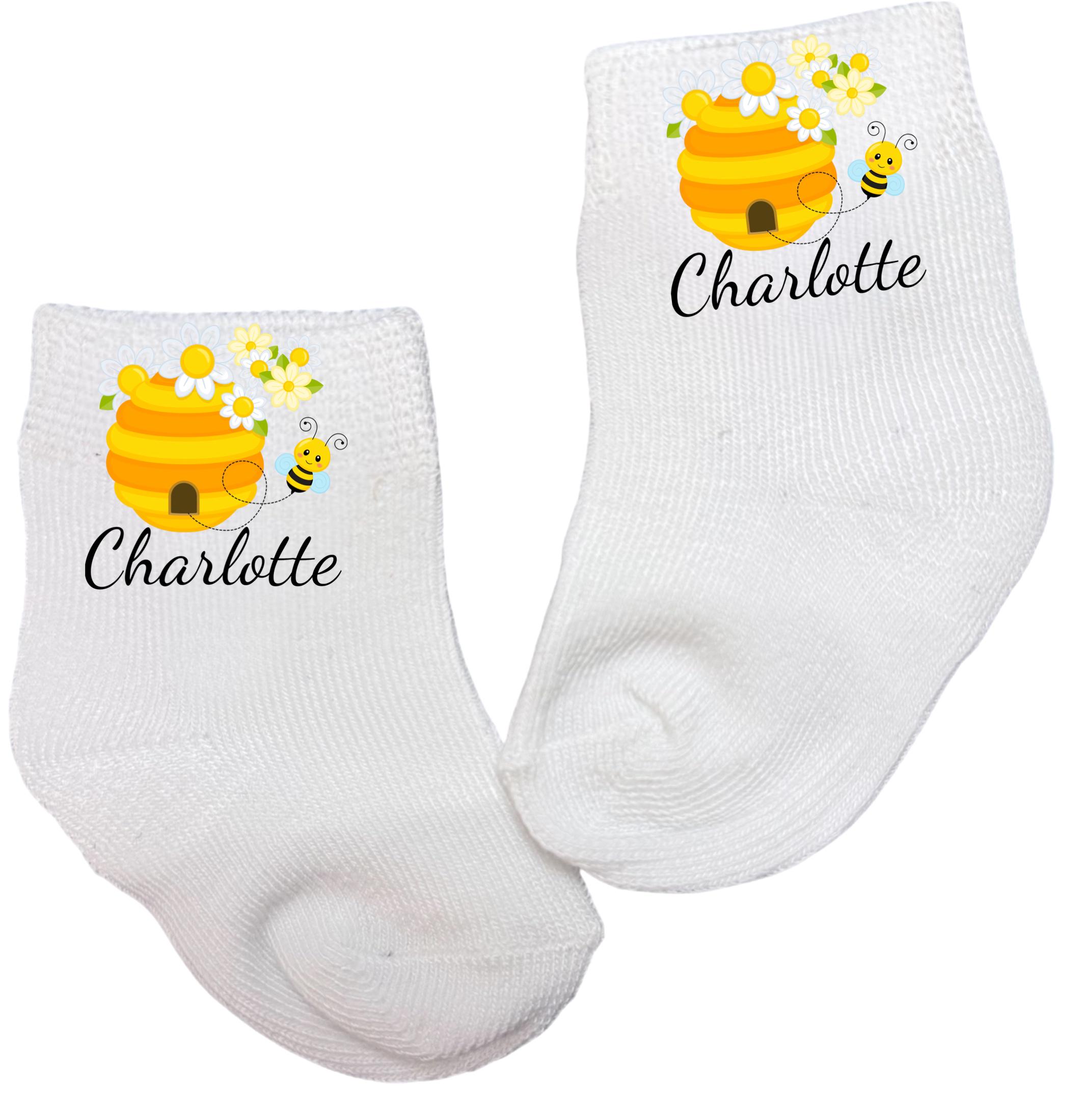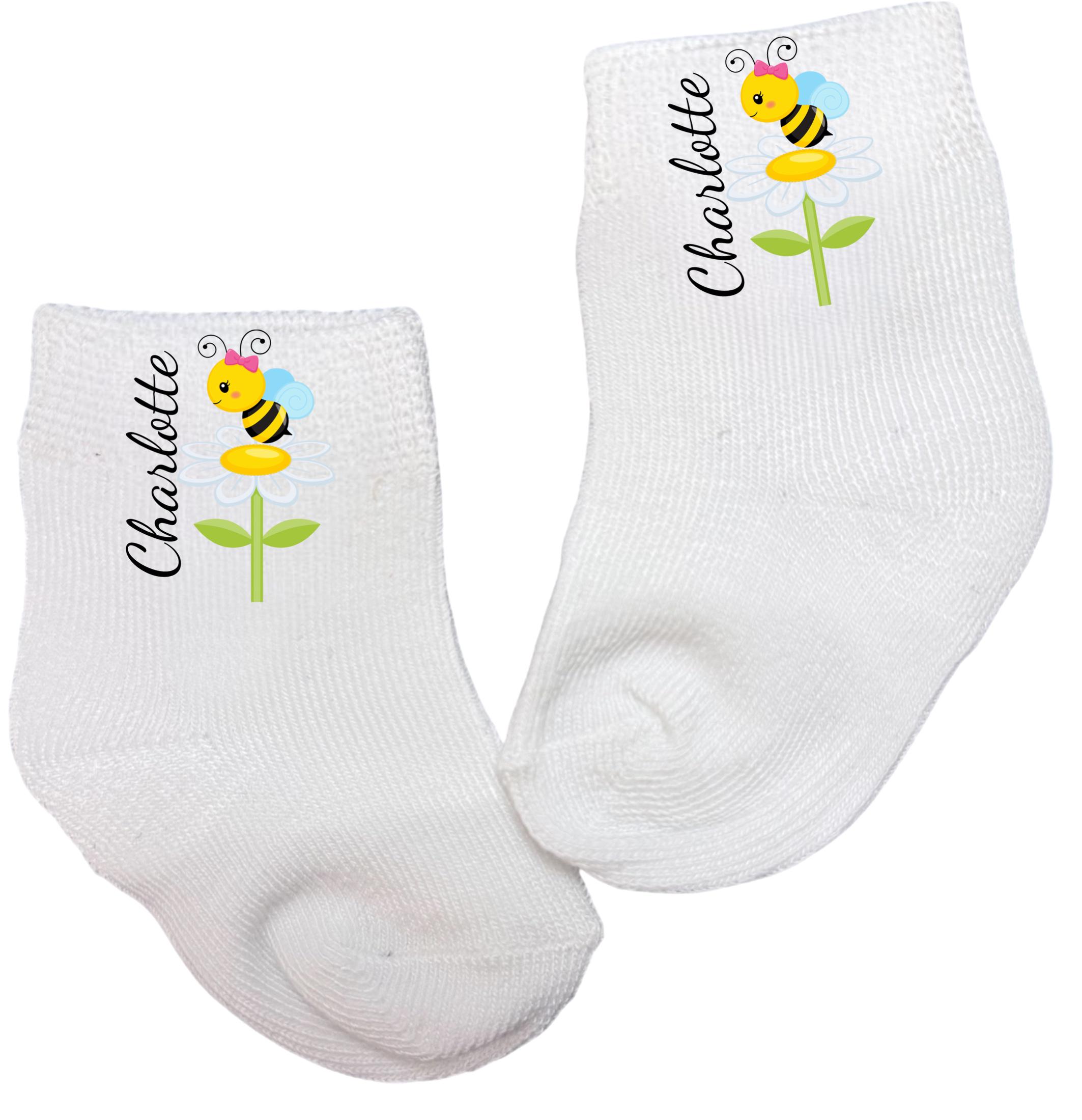 This listing is for an adorable pair of bee socks in your choice design with or without name. Offered in sizes from 0-6 months to 14 years. You select at checkout. You choose. This listing is for 1 pair of socks.