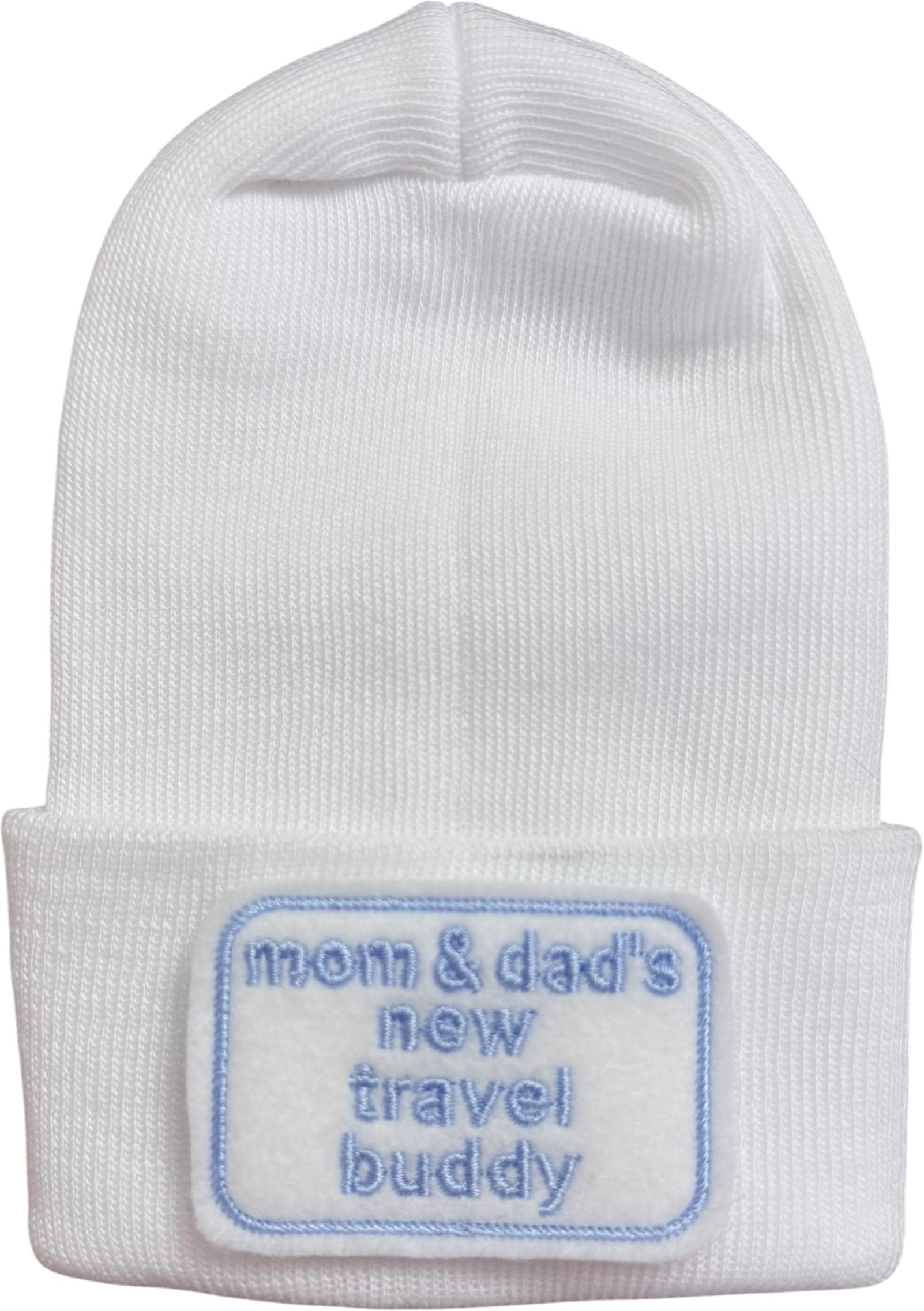 Baby hat with mom & dad’s new travel buddy. Perfect for the baby of anyone who loves to travel or travel agent. Baby's 1st keepsake. You choose word color at checkout.