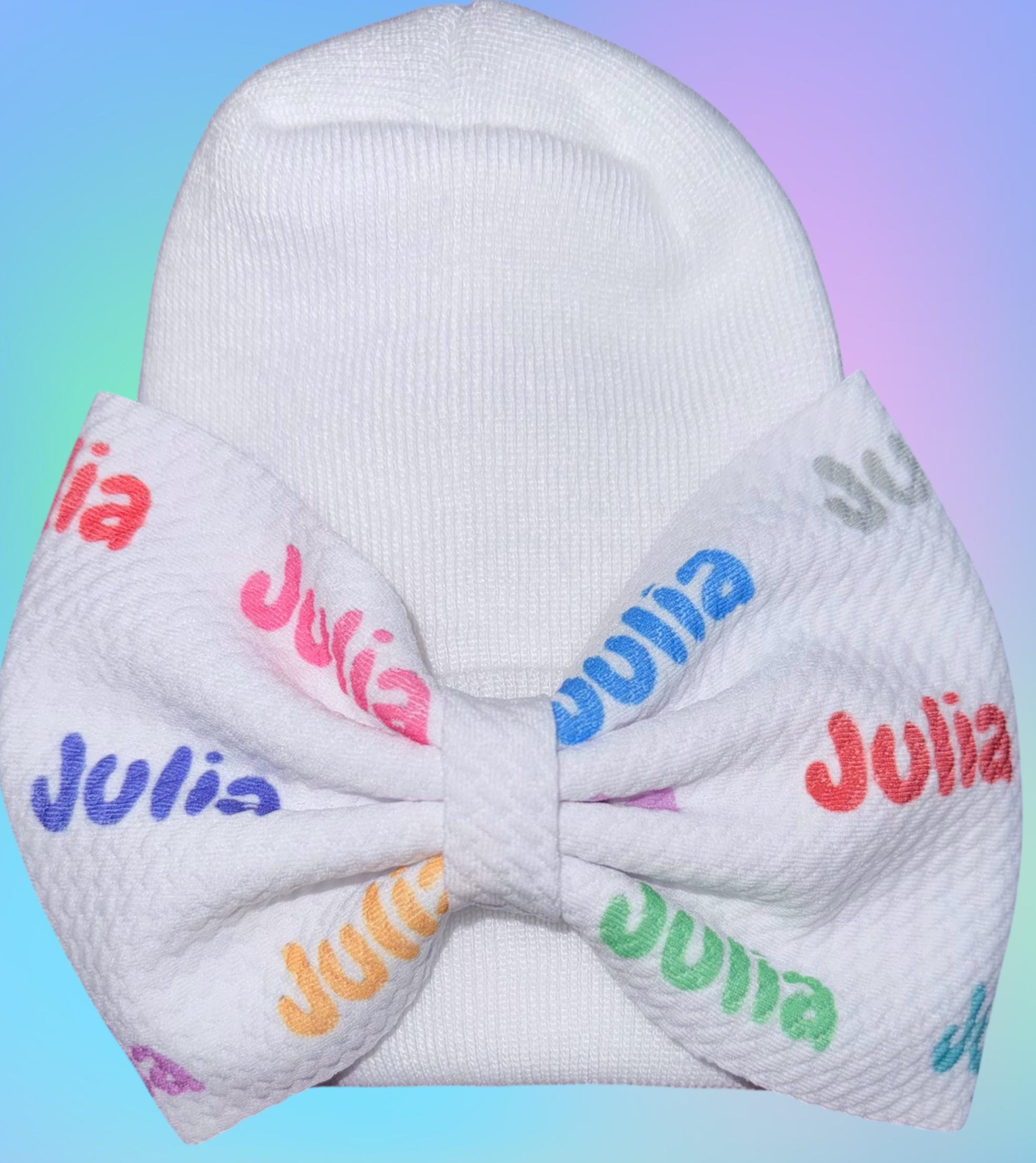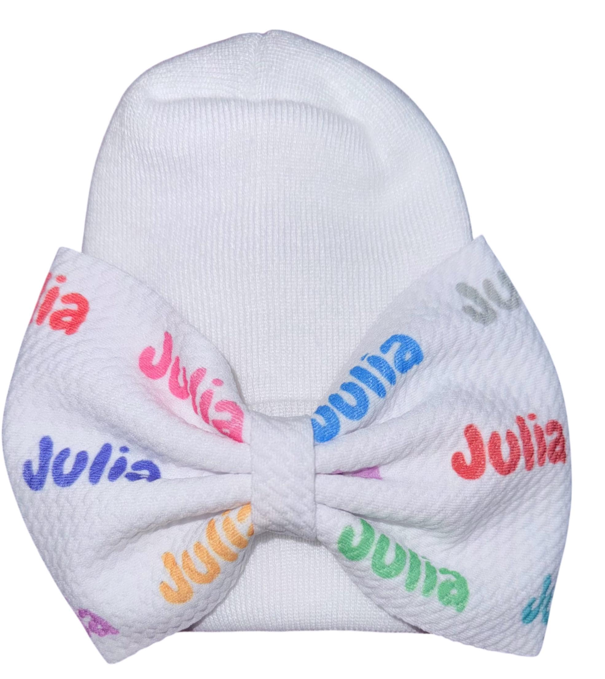 I am so excited to be able to offer these newborn white hats OR headband or alligator clip with a bow that has name on it in multiple colors. You select hat, headband or alligator Clip at checkout ♥ A Posh Baby Loves exclusive! Newborn hospital hat. Baby Girl beanie hospital hat to have for her upon arrival! Official hospital grade hospital hat so it'll fit snug and will be perfect to wear going home and Cute for pictures. You have option to have bow on headband instead of hat. You choose at checkout.