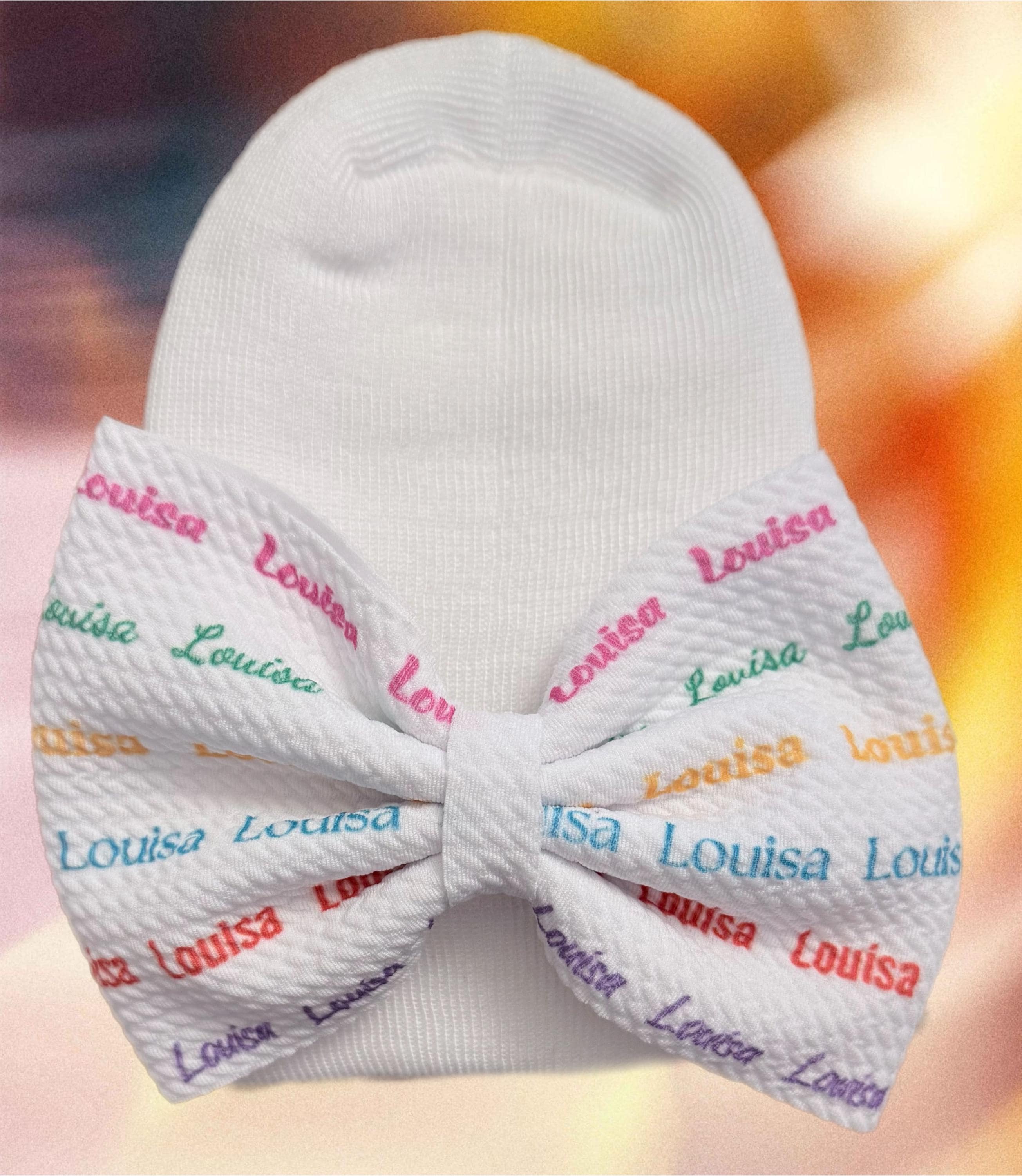 I am so excited to be able to offer these newborn white hats OR headband with a bow that has your Baby’s name on it! You select hat and name color at checkout ♥ A Posh Baby Loves exclusive! Newborn hospital hat. Baby Girl beanie hospital hat to have for her upon arrival! Official hospital grade hospital hat so it'll fit snug and will be perfect to wear going home and Cute for pictures. You have option to have bow on headband instead of hat. You choose at checkout.