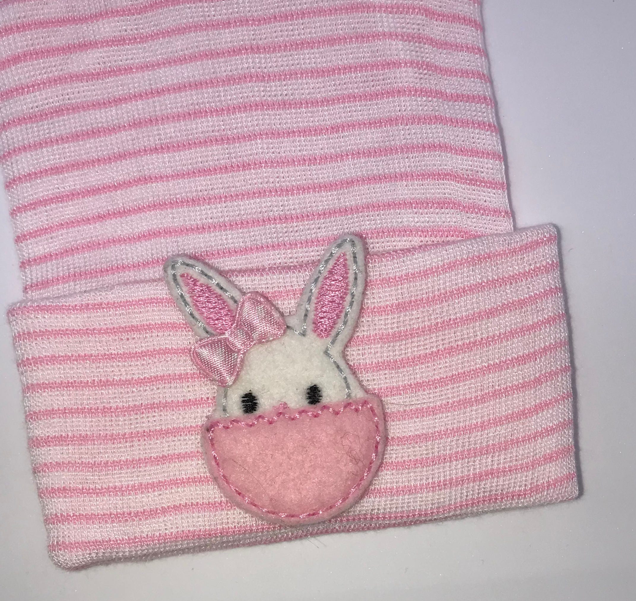 This listing is for a super cute newborn hospital hat. This is a pink and white stripe hospital hat and is perfect for your new addition! It's topped off with an adorable Bunny in egg. Hospital hat will be perfect to have for baby upon arrival letting the world know your baby has arrived! It'll fit snug, won't fall off and will be perfect to wear in hospital and on the way home.