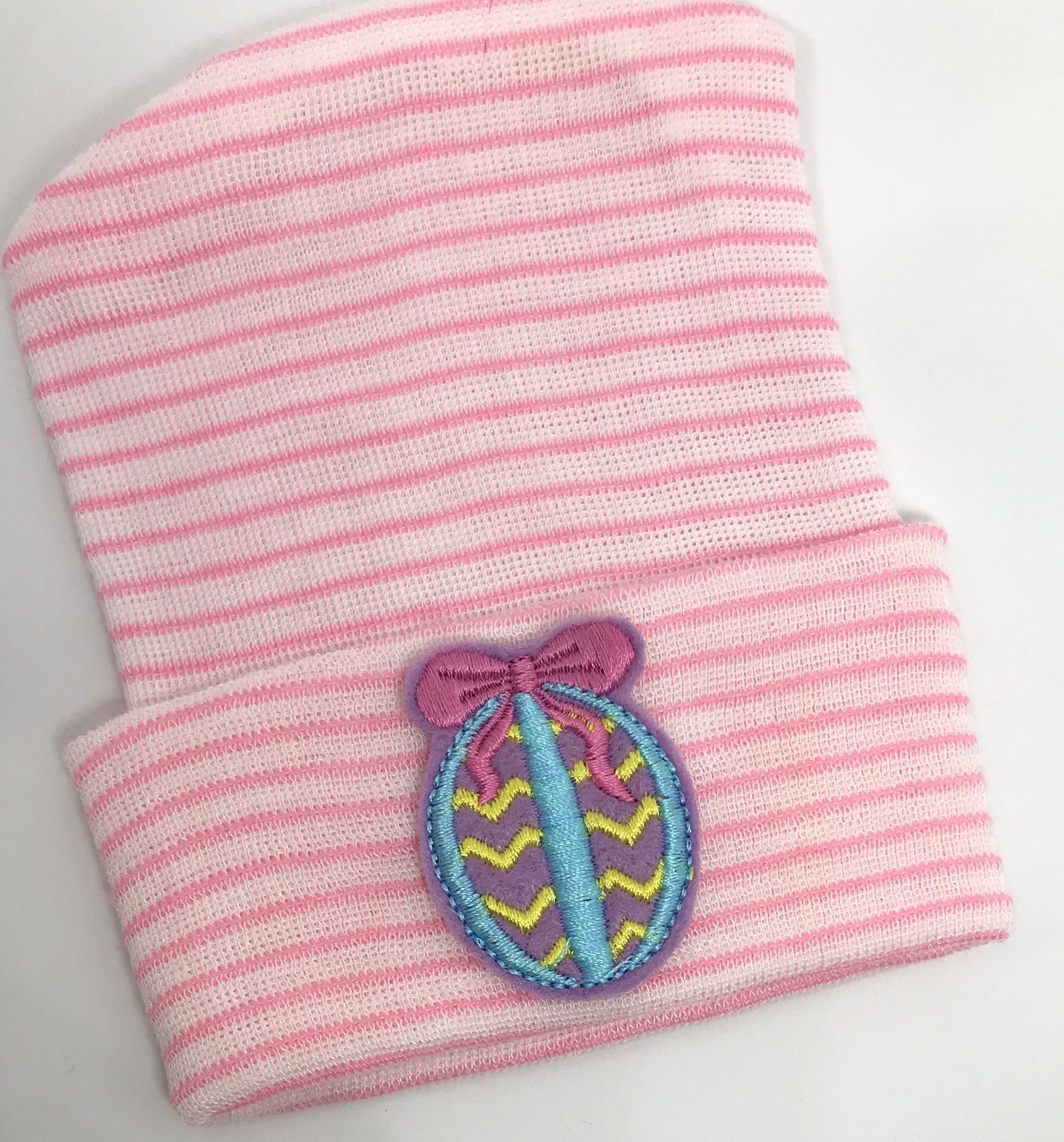 This listing is for an adorable pink and white stripe newborn hospital hat with colorful Easter egg applique for your baby!