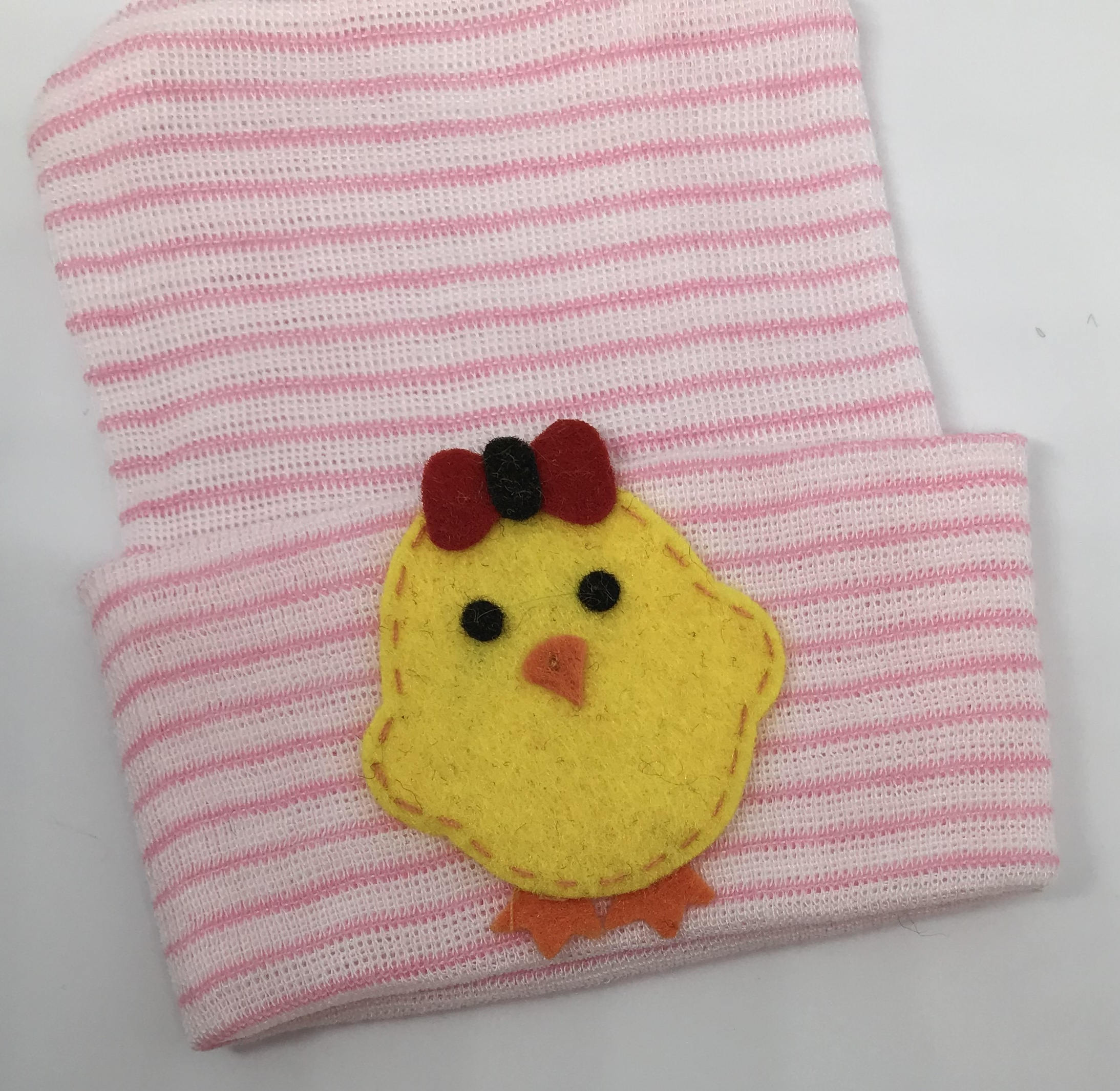 This listing is for a super cute newborn hospital hat. This is a pink and white stripe hospital hat and is perfect for your new addition! It's topped off with an adorable Yelloe chick! Hospital hat will be perfect to have for baby upon arrival letting the world know your baby has arrived! It'll fit snug, won't fall off and will be perfect to wear in hospital and on the way home.