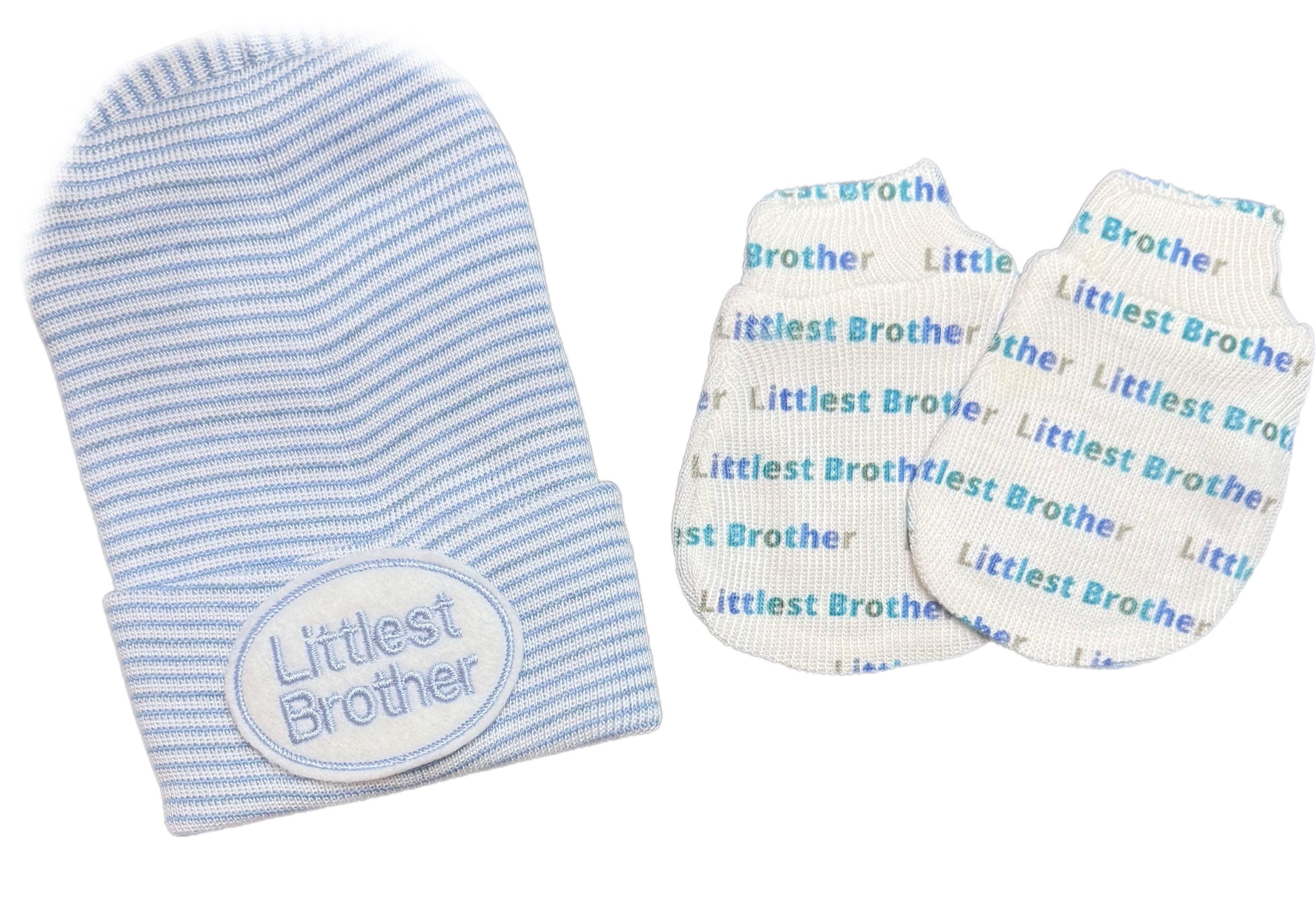 This listing is for a newborn baby hospital hat now with a blue littlest brother applique on a blue/white hat with option to add Littlest Brother no scratch mittens. Baby boy beanie hospital hat to have for him upon arrival! Cute for pictures. This makes a perfect baby shower gift or baby gift and will look adorable on your baby in the hospital nursery as well as part of his going home outfit. Everyone will be commenting on him with his new hat on!