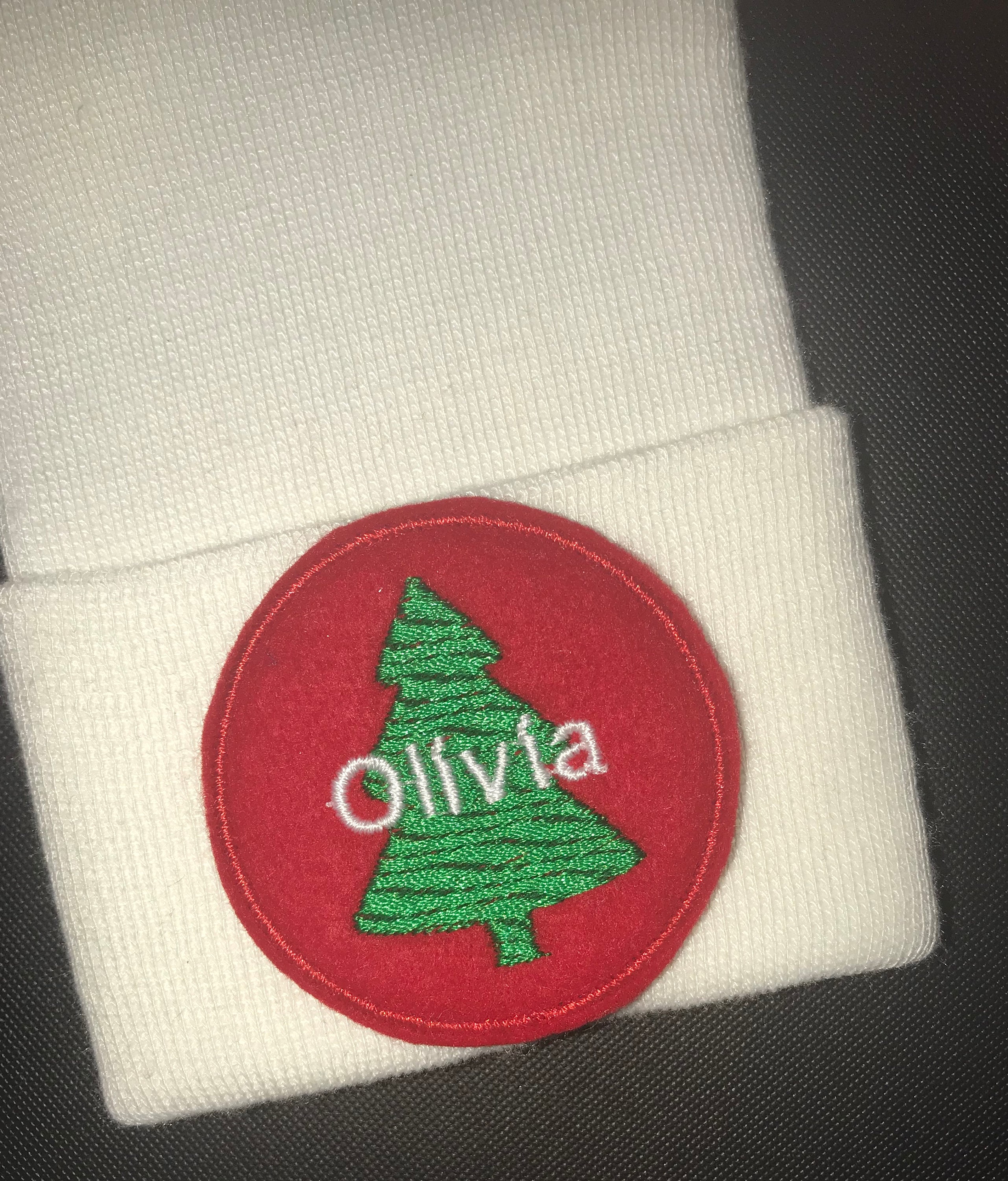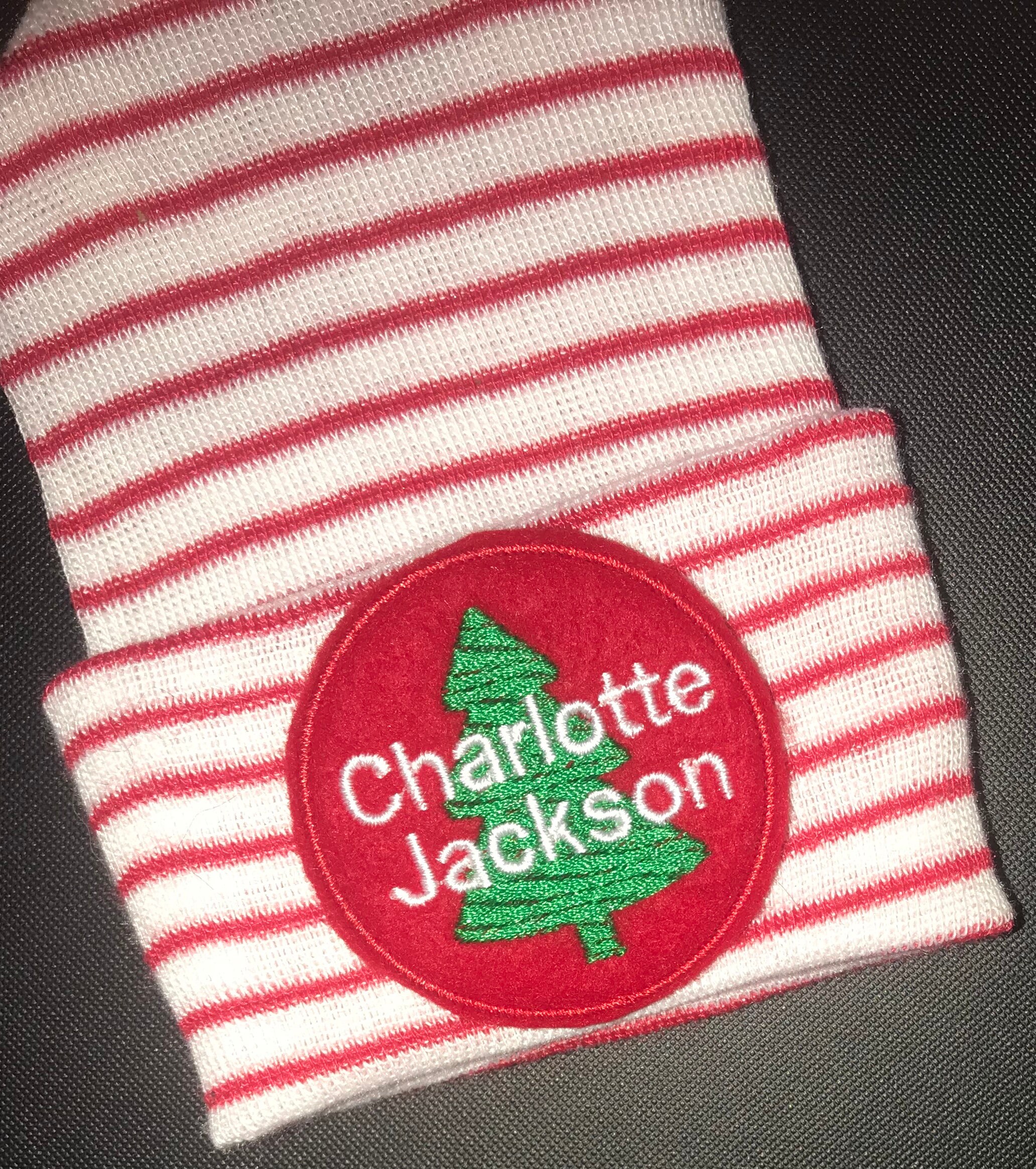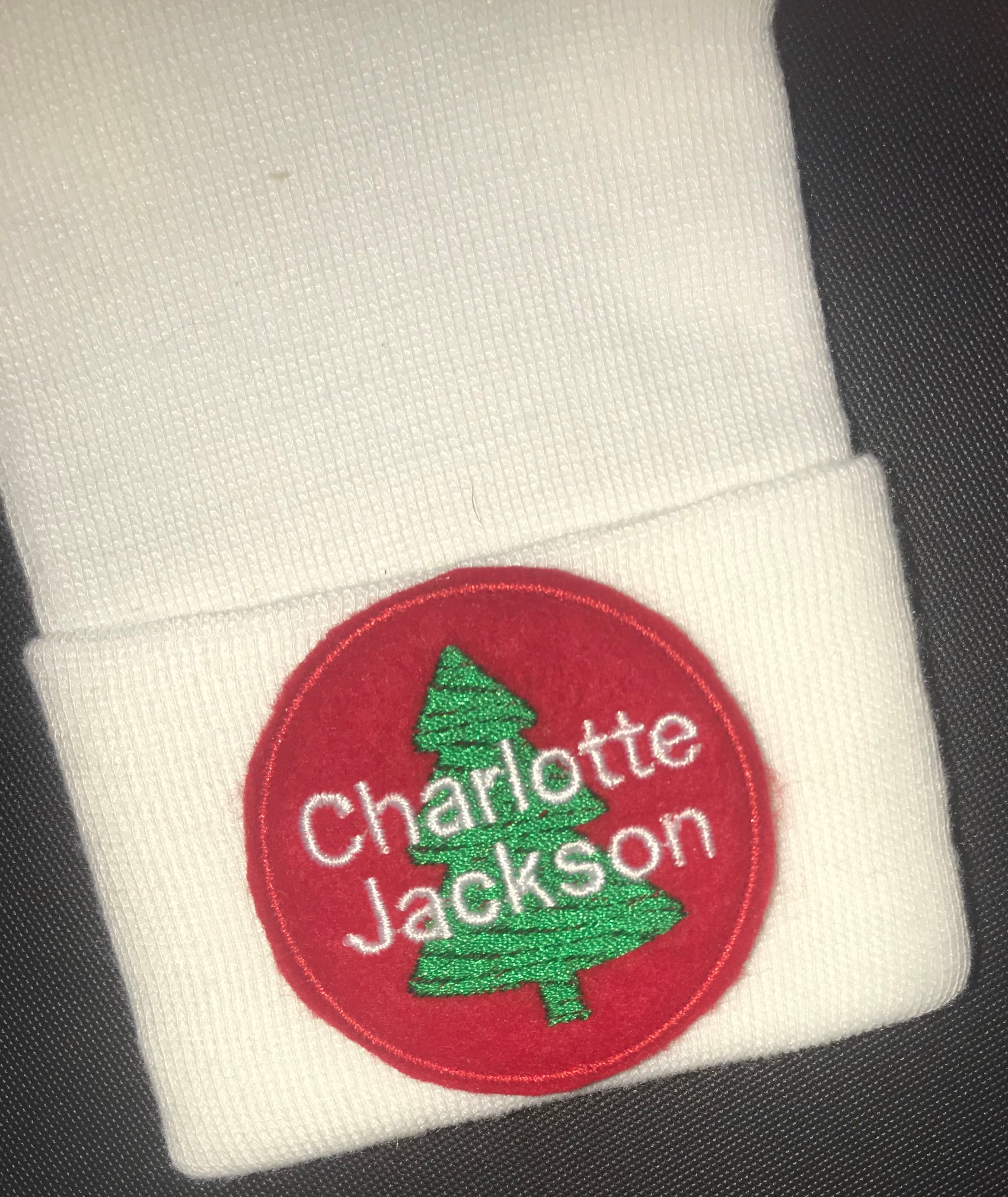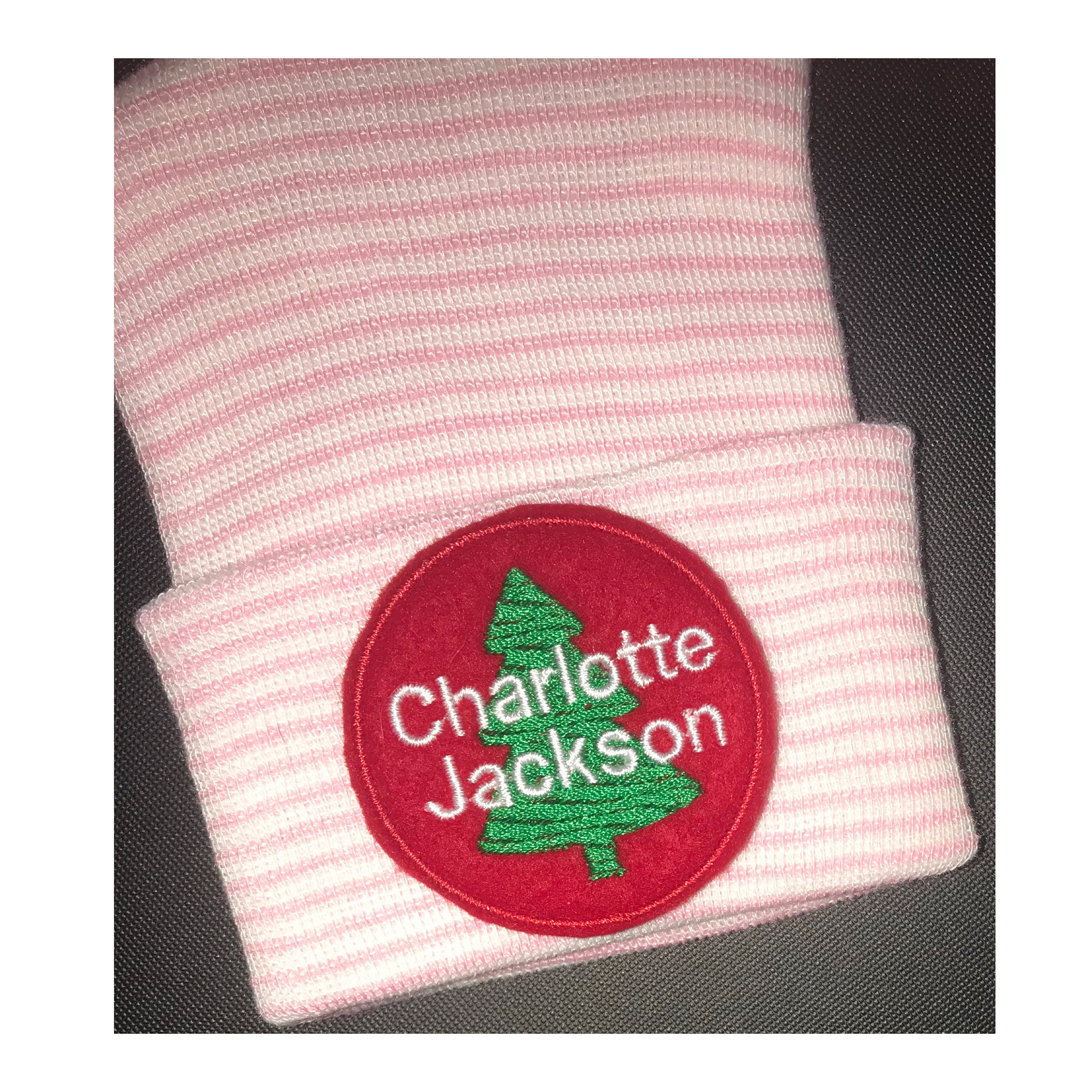 This listing is for a super cute newborn hospital hat with Your baby’s name on a Christmas tree.  You can do first and middle or just first name. PERFECT for those 1st Christmas pictures!! For BOY OR GIRL