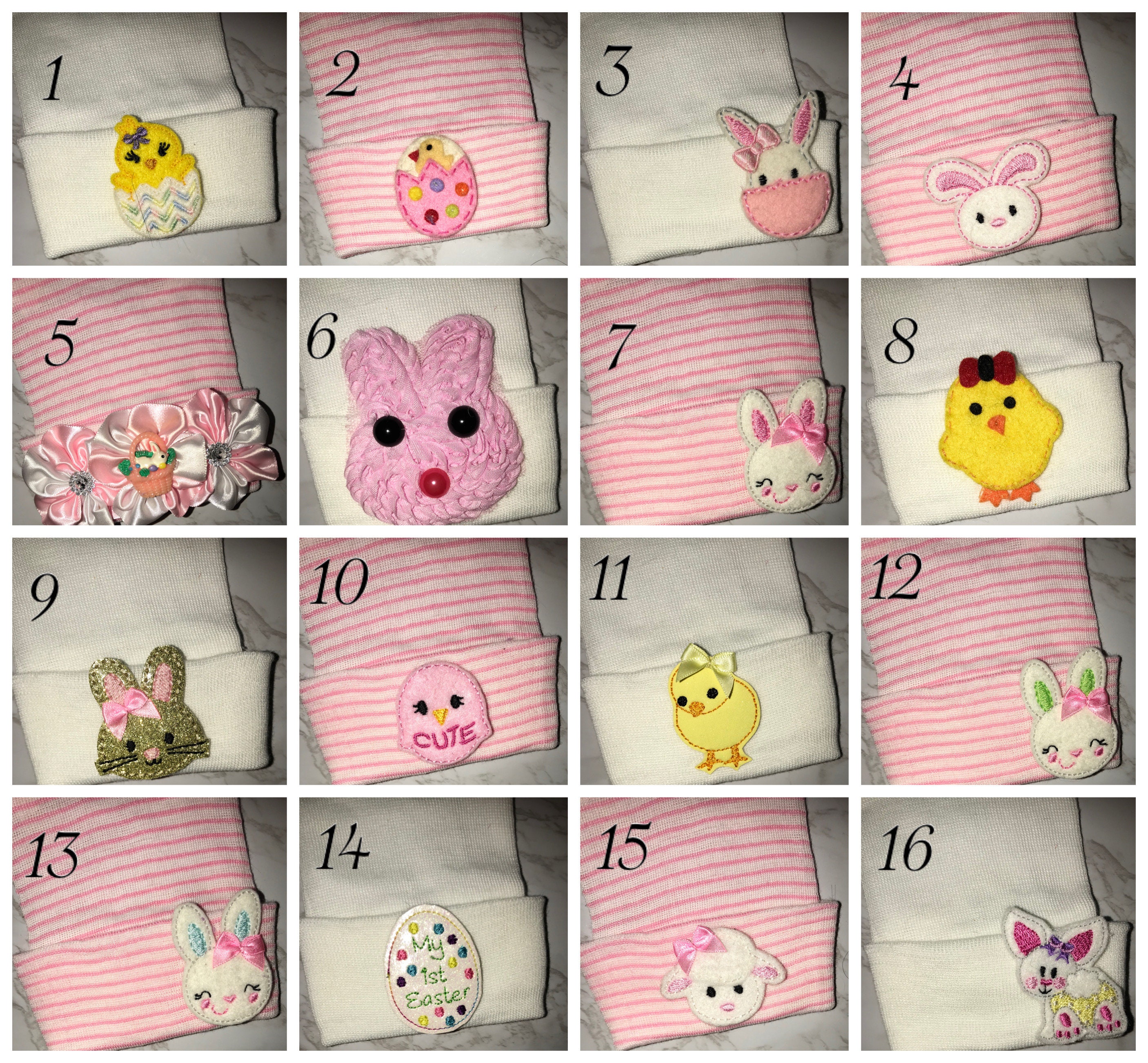 This listing is for some of the Easter newborn hospital hat we offer. You choose hat color and applique at checkout. Hospital hat will be perfect to have for baby upon arrival letting the world know your baby has arrived! It'll fit snug, won't fall off and will be perfect to wear in hospital and on the way home.