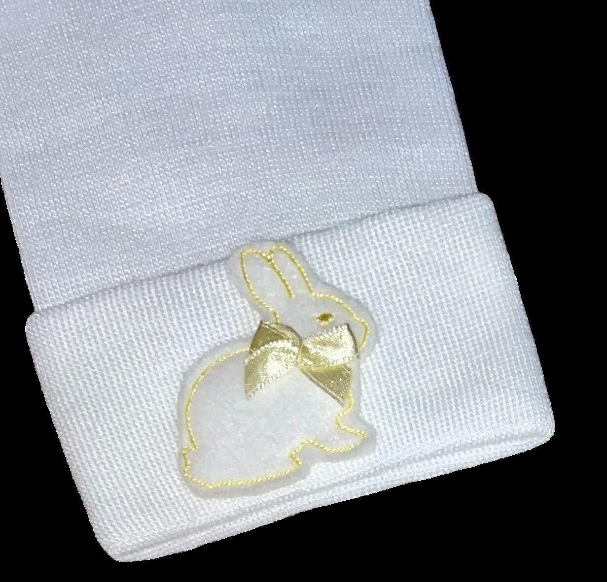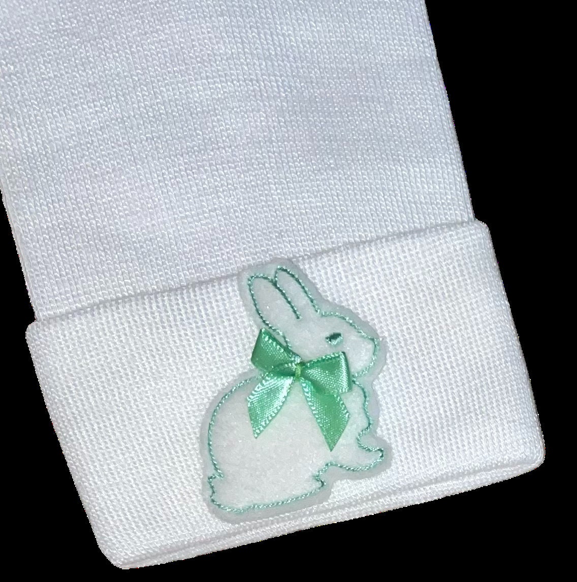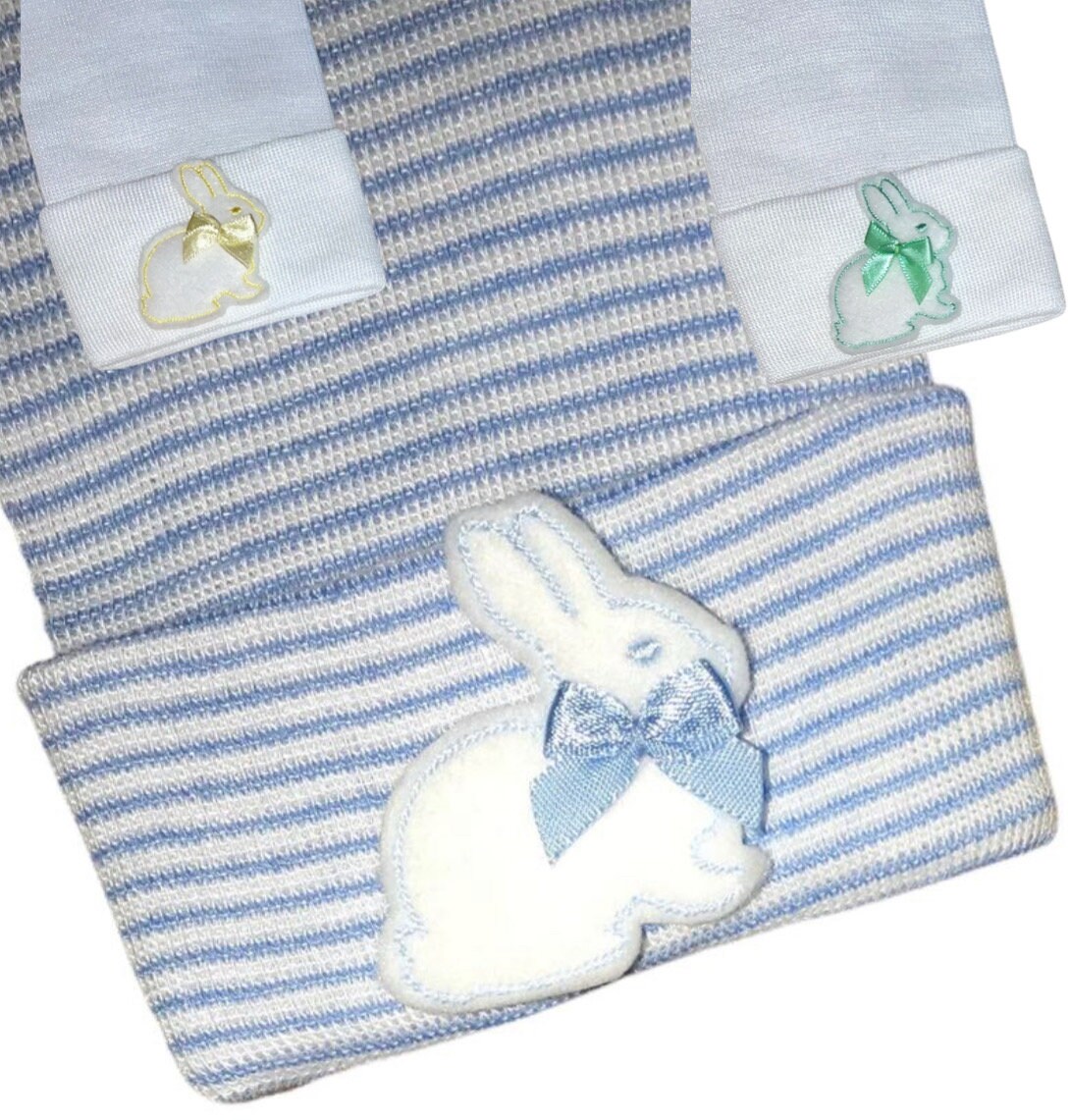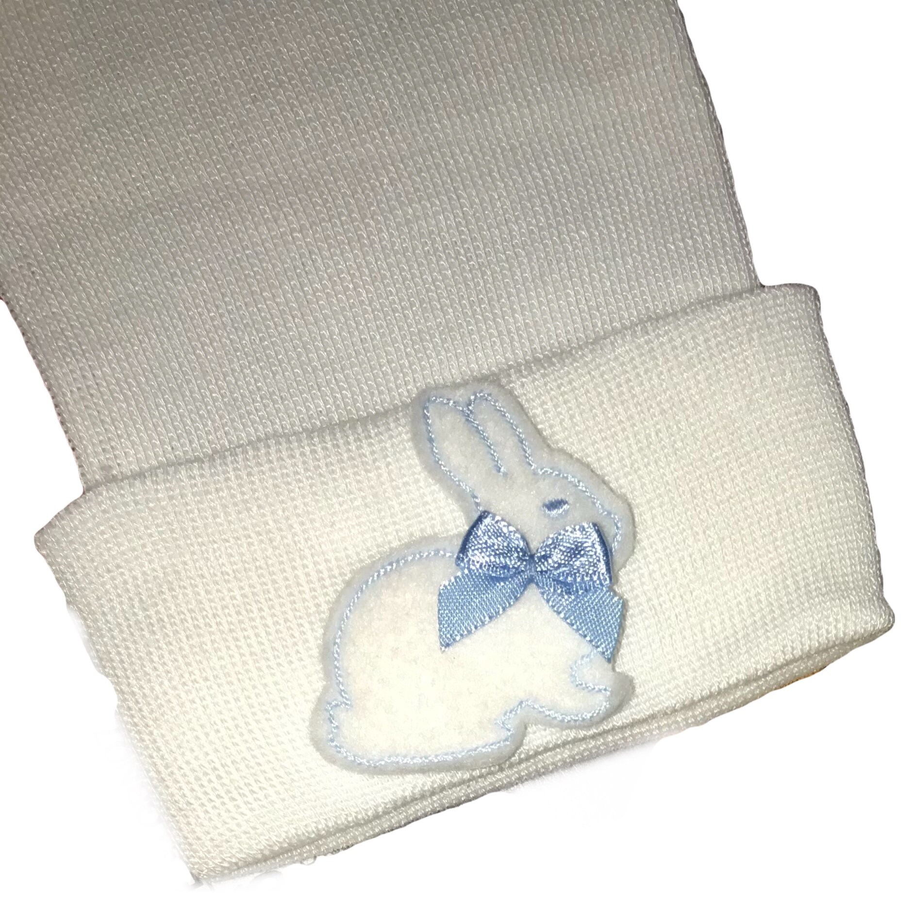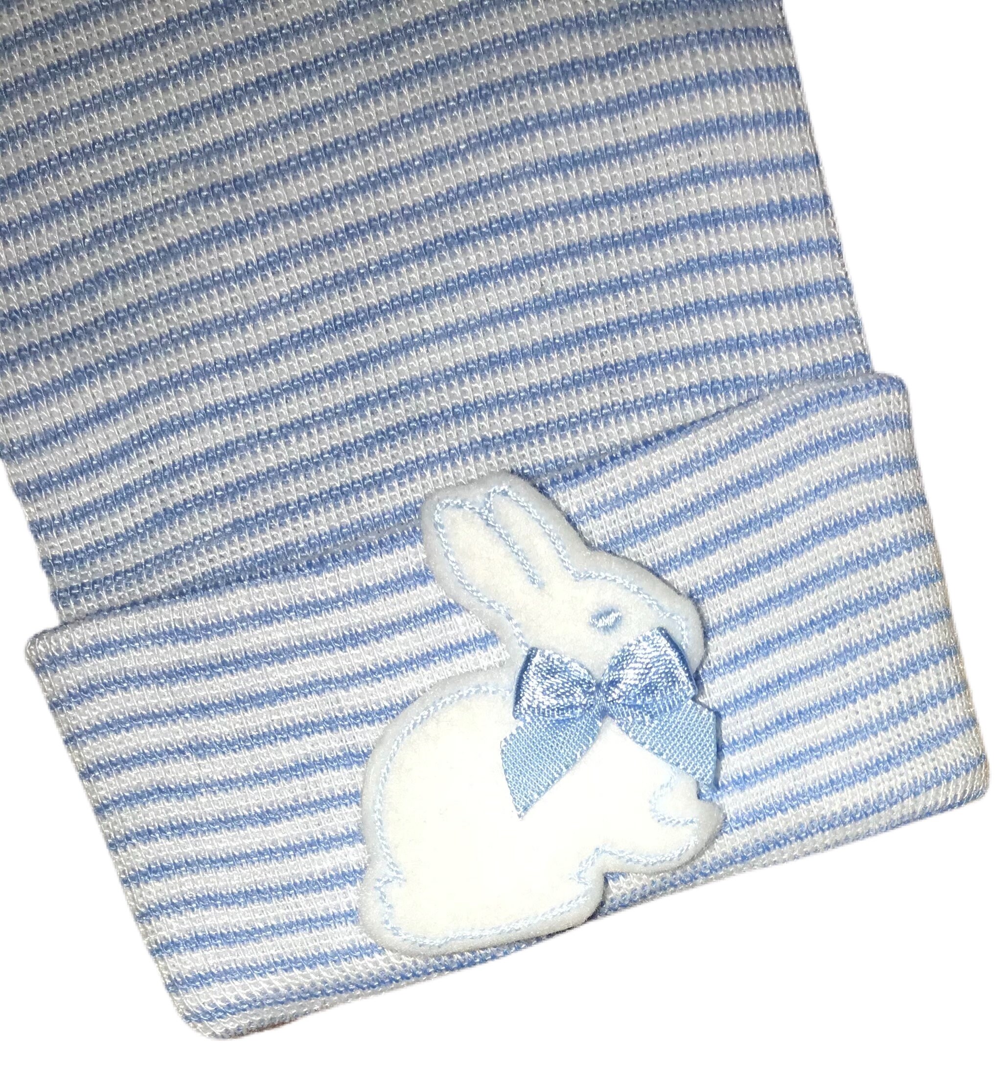This listing is for an adorable blue and white stripe or white newborn hospital hat with bunny applique and a blue bow for your baby!